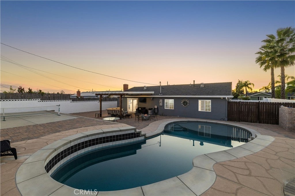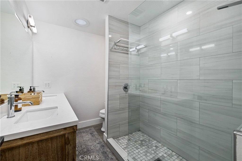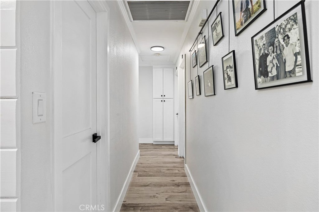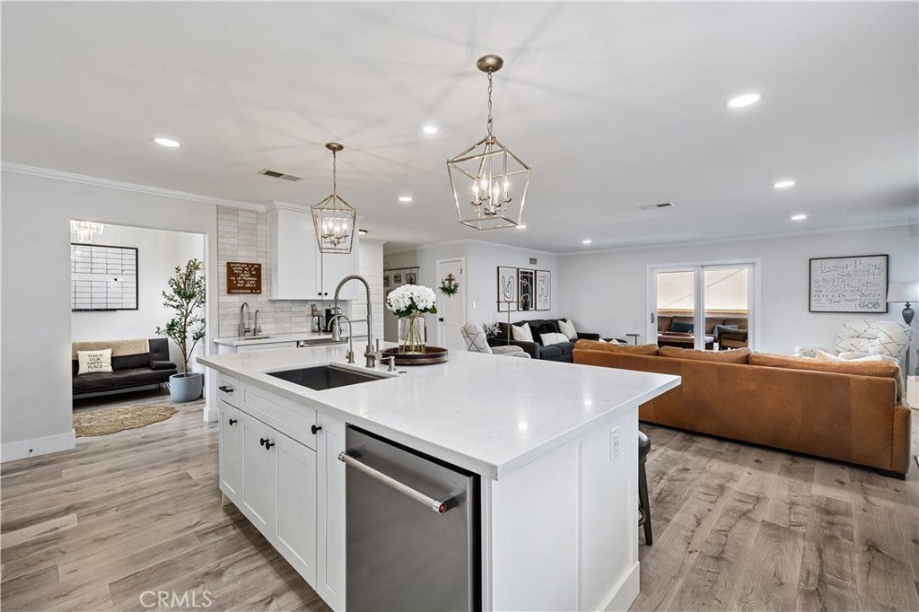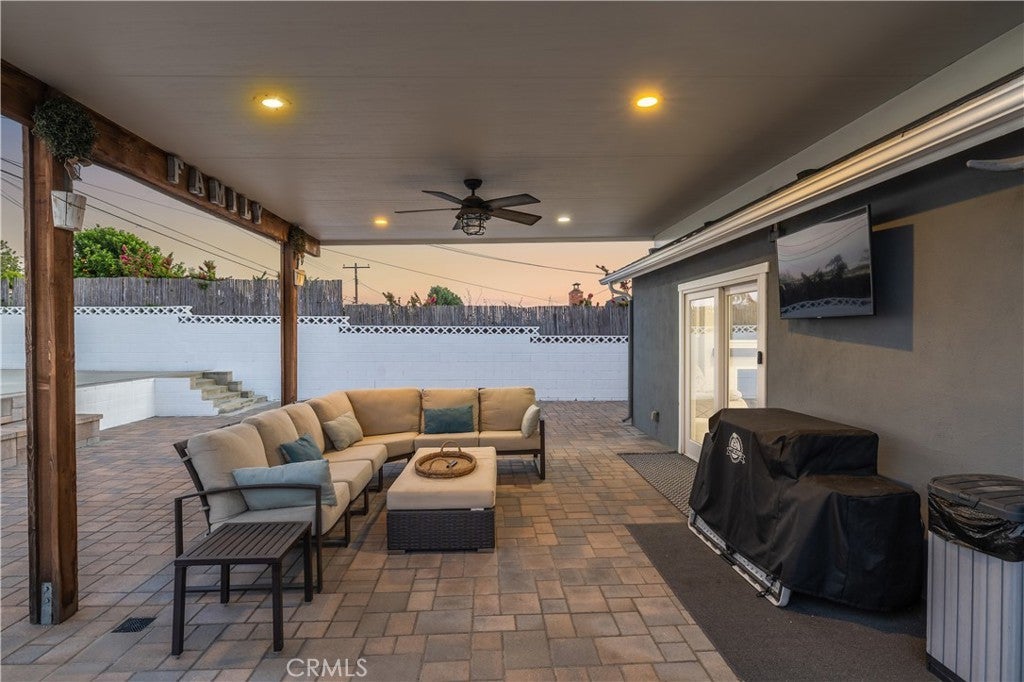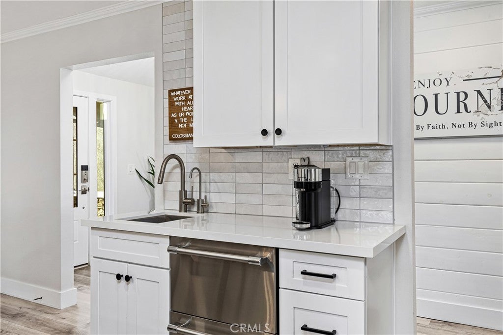 Positioned in a desirable Glendora foothill neighborhood just south of Sierra Madre and within walking distance to Sellers Elementary School, Goddard Middle School, and Glendora High School, this extensively remodeled single-level residence offers an open floor plan, refined finishes, and an expansive lot framed by scenic mountain views. The exterior blends stacked-stone accents and contrasting trim, while a concrete walkway leads to a fiberglass and glass-paneled front door with sidelight opening to a foyer highlighted by crown molding and a shiplap accent wall. The interior opens to a spacious great room anchored by a remodeled kitchen centered around a large island with seating and a sink. White shaker cabinetry, quartz countertops, and a full tile backsplash complement premium appliances including a Bosch gas cooktop, KitchenAid refrigerator, double ovens, and dishwasher. Additional highlights include a coffee bar with a Thermador refrigerator/freezer drawers and an instant hot water dispenser, pendant lighting above the island, recessed lighting, and cabinetry for storage. The kitchen flows seamlessly into the living area where a fireplace with a horizontal mantel creates a focal point and sliding glass doors open to the backyard. The primary suite features recessed lighting and a large window bringing in natural light. A shiplap accent wall adds architectural detail while the en-suite bath includes a dual-sink quartz vanity, framed mirrors, globe lighting, and a glass-enclosed shower with full-height tile and frameless enclosure. A spacious walk-in closet completes the suite. Two additional bedrooms offer windows overlooking the backyard and surrounding foothills, while the hall bathroom includes a dual-sink quartz vanity and glass-enclosed tile shower. A dedicated laundry room provides cabinetry and a utility sink. The backyard is designed for both relaxation and recreation, featuring expansive paver decking surrounding a pebble-finish pool with elevated backsplash, concrete coping, Baja shelf, and three umbrella ports, perfect for entertaining. A covered patio with wood post-and-beam supports and an Alumawood roof provides shaded outdoor living with recessed lighting and a ceiling fan. Multiple terraced areas expand the outdoor space, including an upper sport court ideal for pickleball or basketball. Additional features include gated RV parking with a 240V plug and sewer cleanout, upgraded electrical panel, updated HVAC system, and a 30-year roof.