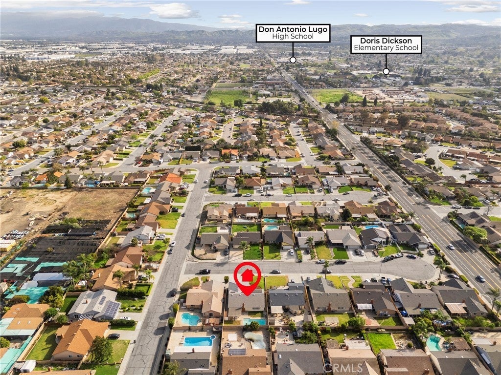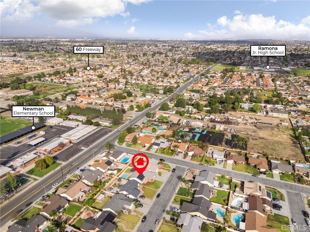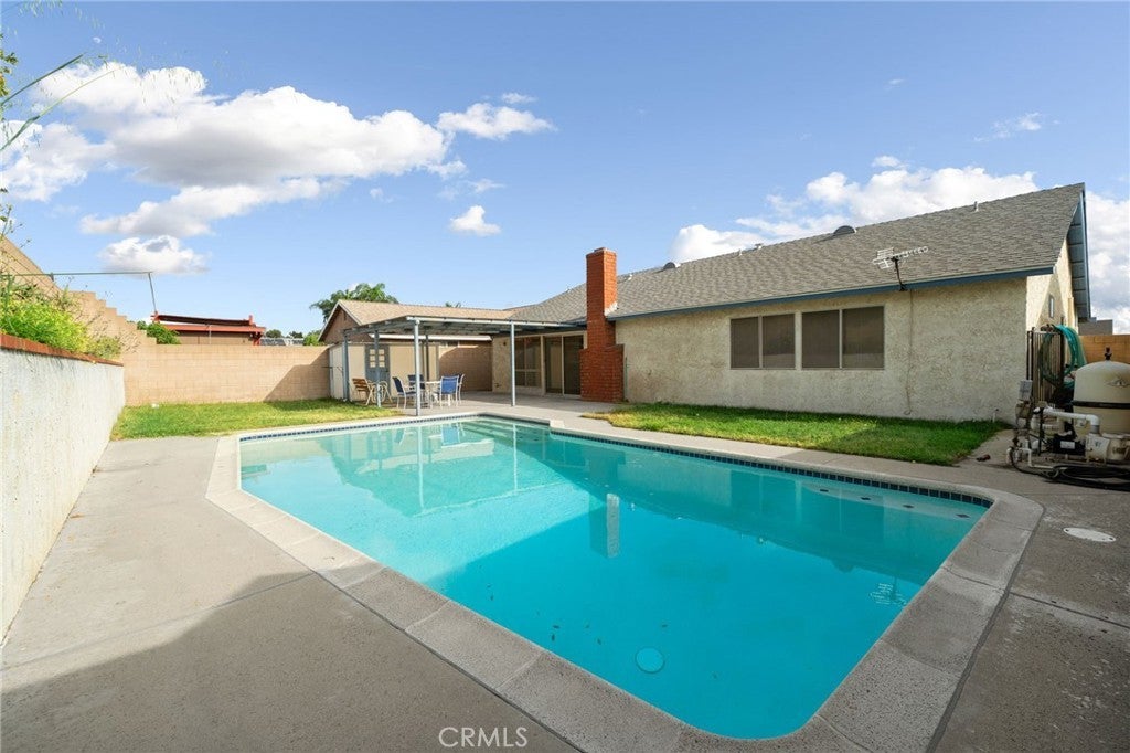 Welcome to your new poolside retreat in the heart of Chino—tucked away on a quiet cul-de-sac and designed for easy, comfortable living. Step inside to a bright, open foyer that leads into a spacious family room with soaring ceilings and an airy, welcoming vibe. The layout flows effortlessly into the kitchen, featuring warm oak cabinets, white tile countertops, a breakfast bar, and stainless steel appliances—perfect for everything from quick mornings to hosting friends. Just off the kitchen, the living room offers a cozy brick fireplace and large windows that bring in natural light and frame views of the backyard and sparkling pool. It connects seamlessly to the dining area, creating a relaxed space for meals and gatherings. The primary suite is a peaceful escape with its own private bath and pool views right outside your window. The home is recorded as four bedrooms, but one pair has been combined into a spacious, flexible room with two closets—ideal as a second primary suite, home office, gym, or bonus space. Prefer the original layout? It can easily be converted back. You’ll also enjoy energy-saving solar panels, a two-car garage with direct access, and convenient attic storage with built-in stair access. Out back, your private oasis awaits—featuring a patio and a beautiful pool, ready for sunny afternoons and weekend get-togethers. This is the kind of home that makes everyday living feel like a getaway—don’t miss your chance to make it yours.