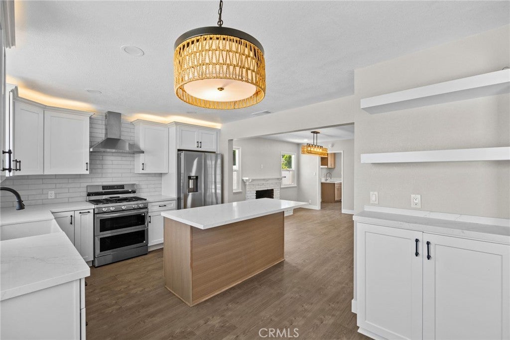BACK ON THE MARKET!! Step into this freshly remodeled single-level home, where every detail has been updated for comfort, style, and function. Inside, the open layout is bright and welcoming with high ceilings, LVP flooring, and recessed LED lighting throughout. The living and dining areas each feature their own fireplace, creating cozy spots to relax or gather. The kitchen shines with quartz countertops, shaker cabinets with remote-controlled uplighting, a subway tile backsplash, and stainless steel appliances. Whether you're prepping meals or entertaining, this space is both beautiful and practical. Down the hall are 3 bedrooms and 2 updated bathrooms. The hall bath offers a walk-in shower, while the second bathroom includes a tub/shower combo and dual vanities. The dedicated laundry room adds convenience with built-in cabinets and a utility sink. A large enclosed patio with ceiling fans gives you bonus space for a gym, playroom, or lounge area. Outside, the covered patio opens to a backyard built for entertaining or quiet mornings. The pool features a newer heater, pump, and filter, making it swim-ready year-round. A block wall covered in stucco and paint adds privacy and a clean finish, along with new gates on both sides of the house. The 2-car detached garage, long driveway, and gated side area offer extra parking—including space for a small RV or boat. Major systems are taken care of, including a new roof, central HVAC, and a newly insulated attic. Located on an 8,056 sq ft lot, this home is near top-rated schools, parks, and shopping, with easy access to the 22, 55, and 5 freeways. It’s a quiet street with neighborhood charm and commuter convenience. Move-in ready and made for real life—schedule your showing today.