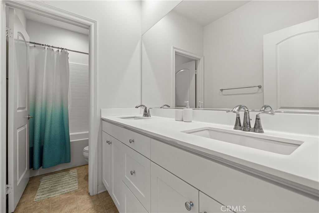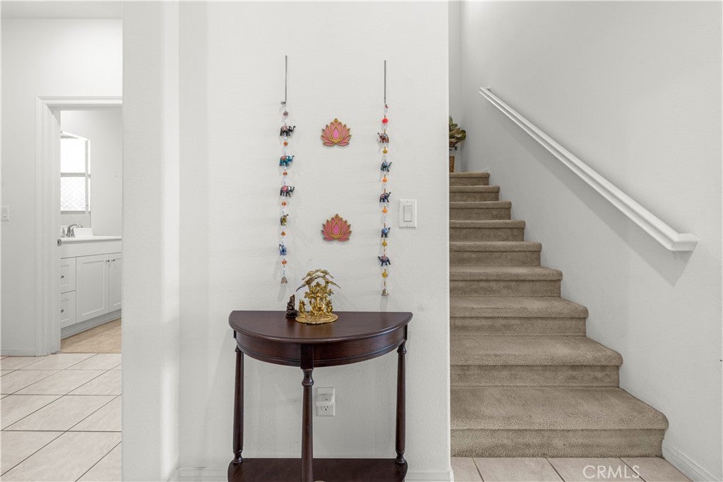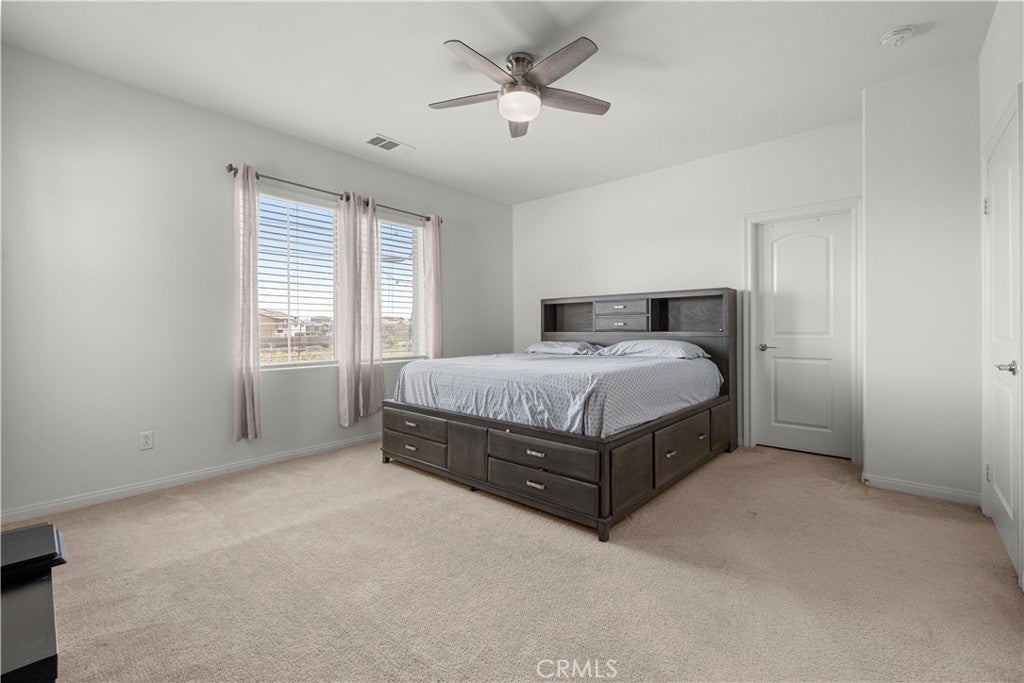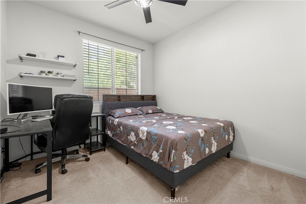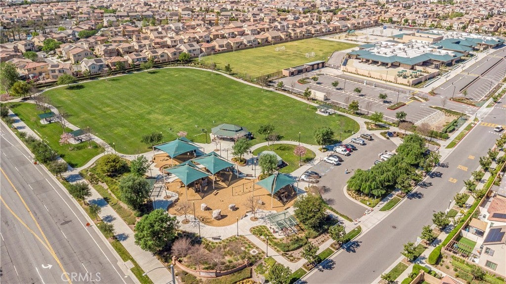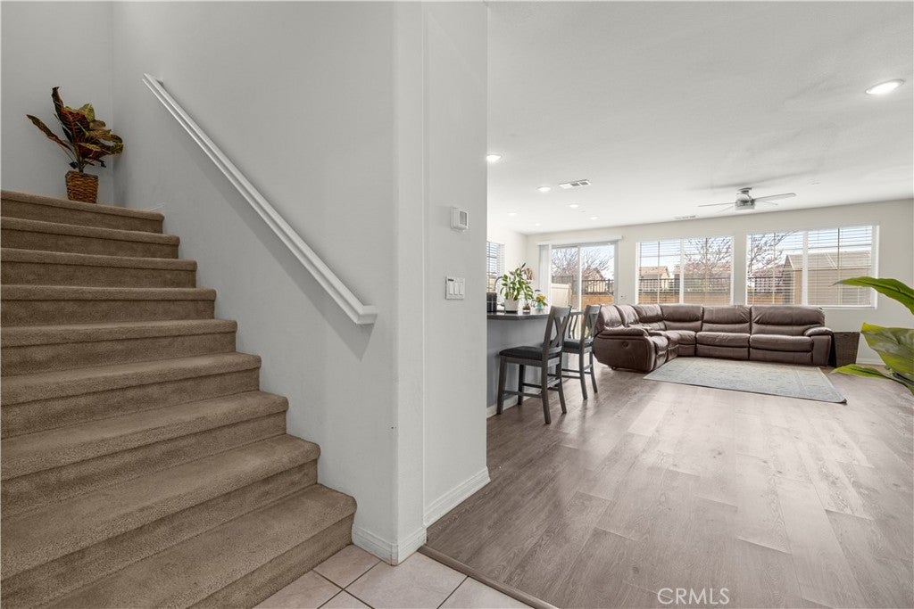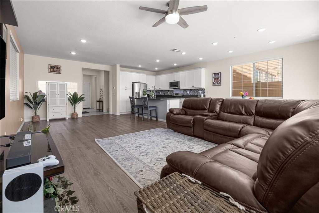Welcome to 4961 Monarch Place, one of the most desirable homes in the Park Place master planned community in Ontario Ranch. This beautifully maintained residence offers 4 bedrooms and 3 bathrooms with approximately 2,299 square feet of bright and open living space. The spacious great room and dining area create an ideal setting for entertaining, while the gourmet kitchen features timeless white cabinetry, a vintage inspired art deco tile backsplash, quartz countertops, stainless steel appliances, and an oversized island. The first floor includes a convenient bedroom and full bathroom, perfect for guests or multi-generational living. Upstairs offers a dedicated laundry room, a spacious loft ideal for a home office or flex space, and a private primary suite with a walk-in closet and an en suite bathroom featuring a soaking tub, separate shower, and dual vanities. Additional highlights include recessed lighting, custom interior paint, and wood flooring throughout. Residents enjoy resort-style amenities including a 14,500 square foot recreation center with a fitness center, movie theater, and library, along with sport courts, dog park, pool, and spa. Conveniently located near freeways, schools, shopping, and dining.