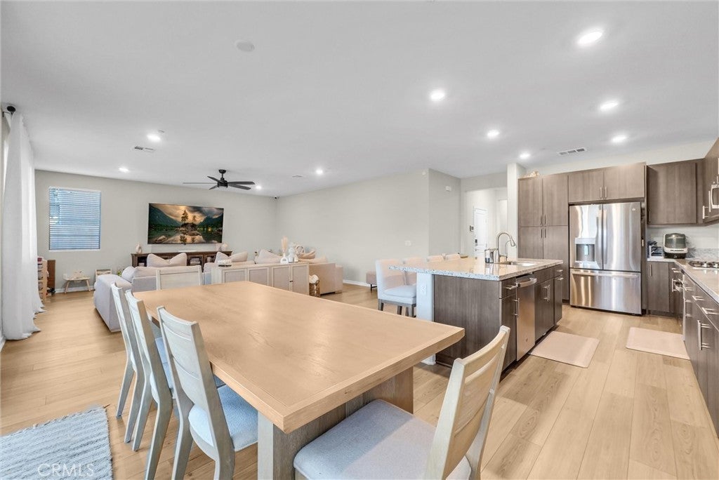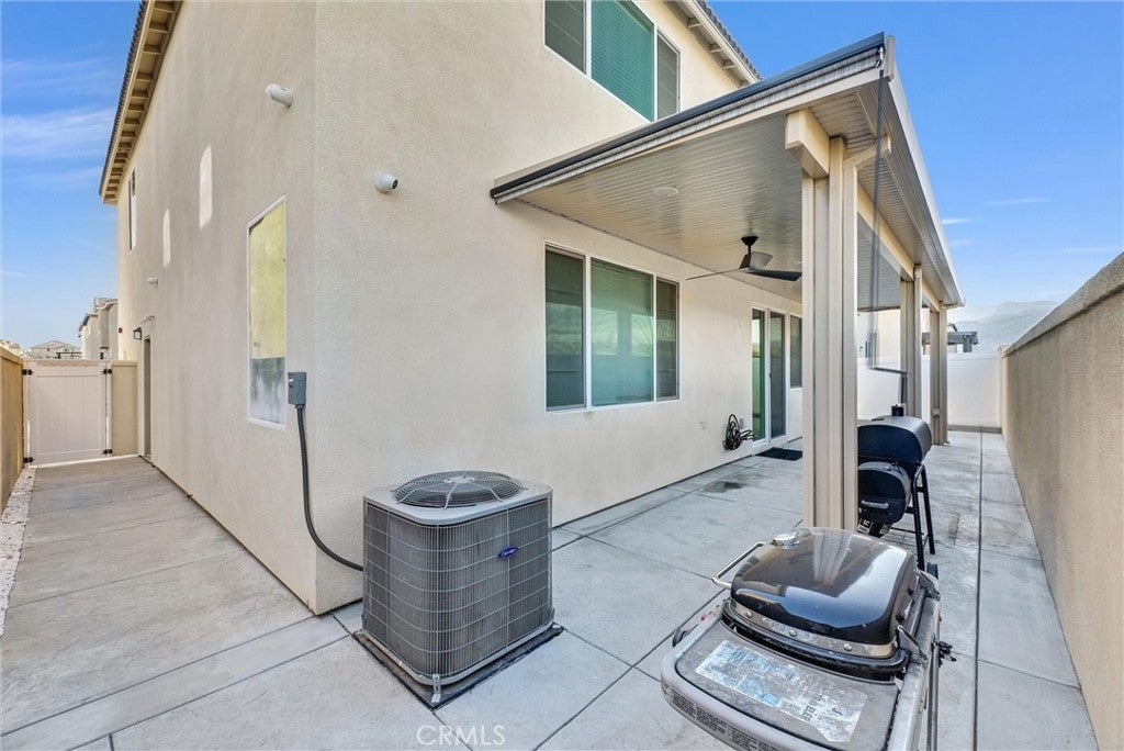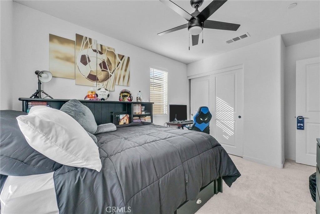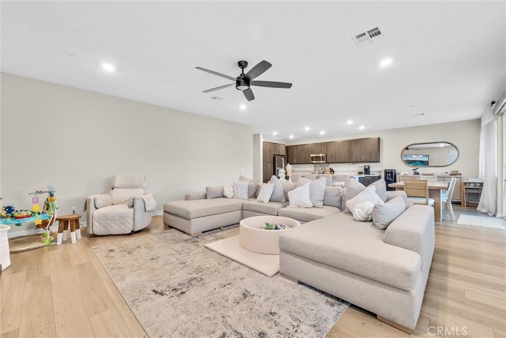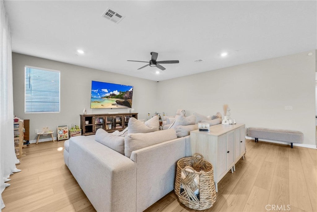 Located in the desirable River Ranch community of Rialto, this well-maintained two-story home offers approximately 2,700 square feet of living space with 4 bedrooms and 3 bathrooms, including a main-level bedroom and full bath. The open-concept layout connects the kitchen, dining area, and living space, ideal for both everyday living and entertaining. The kitchen features a center island, quartz countertops, and modern appliances. The property includes numerous upgrades throughout. The front yard features an extended driveway, artificial turf, enhanced landscaping, and expanded entry stairs. The backyard is designed for outdoor enjoyment with landscaping, a covered patio, fully electric patio cover, and lighting throughout. The garage has been upgraded with epoxy flooring. Upstairs includes a versatile loft, additional bedrooms, and a spacious primary suite with en-suite bathroom and walk-in closet. Additional features include an upstairs laundry room, recessed lighting, central heating and air, and a leased solar energy system. Leased solar system in place to support energy efficiency; buyer to assume lease. The home is situated on a low-maintenance lot within a planned community offering amenities such as a pool, spa, parks, and recreational areas. Conveniently located near shopping, dining, and with easy access to major freeways.