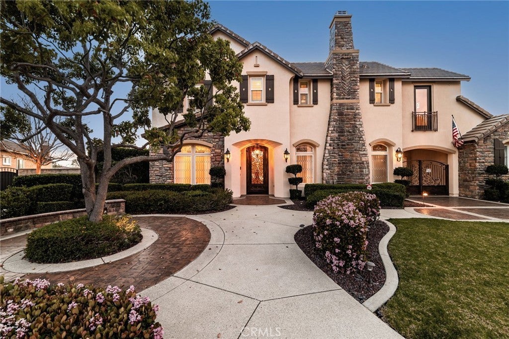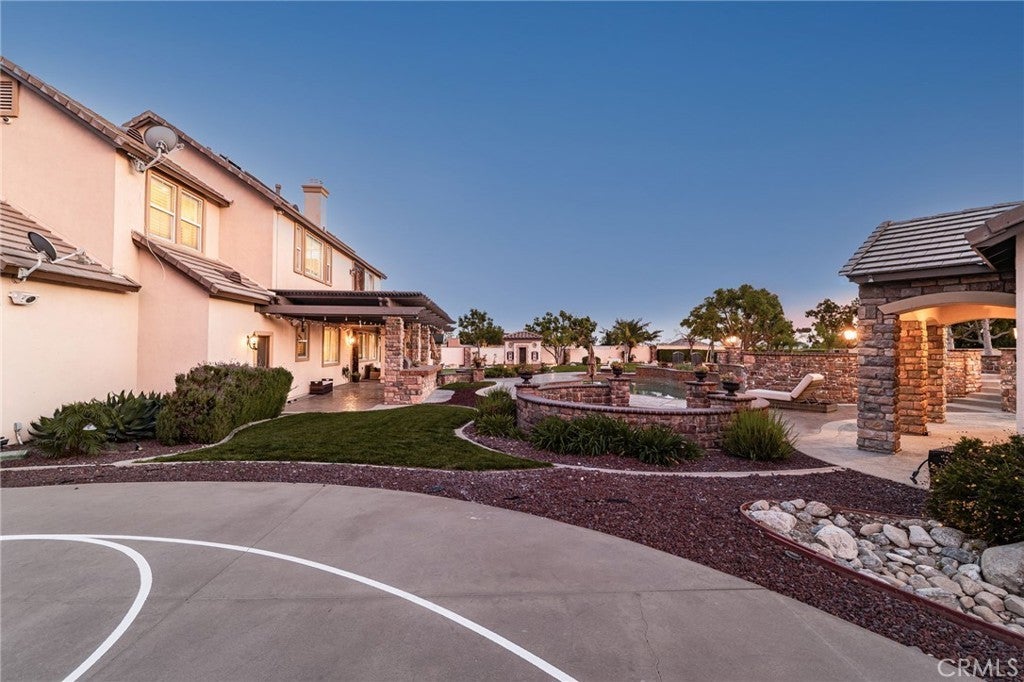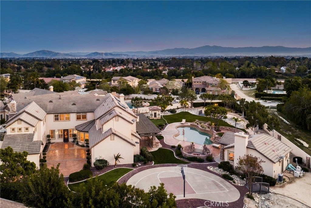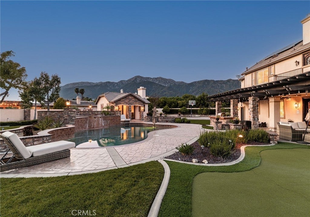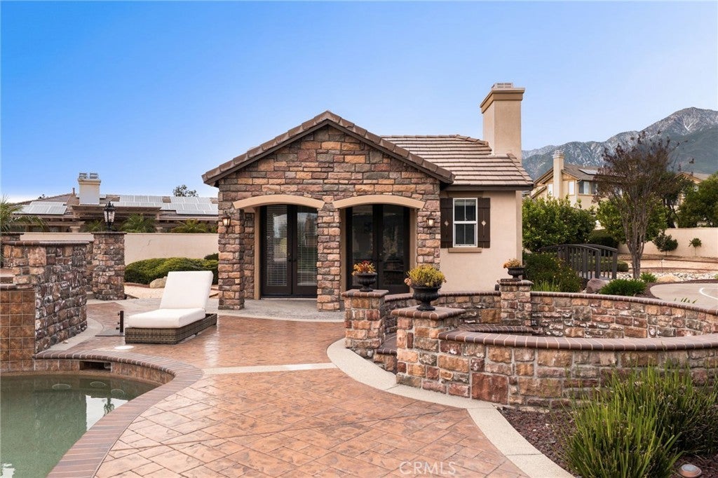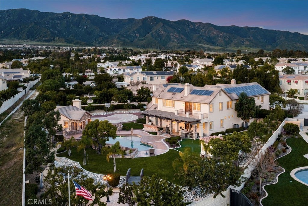 Welcome to an extraordinary estate in the prestigious Carriage Estates community of Rancho Cucamonga, set on nearly one acre of beautifully curated grounds and located within one of the city’s most highly sought-after, top-rated school districts. Spanning approximately 6,000 square feet, this exceptional residence offers six spacious bedrooms and six and a half bathrooms, with every bedroom thoughtfully designed as a private en-suite—perfect for elevated comfort and multigenerational living. The home is further enhanced by owned, free and clear solar, delivering long-term energy efficiency and cost savings. From the moment you arrive, the home makes a lasting impression with a gated auto courtyard, a four-car garage, and a stunning stained and stamped concrete driveway. Inside, a grand foyer opens to an elegant formal living room and a refined executive office or retreat, setting the tone for the sophistication found throughout. The heart of the home is a beautifully updated kitchen featuring premium finishes, seamlessly connected to a warm and inviting great room and breakfast nook. A butler’s pantry leads to the formal dining room, creating an ideal layout for both everyday living and upscale entertaining. A private downstairs bedroom with its own en-suite bath further enhances the home’s versatility. Upstairs, the expansive primary suite is a true sanctuary, complete with a private retreat, balcony showcasing breathtaking mountain and city light views, dual walk-in closets, and a spa-inspired bathroom featuring a soaking tub, oversized shower, dual vanities with bidet toilets, and an additional flex space ideal for a gym, lounge, or secure room. Step outside to your own private resort. The backyard is designed for unforgettable gatherings, featuring a sparkling pool, sunken fire pit, putting green, basketball court, and a charming children’s playhouse—all surrounded by mature landscaping that offers both beauty and privacy. A detached ADU/pool house provides exceptional flexibility, perfect for guests, extended family, or potential income opportunities. This is a rare opportunity to own a truly grand estate that effortlessly combines luxury, functionality, and lifestyle—offering every space and amenity a modern family could desire.