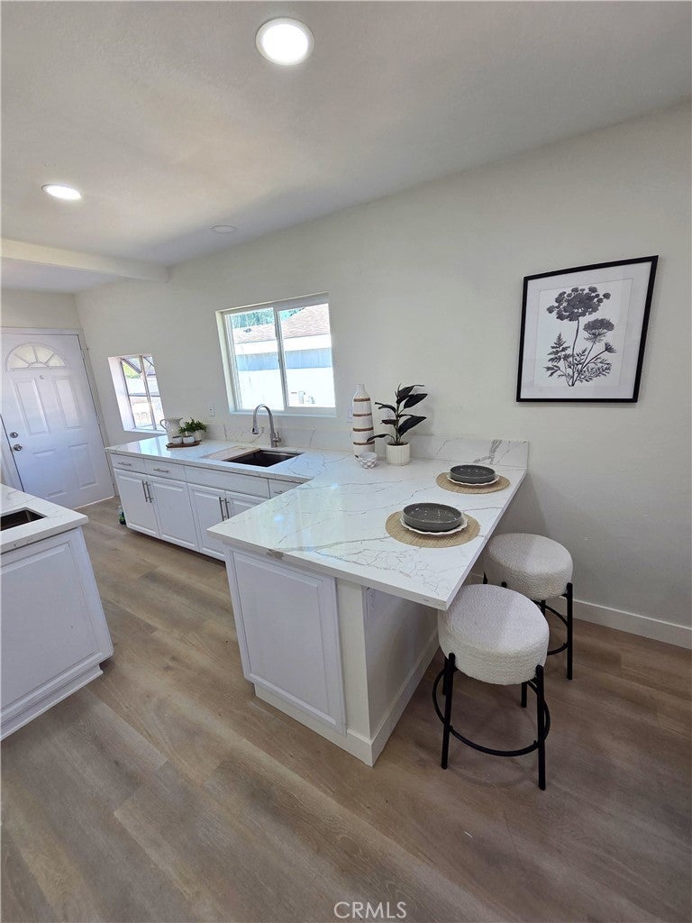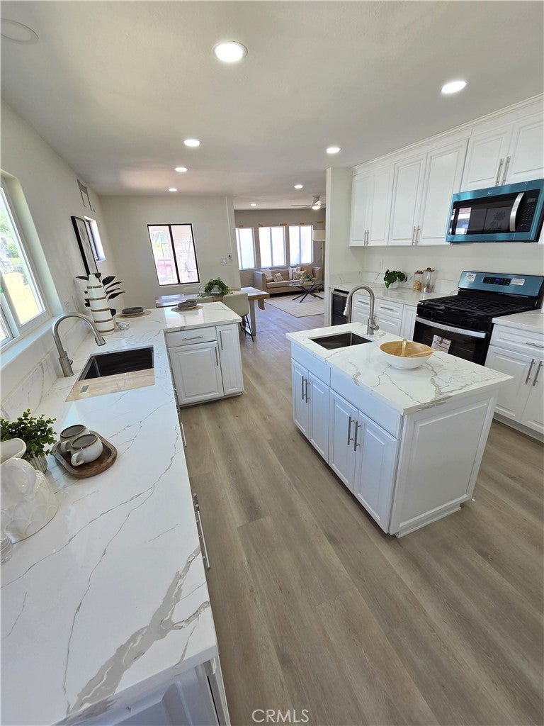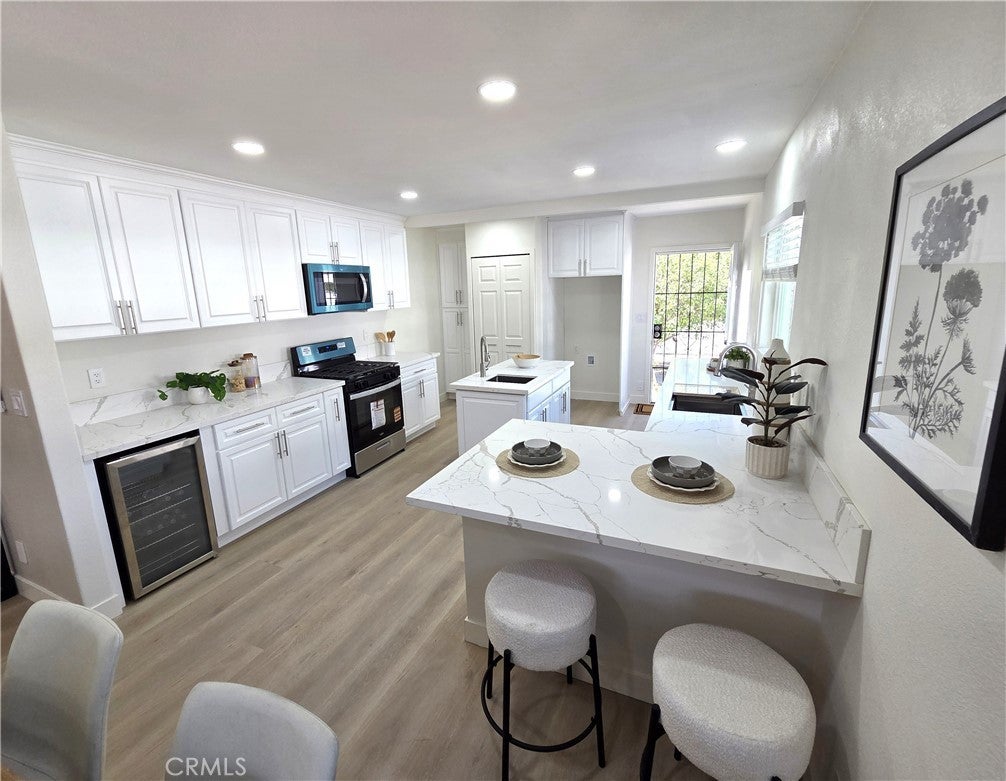 REMODELED with style, this 3-BED, 2-BATH is gorgeous! Huge kitchen w/NEW quartz countertops, stainless steel sinks (2), stove, microwave, pull-out spice cabinet and pantry! Built-in mini-fridge, new digital-temp faucet, built-in cutting board/drying rack, utility sink in island; come see it all! Newly-textured walls, custom-painted throughout, new recessed LED lighting, dimmers, ceiling fans w/remotes, new doors, casings, baseboards, new blinds, premium vinyl laminate, gorgeous Master Bath & walk-in closet, three (3) entry gates, motorized access for garage, new plumbing for bathrooms and laundry, NEW 200-amp Panel, 24-SEER Mini-Split cooling AND 30-yr Cool Roof! Block-wall perimeter w/ironworks, fruit trees, cemented back yard for hosting, oversized garage area for ADU future (separate access; set-up is perfect!)...all in a wonderful neighborhood with lovely mountain views. IT'S BEAUTIFUL; COME SEE FOR YOURSELF!
