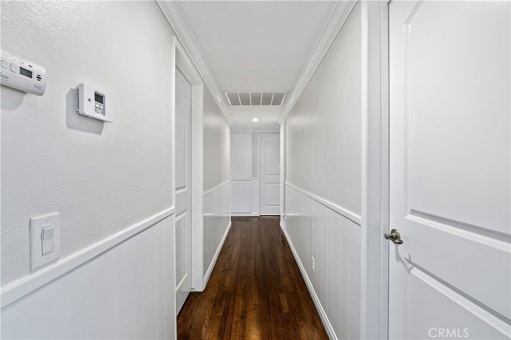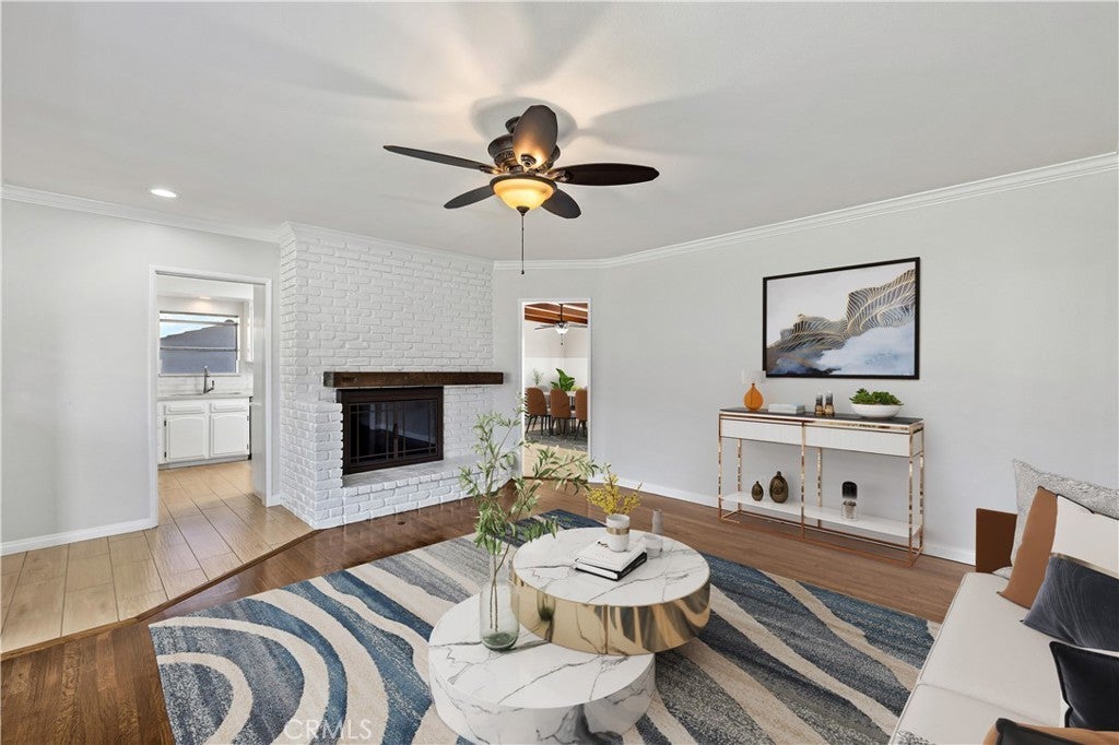 A classic California ranch positioned in a quiet foothill neighborhood in North Glendora. This single-story home presents at the street with a Spanish-style tile roof, brick and wood siding, mature sago palms, and a brick-ribbon driveway leading through a black gated entry to the rear detached two-car garage. The covered brick front porch frames a leaded geometric glass door, opening to wide-plank, wood-patterned tile flooring and crown molding throughout. The living room features refinished original hardwood floors, a floor-to-ceiling white-painted brick fireplace with a thick wood beam mantel, and connects to a glass-enclosed sitting room with three walls of windows framing the front lawn and mountain views. The dining room showcases an exposed wood beam vaulted ceiling, white wainscoting, recessed lighting, and a sliding glass door leading to the rear patio. The kitchen is finished with white cabinetry, quartz countertops, and a subway tile backsplash, and stainless steel appliances including double wall oven, gas cooktop with range hood, dishwasher, a raised tray ceiling with LED lighting, and a peninsula with bar seating. The primary suite offers hardwood floors and an en suite bathroom with a gray shaker double vanity, white quartz countertop, and a frameless glass walk-in shower finished in marble-look subway tile with a mosaic accent border. Additional bedrooms are carpeted and include mirrored closet doors, ceiling fans, and crown molding. The hall bathroom features a vessel sink vanity and a tub and shower combination with a tan tile surround. A dedicated laundry room connects to the rear grounds. The backyard offers a flat lawn, a covered patio with concrete decking and a brick border, brick planters, producing citrus trees, and block wall fencing. A brick paver patio extends from the covered back porch to a built-in brick fireplace and chimney, with an adjacent BBQ station creating a second area for entertaining.