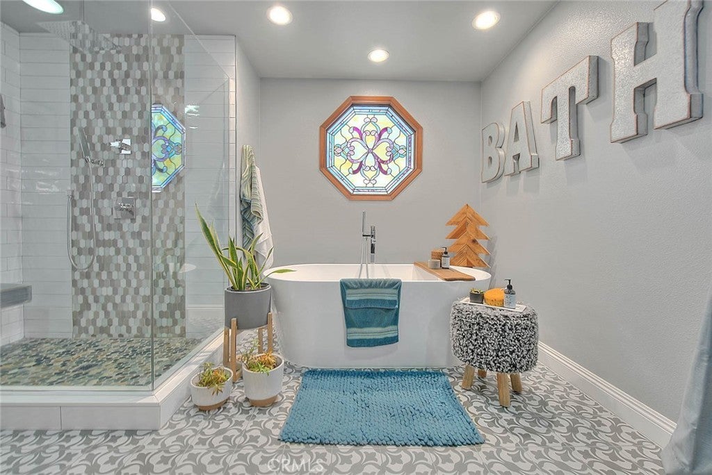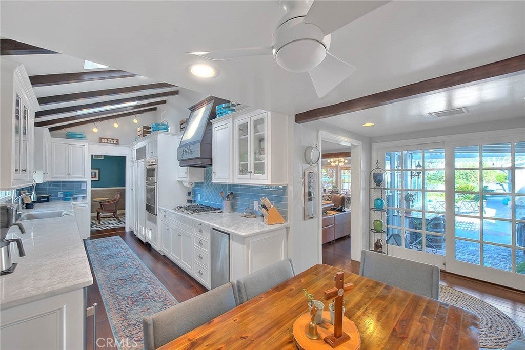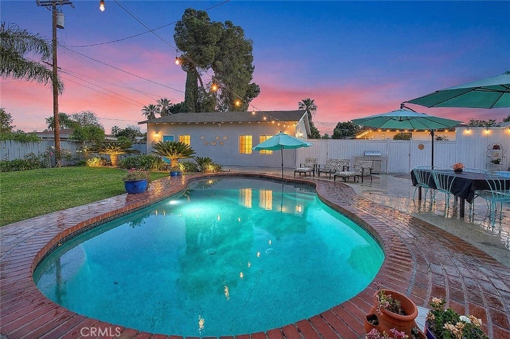 FABULOUS & WONDERFULLY upgraded SINGLE story home located on a sprawling 15,246 sq ft lot. (per tax roll) The amenities of this highly desirable property are many! There are 4 bedrooms including the primary & 3 bathrooms. Exterior features include RV parking, oversized garage w/pull through door, a very private backyard that is ideal for entertaining with inground pool, raised deck for outdoor dining, an expansive lawn area, mature trees, above ground spa, firepit & more! Interior has been remodeled throughout including a GORGEOUS kitchen done in light & bright white cabinetry with a skylight that brings in soft natural light, Carrera marble counters & dramatic blue glass subway tile backsplash. Stainless appliances including trash compactor, wine frig, oven, microwave, dishwasher & 5 burner cook top w/overhead hood. Built-in subzero refrigerator matches the cabinetry. Overhead beam accents add a designer touch to the kitchen. All bathrooms have been upgraded & the guest bathroom is done in a contemporary design showcasing a large walk-in shower, dramatic tile accent wall & contemporary light fixture that further enhances the décor. The smaller guest bathroom also features a beautiful tile design in the shower. There is a formal dining room as well as a generous space for casual informal dining right off the kitchen adjacent to the living room that could be used for a pool table or multi-purpose area. This space has built-in seating by the windows. There is also a breakfast nook with attractive accent wall design & overhead ceiling fan. 3 indoor areas to dine! An inviting fireplace with raised hearth, beautiful tile detailing & a custom mantel adorns the living room, a spacious and relaxed room to gather in. Tranquil primary suite is sizeable with faux beam ceiling accents, spacious walk-in closet & tastefully upgraded bathroom including double vanity with quartz counters, tile floor & beautiful walk-in shower w/gorgeous tile detailing. There is a separate soaking tub as well. This home features upgraded engineered wood plank flooring through almost the entire interior w/exception of bathrooms & one bedroom & den. One guest bedroom has an adjoining room currently used as a den. Other notables: Stained glass windows in many rooms, updated lighting fixtures, 2 AC units, crown molding, multiple decorative accent walls, reverse osmosis water system in the kitchen, barn door, convenient indoor laundry niche, an abundance of storage built-ins & more! A MUST see!
