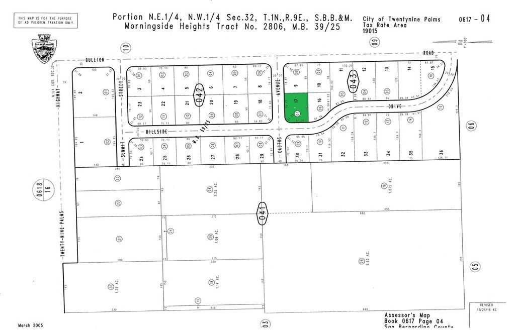 Discover an exceptional opportunity to own a prime corner lot in the heart of Twentynine Palms, located at the corner intersection of Hillside Ave and Cactus Drive. This vacant parcel, identified by APN# 0617043070000, offers a unique blend of convenience and natural beauty. Key Features: Ideal Location: Situated on a paved road, this lot provides easy access to nearby shopping centers and the main highway, ensuring all essential amenities are within close reach. Stunning Views: Embrace breathtaking mountain and desert vistas, offering a picturesque backdrop for your future home or investment property. Development Potential: With its strategic corner positioning and accessibility, this lot is primed for various development possibilities, whether you are envisioning a custom residence or a profitable investment project. Don't miss out on this rare chance to secure a piece of Twentynine Palms' vibrant landscape. Contact me today to explore the potential of this remarkable property and make an offer!!! GPS Coordinates: 34.133303, -116.063732