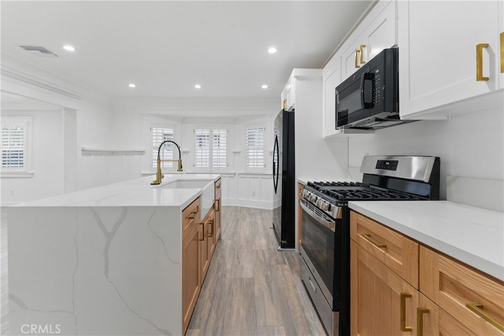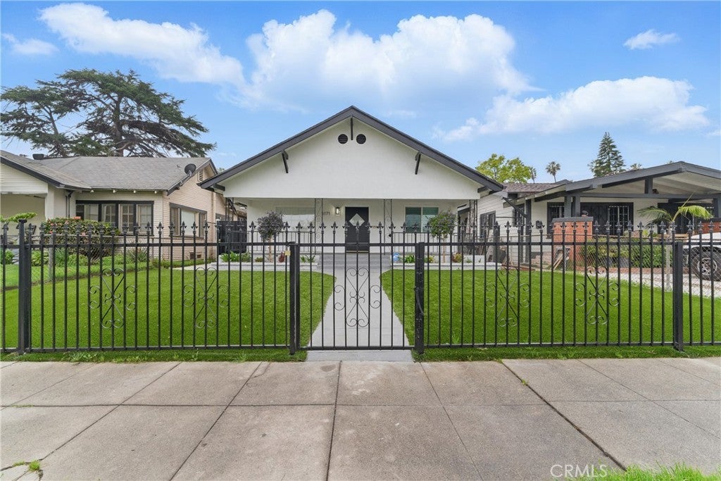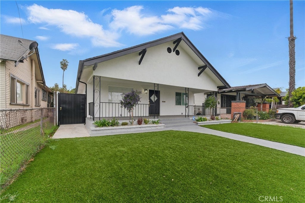 Welcome to this beautiful updated bungalow style home that sits on a tree lined street. The front of the home offers a gated entrance with an astro turf lawn paired with a freshly painted walkway and porch that is perfect to soak in the neighborhood views. Once you enter the home you are welcomed with original coffered ceilings, crown moldings, and wooden shutters throughout the kitchen and living room. This updated home is a blend of originality and contemporary living that offers 4 bedrooms, 2 bathrooms and a stackable laundry closet nook. The home flows seamlessly with an elegant updated kitchen that contains custom natural oak cabinets with an island, pantry, farmers sink, quartz countertops and brand new garbage disposal, microwave, stove and refrigerator. Each bedroom offers adequate space as well as custom shelving for all closets accompanied by sliding mirror doors and walk in style closets. The bathrooms are finished in an exquisite tile design accompanied by custom natural oak cabinets and matching brushed gold vanity and shower fixtures. This home is an absolute gem with a functional HVAC system and upgrades such as new electrical, plumbing, recessed lighting, drywall, laminate flooring, windows, washer dryer hookups, and much more! The backyard is very private with vinyl fencing, a brand new iron gate. There is also a freshly drywalled and painted detached storage that is accompanied with a fresh lawn and gravel parking area. The detached storage and accessible alley offers a great opportunity for an ADU and additional parking! Along with all the beautiful upgrades this home has to offer, this home also offers close proximity to USC, BMO Stadium, SoFi Stadium, the Forum, LAX, Leimert Park, West Adams, Santa Monica, Culver City, DTLA and much more!