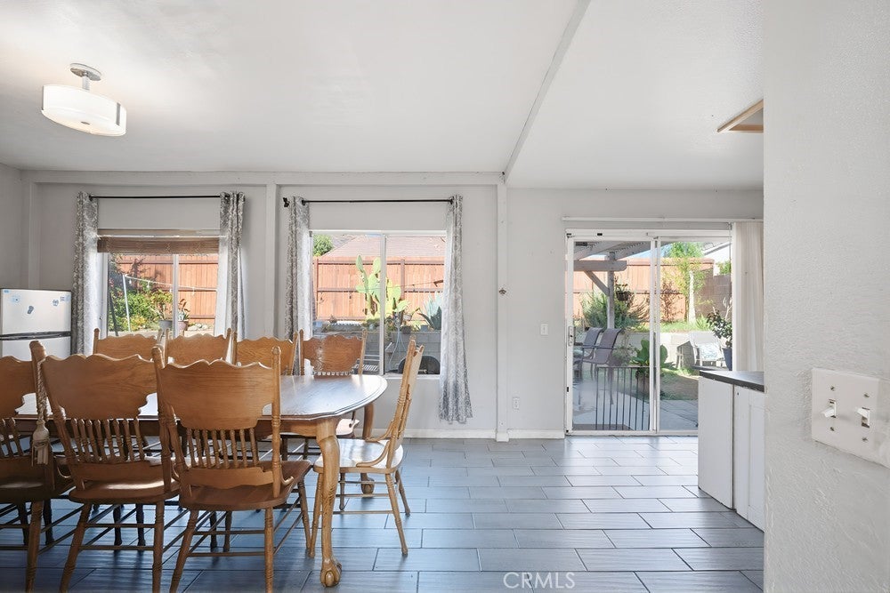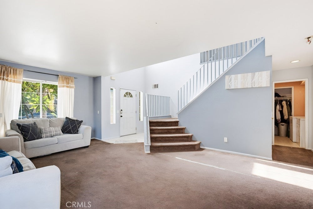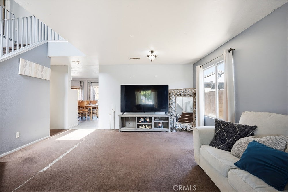 Located on a peaceful, tree-lined street, this Perris home sits in a serene neighborhood surrounded by mature landscaping and natural charm. The front exterior features lush greenery, a spacious driveway leading to a two-car garage, and a small front porch accented by a large window beside the entry. Inside, a welcoming foyer greets you with high ceilings that open to the upper level, setting a bright and airy tone. The staircase is positioned straight ahead, wrapping around with a classic banister. To the right, the living room offers a comfortable gathering space with multiple windows allowing soft natural light to fill the room. Off the living area, a short hallway leads to the laundry room, a half bath, and garage access for added convenience. Beyond the living area, the floor plan opens to a combined kitchen and dining space—ideal for everyday living and entertaining alike. The area is framed by large windows and a sliding glass door that leads to the backyard. Outside, enjoy a tranquil, garden-like setting with a small patio, lush landscaping, and plenty of room for relaxation or entertaining. Upstairs are 4 bedrooms, including a thoughtfully added fifth room that offers extra versatility for a guest room, home office, or play space. The primary suite features an en-suite bathroom with dual sinks, while another full bathroom conveniently serves the remaining bedrooms. Altogether, this home combines functionality and charm, offering comfortable living spaces inside and a peaceful, nature-filled backyard retreat outside.