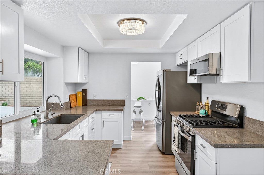 Nestled on a quiet cul-de-sac in Pomona, this beautifully updated 4 bedroom, 3 bathroom home strikes the perfect balance of modern comfort and timeless charm. Located within the gated Lexington Manor community, this residence greets you with a thoughtfully landscaped front yard, offering a sense of privacy and serenity. Inside, soaring ceilings, recessed lighting, and new flooring enhance the light-filled open layout, while a reimagined fireplace serves as a striking focal point in the spacious living room. The upgraded kitchen boasts sleek countertops, newer cabinetry, and stainless steel appliances, flowing seamlessly into the dining and living areas - ideal for entertaining or everyday living. Upstairs, the primary suite provides a peaceful retreat with an updated ensuite bathroom complete with a dual-sink vanity and generous walk-in closet. Completing the interior, three additional bedrooms offer flexibility for guests or home office, and a new HVAC system ensures year-round comfort. Outside, the private backyard extends the living space - perfect for entertaining, dining al fresco, or relaxing in the sun. A detached storage shed adds convenience, while the spacious garage provides versatility as a gym, studio, or creative flex space. Ideally located just blocks from Rio Rancho Town Center, premier shopping and dining, and near top-rated schools and universities, 1145 Neva Lane delivers gated serenity and contemporary California living in a highly desirable community.