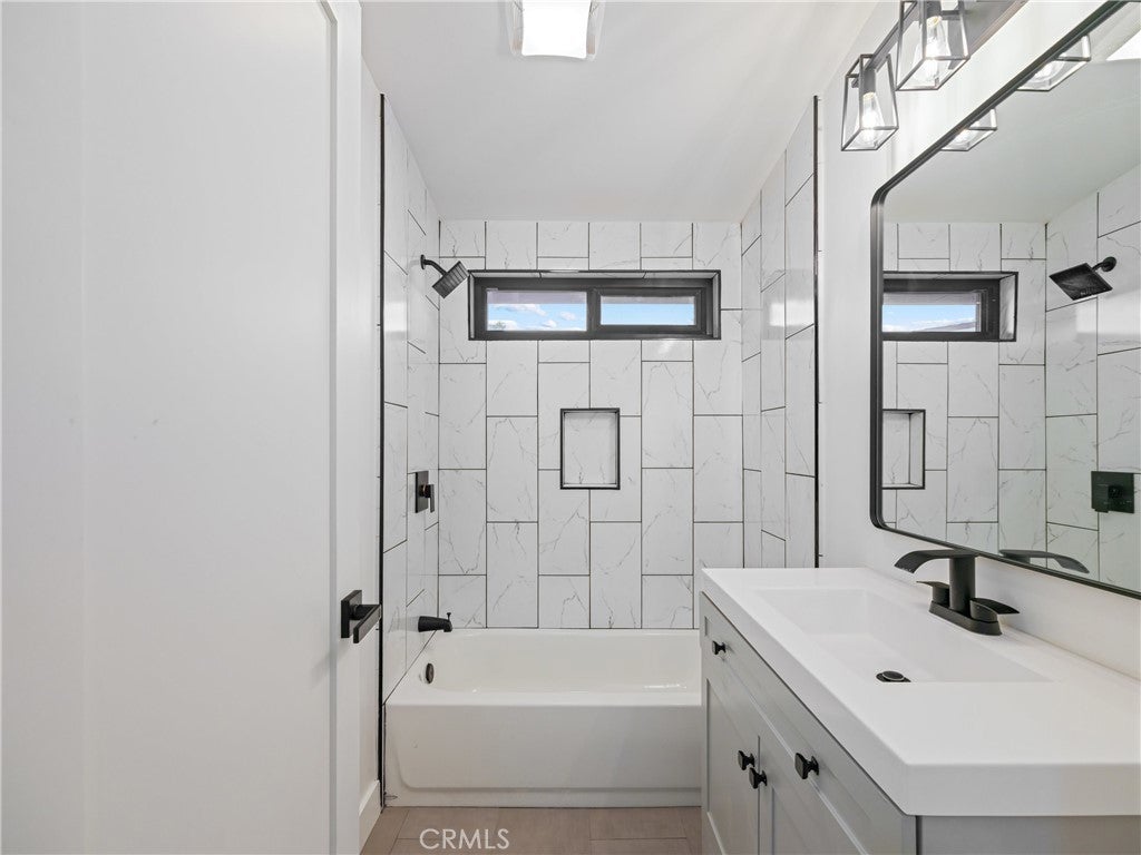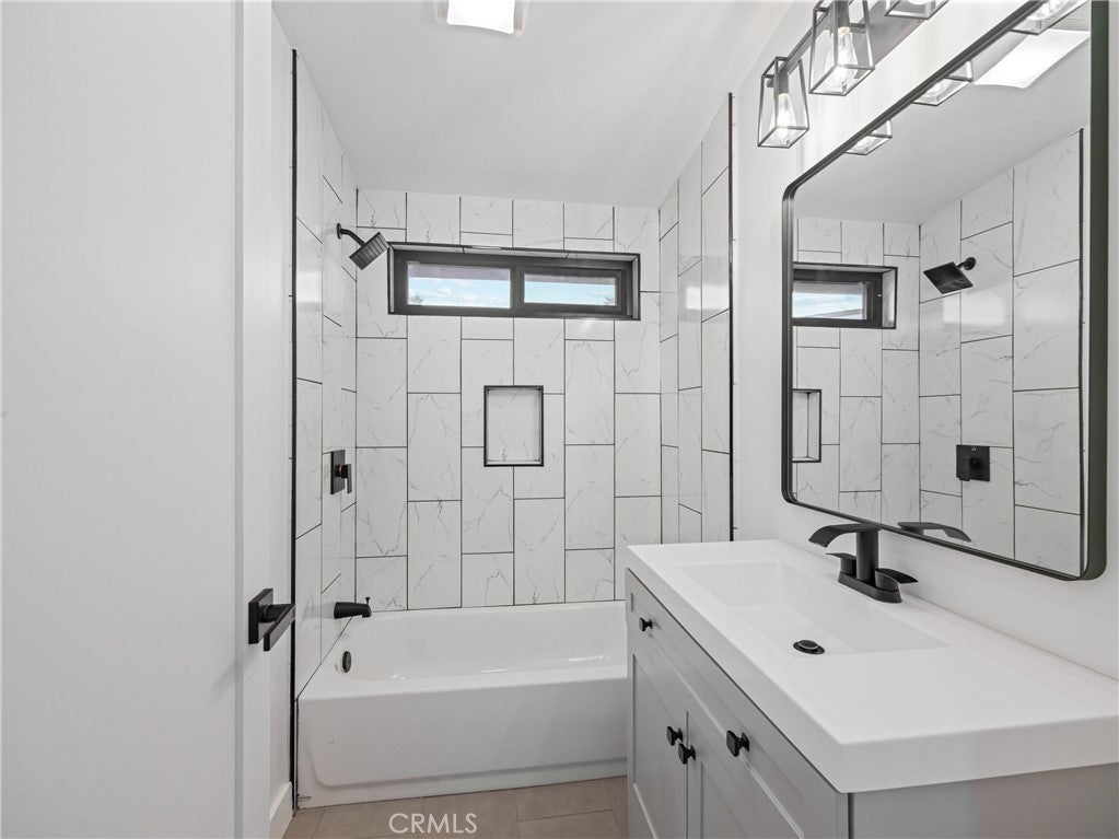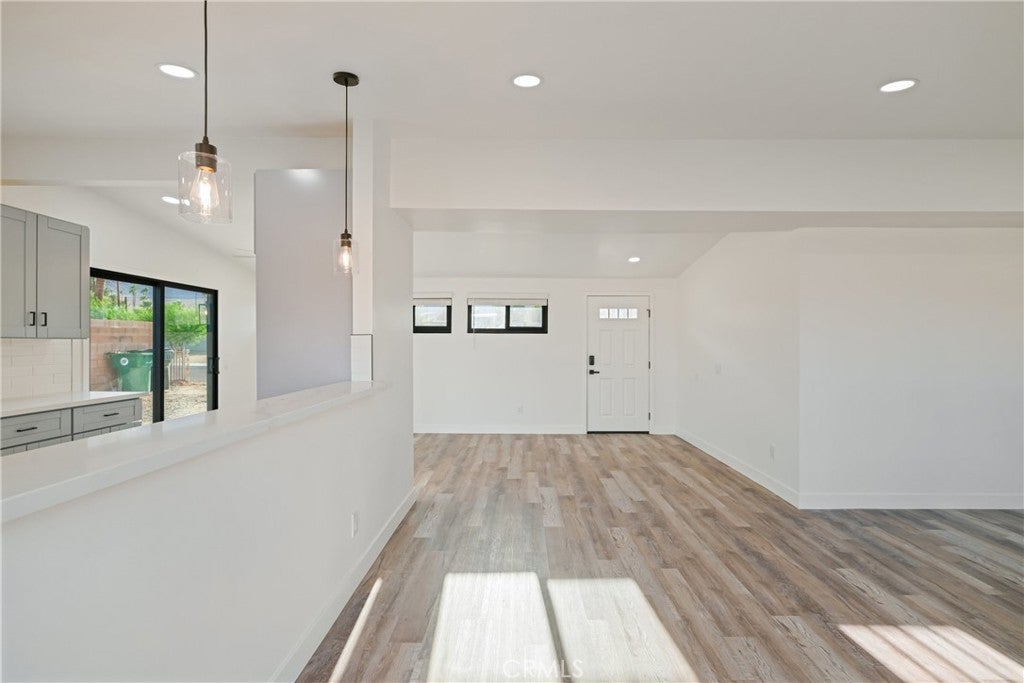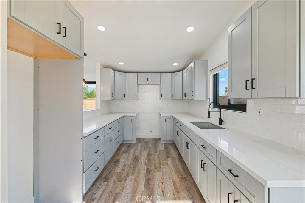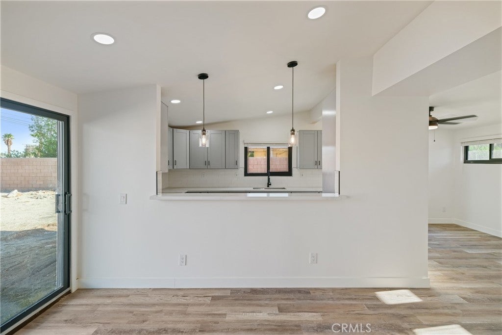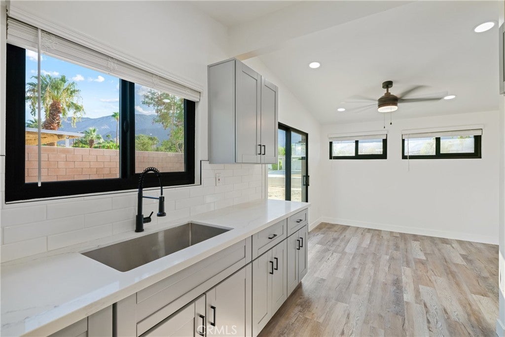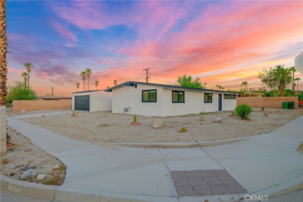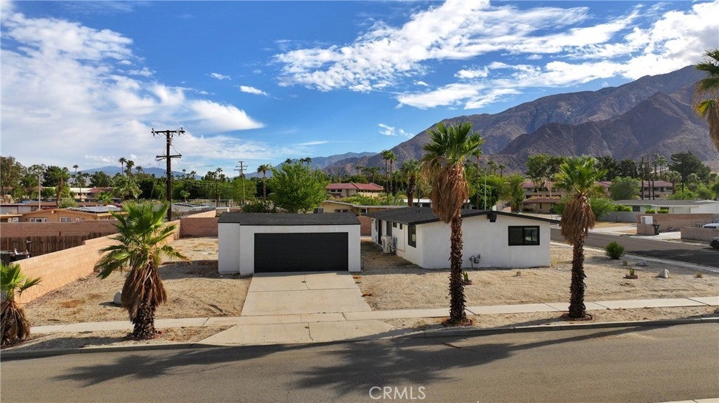 Welcome to Gateway Estates—NO HOA, a rarity in nearby communities—where this corner-lot renovation takes in the San Jacinto backdrop and leans into easy desert living. Inside, black-frame dual-pane vinyl windows and recessed LED lighting keep the spaces bright and calm. The kitchen layers shaker cabinetry, quartz slab counters, and subway tile, with a long serving bar that opens to the living area for effortless gatherings. Two refreshed baths showcase large-format tile and clean, modern fixtures; durable LVP ties the rooms together with a cohesive look. Comfort is handled by a whisper-quiet ductless mini-split that heats and cools efficiently, and an upgraded electrical panel adds everyday confidence. Outside, the oversized, mostly walled yard is ready for your vision—pool, spa, fire pit, or water-wise landscape (buyer to verify). The detached garage includes washer/dryer hookups; it is a garage (not an ADU), though ADU potential may be explored with the City. North-end location close to Uptown/Downtown Palm Springs, the Aerial Tramway, dining, and shops. The City regulates short-term rentals by neighborhood; buyers should confirm current eligibility and requirements for this address. Buyer to verify all permits, square footage, lot size, and ADU feasibility.