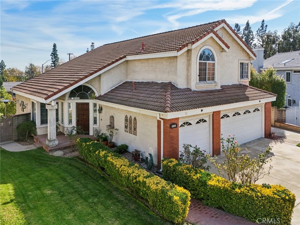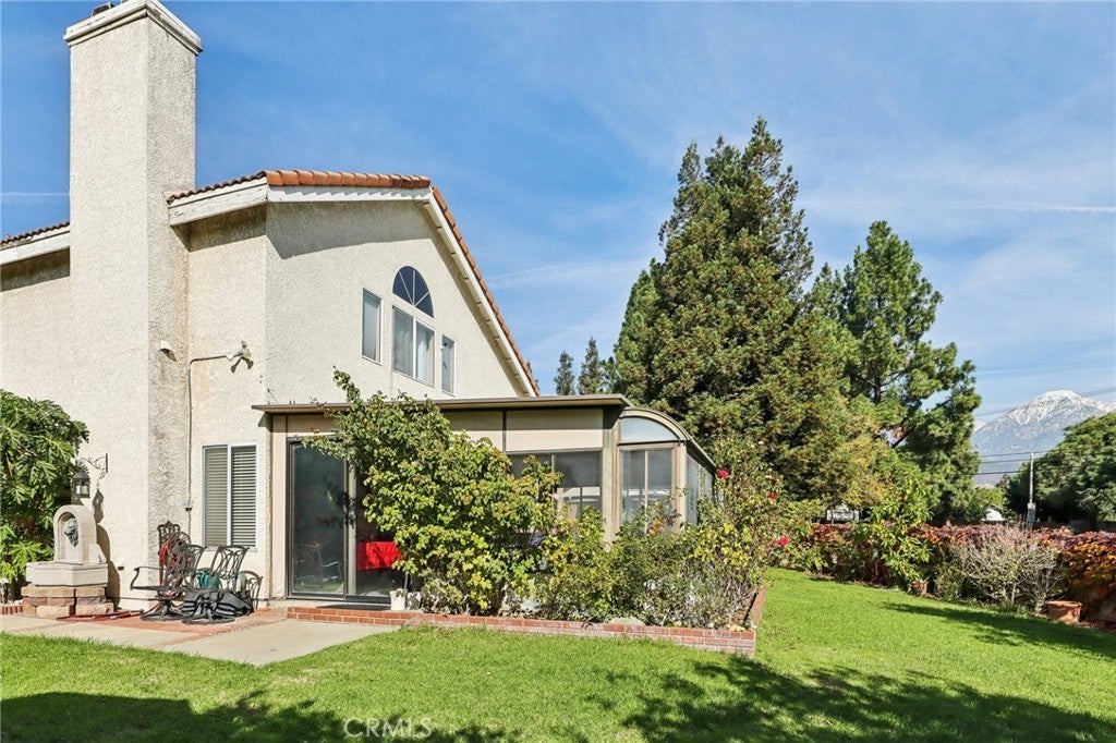 Beautiful 2-Story Home in North Upland Located on a Quiet Cul-de-Sac. This spacious 4-bedroom, 3-bath home offers an open and bright floor plan with high ceilings throughout the formal living and dining rooms. The main level features ceramic tile flooring, a convenient downstairs bedroom, and a 3/4 bath—perfect for guests or extended family. The kitchen offers tile counters, a 4-burner range, Adjacent family room includes a fireplace and double doors leading to an enclosed patio that leads to the beautifully landscaped backyard. Upstairs features 3 bedrooms and 2 bathrooms, including a large master suite with double-door entry, high ceilings, a private seating area with fireplace, two closets (one walk-in), and a spacious master bath with double sinks, separate bathtub, walk-in shower, and skylight. The backyard is a highlight, offering views of the snowcapped mountains and a variety of mature fruit trees including papaya, persimmon, two avocado trees, guava, lime, lemon, apple, and grapefruit. Located in a desirable neighborhood close to parks, schools, and shopping. This home provides plenty of room to grow with flexible living areas, a desirable floor plan, and a vibrant backyard oasis. A great opportunity to personalize and make your own in a prime Upland community.