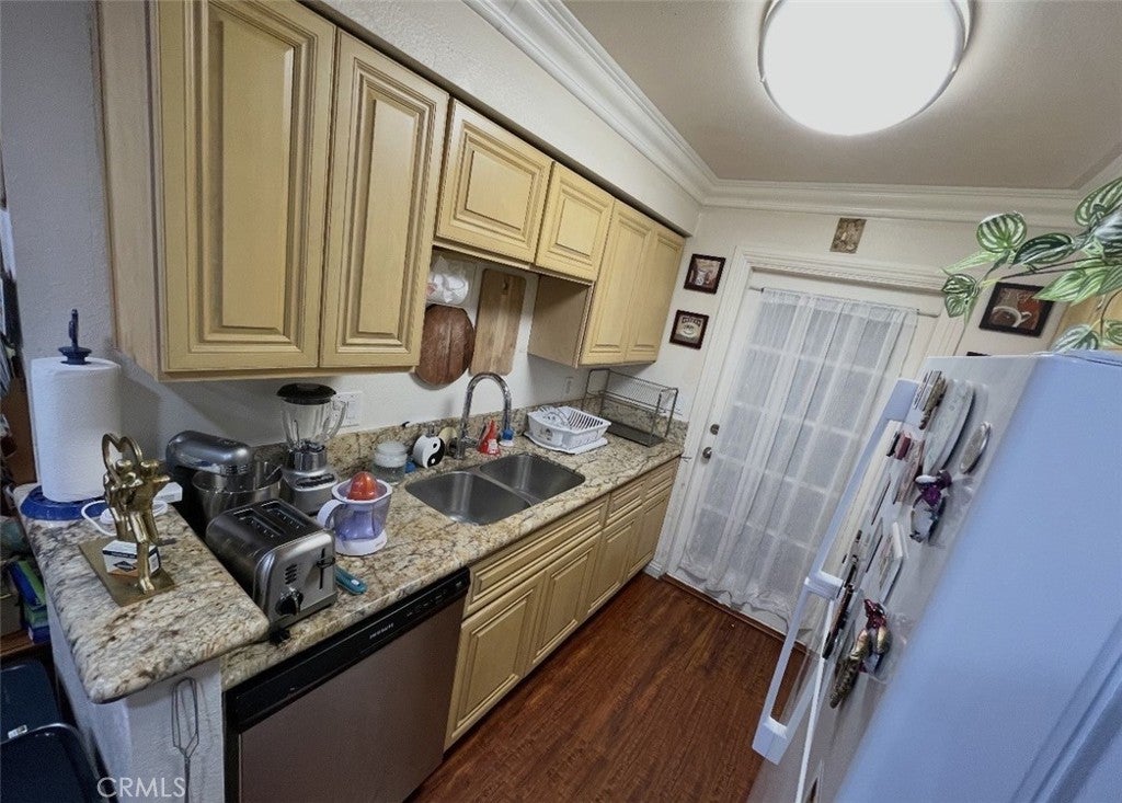 Well maintained end unit Condo located near downtown Covina with convenient access to the 210 and 10 freeways. This private unit offers added seclusion and a welcoming, cozy living room featuring a charming fireplace; perfect for relaxing evenings. The updated kitchen showcases granite countertops and opens to a private patio, ideal for morning coffee or outdoor dining. Upstairs, you'll find spacious bedrooms, including a generous primary bedroom with faulted ceilings and his and her closets. The upper level features laminate flooring and elegant crown crown molding through, adding warmth and style. The community offers resort-style amenities, including a clubhouse, pool and jacuzzi, making this home perfect for comfortable living and entertaining