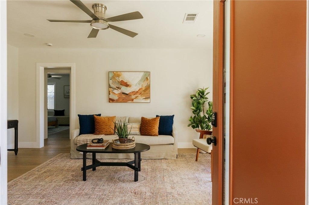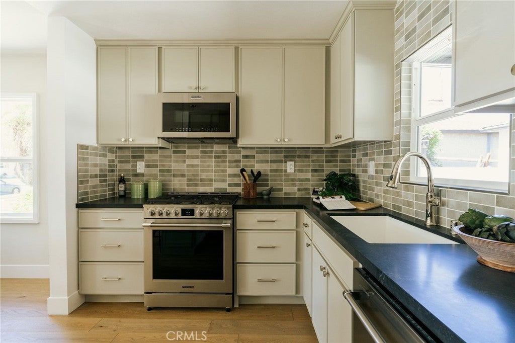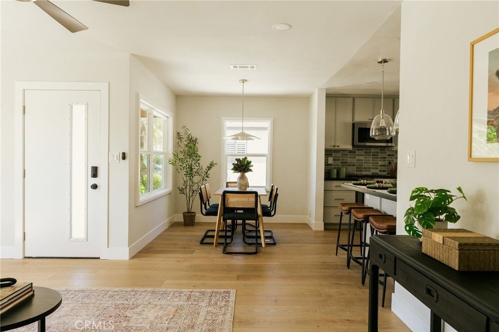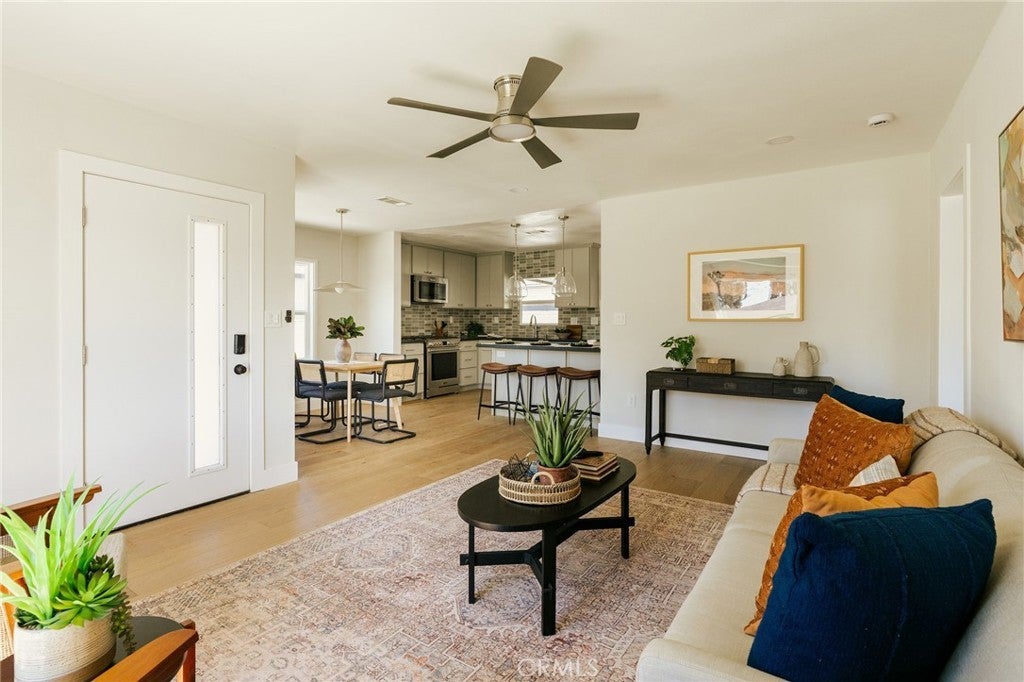 Welcome to this beautifully renovated 3 bedroom, 2-bathroom home located in desirable Long Beach neighborhood. Featuring a bright open floorplan, the front living area flows through to the dining area and kitchen. The kitchen has been updated with new cabinets, sleek quartz counter tops, tile backsplash, stylish fixtures, stainless-steel appliances and peninsula offering additional seating. The spacious primary bedroom has open beam ceilings, walk-in closet with custom built-ins, ensuite bathroom and access to outdoor covered patio. Both the primary and hall bathroom feature new double sink vanities, stylish new fixtures, and custom tile work. Other features include freshly painted interior and exterior, new luxury throughout the living area and bedrooms, new energy efficient vinyl windows, new doors, new roof, plumbing and light fixtures, new HVAC system, new garage door and motor. and tankless water heater. This home is great for fun and entertainment with a great outdoor space. The private enclosed backyard has a large, covered patio and a manicured yard. There is a two-car detached garage with additional off-street parking and gated driveway. Detached two car garage and spacious yard offers possible ADU potential. Buyer to verify all building codes and ADU guidelines with the city Tax rolls show different bedroom count.