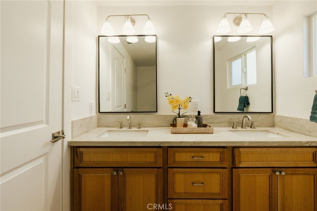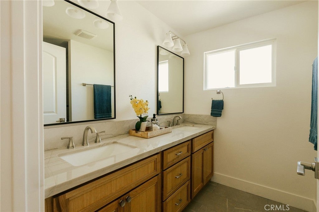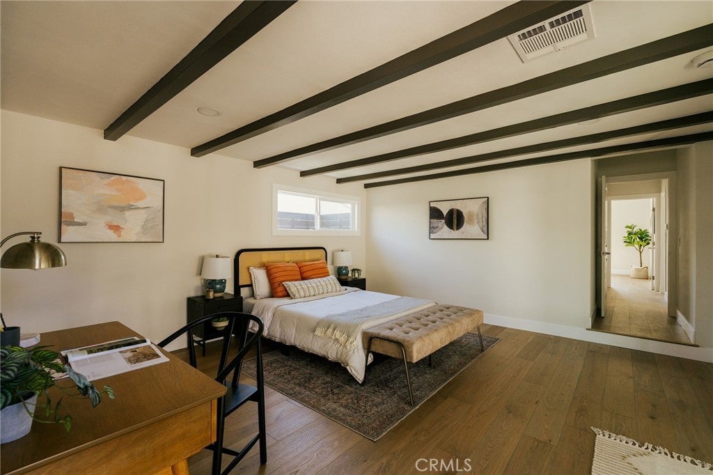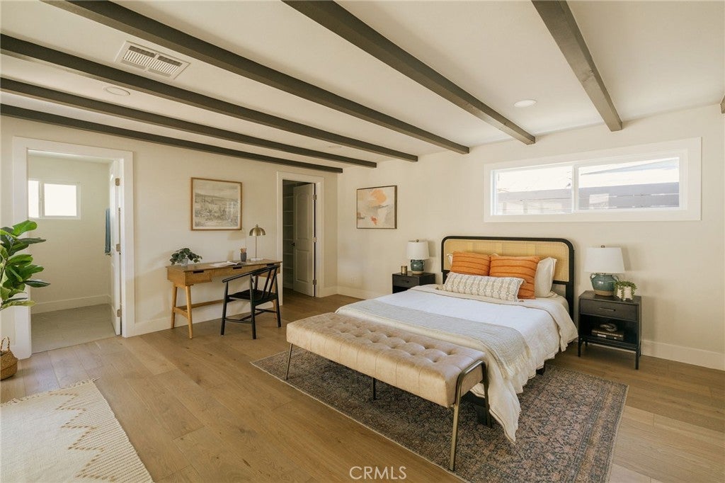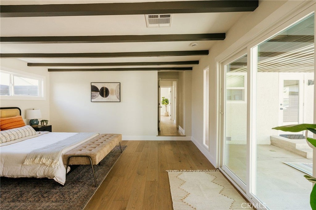 Welcome to this beautifully renovated 3 bedroom, 2-bathroom home located in desirable Long Beach neighborhood. Featuring a bright open floorplan, the front living area flows through to the dining area and kitchen. The kitchen has been updated with new cabinets, sleek quartz counter tops, tile backsplash, stylish fixtures, stainless-steel appliances and peninsula offering additional seating. The spacious primary bedroom has open beam ceilings, walk-in closet with custom built-ins, ensuite bathroom and access to outdoor covered patio. Both the primary and hall bathroom feature new double sink vanities, stylish new fixtures, and custom tile work. Other features include freshly painted interior and exterior, new luxury throughout the living area and bedrooms, new energy efficient vinyl windows, new doors, new roof, plumbing and light fixtures, new HVAC system, new garage door and motor. and tankless water heater. This home is great for fun and entertainment with a great outdoor space. The private enclosed backyard has a large, covered patio and a manicured yard. There is a two-car detached garage with additional off-street parking and gated driveway. Detached two car garage and spacious yard offers possible ADU potential. Buyer to verify all building codes and ADU guidelines with the city Tax rolls show different bedroom count.