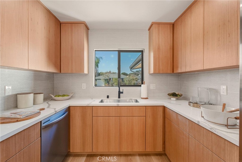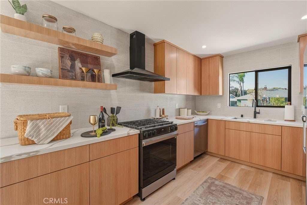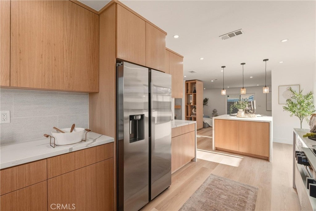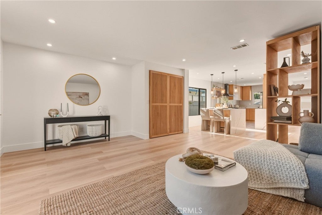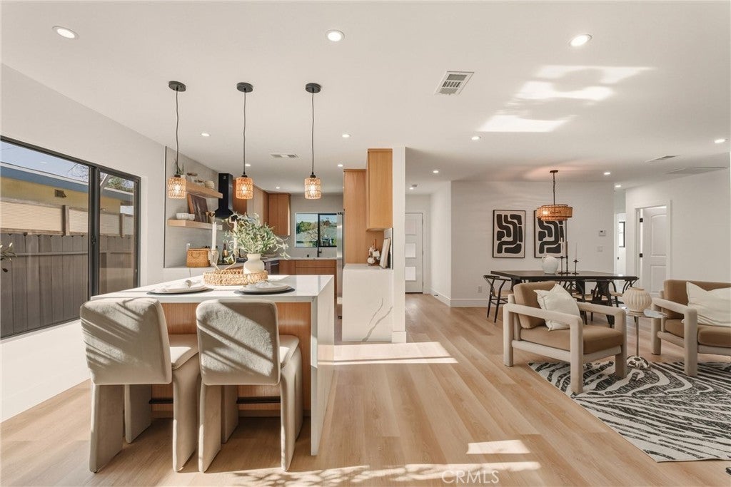 Welcome home to 3166 Senasac Ave, located in the ever-popular Plaza neighborhood of Long Beach. This stunning residence has undergone a complete renovation, thoughtfully designed to impress even the most discerning buyer with its quality, finishes, and craftsmanship. The home features two junior suites, each with its own private bathroom and ample closet space, along with two additional generously sized bedrooms. All three bathrooms have been fully updated and showcase custom handmade floating cabinetry, frameless glass shower doors, designer fixtures, and beautiful tile work. The chef’s kitchen is a true centerpiece, offering a center prep island that doubles as an eating area, new stainless steel appliances, custom handmade white oak cabinetry, and quartz countertops with dramatic waterfall edges. Designed for both comfort and functionality, the home offers a formal living room, a large family room, a dining area, and a conveniently hidden laundry area for easy access. Extensive upgrades include new interior wiring, an updated electrical service panel, new water lines and drains, a tankless water heater, vinyl windows, recessed lighting, central air and heating, new interior doors and baseboards, waterproof vinyl flooring, and Level 4 smooth-texture walls throughout. The exterior is equally impressive, featuring smooth-finish stucco, natural wood-finished fascia eaves, custom wrought-iron gates, a modern 6-foot rear wood fence, a detached two-car garage, and a manicured landscape design complete with concrete stepway squares and an automatic irrigation system. Ideally located near major freeways, public transportation, Long Beach State University and Patrick Henry Elementary School.