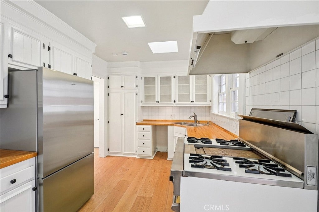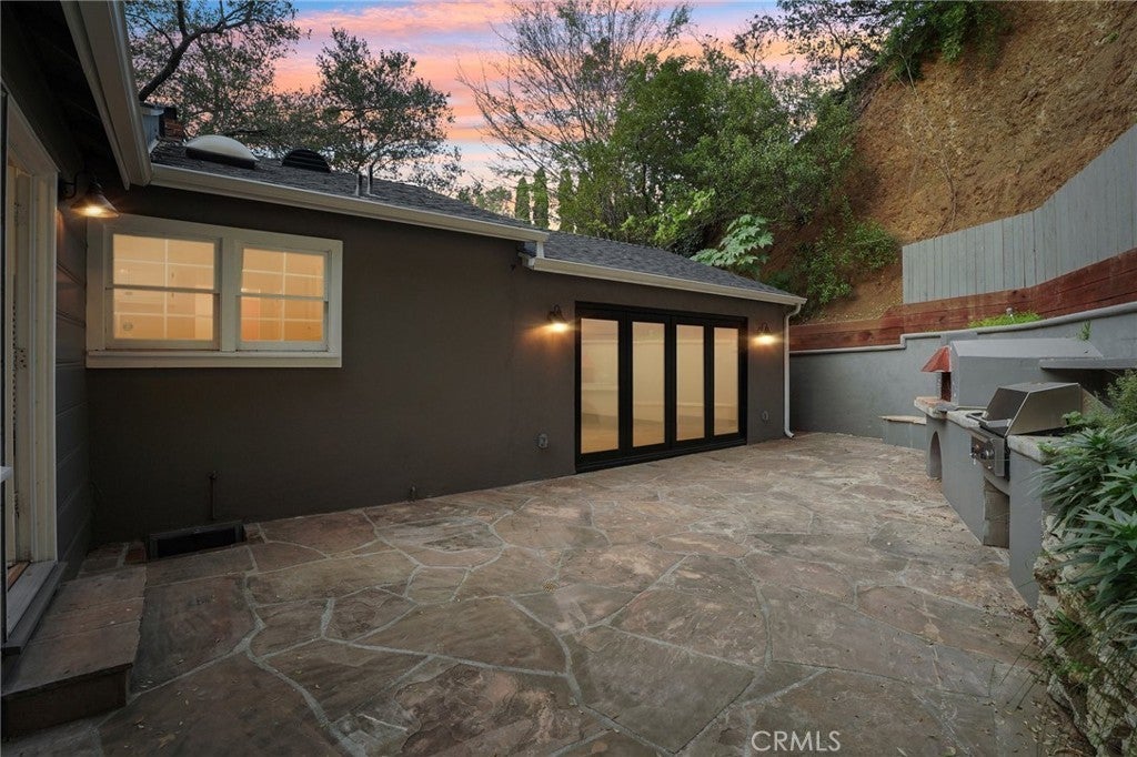 Tucked into the heart of Beachwood Canyon, this charming hillside residence blends classic character with thoughtful updates and exceptional indoor-outdoor living. Warm wood floors, abundant natural light, and a welcoming fireplace anchor the living spaces, while the kitchen features butcher block countertops, a professional-grade range, and timeless cabinetry. French doors and multiple outdoor access points lead to expansive stone patios, ideal for entertaining, dining al fresco, or enjoying the serene canyon setting, complete with a built-in outdoor kitchen and pizza oven. A detached garage with exposed beam ceiling offers flexibility for parking, storage, or creative use. Surrounded by mature trees and greenery, yet just minutes from Franklin Village, Griffith Park hiking trails, Hollywood, Los Feliz dining, and easy freeway access, this home offers a rare balance of privacy, charm, and convenience in one of Los Angeles’ most sought-after neighborhoods.