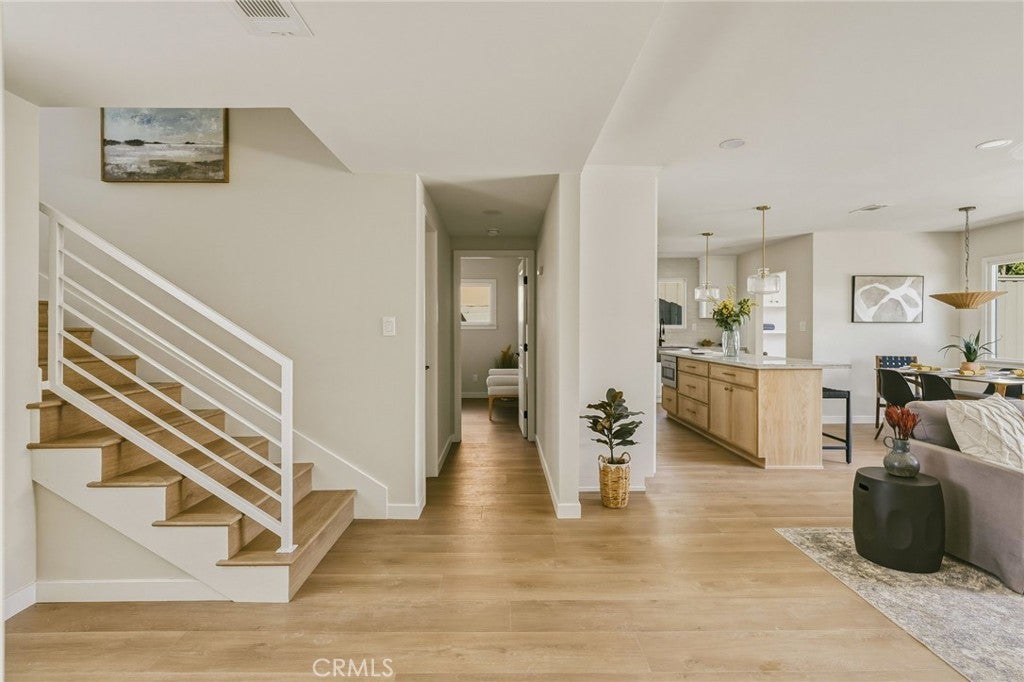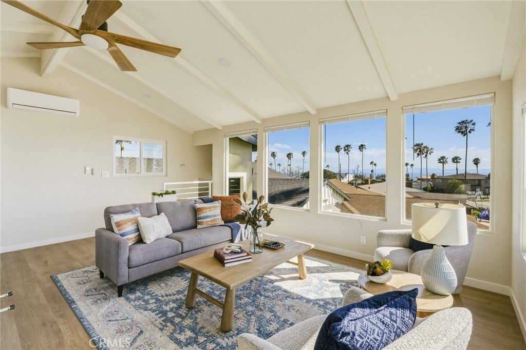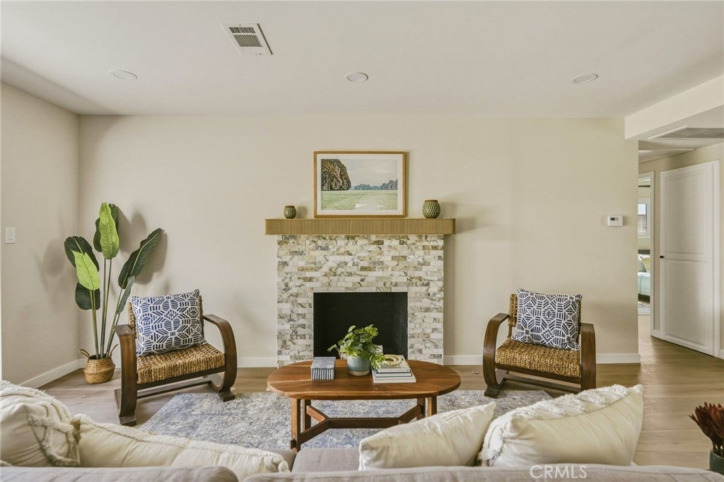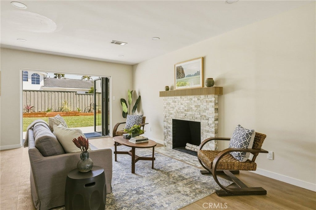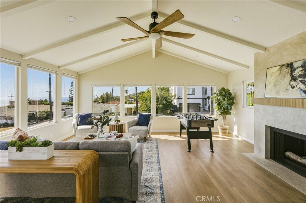 VIEWS, VIEWS, VIEWS! Welcome to this beautifully RENOVATED 3 bedroom, 2-bathroom home located in prime South Shores neighborhood. This home has an inviting curb appeal featuring gorgeous new landscaping, a 2-car garage with epoxy floors and large driveway offering off street parking for multiple cars. This home has a bright open floor plan with the downstairs living area opening to the kitchen and dining area. The kitchen has been updated with new cabinets, sleek Maldivi Quartzite counter tops, tile backsplash, stylish fixtures, stainless-steel appliances, and large center island with additional countertop seating. The spacious primary bedroom has 2 closets with custom built-ins, an ensuite bathroom and access to the back yard patio. Both the primary and hall bathroom feature new vanities, stylish new fixtures, and custom tile work. Other features include freshly painted interior and exterior, new luxury flooring throughout the living area, bedrooms and family room, tile flooring in the bathrooms, new energy efficient vinyl windows, new roof, plumbing and light fixtures, upgraded 200 AMP electrical panel, HVAC, new exterior fencing, new ceiling fans and spacious indoor laundry room with built in cabinets for additional storage. The upstairs flex room features and abundance of windows with PANORAMIC OCEAN AND CATALINA VIEWS, vaulted ceilings, decorative fireplace and AC split system. The accordion glass door in the living room offers the perfect blend of indoor outdoor living and leads to the private enclosed backyard with a large patio and manicured yard perfect for outdoor fun and entertainment.
