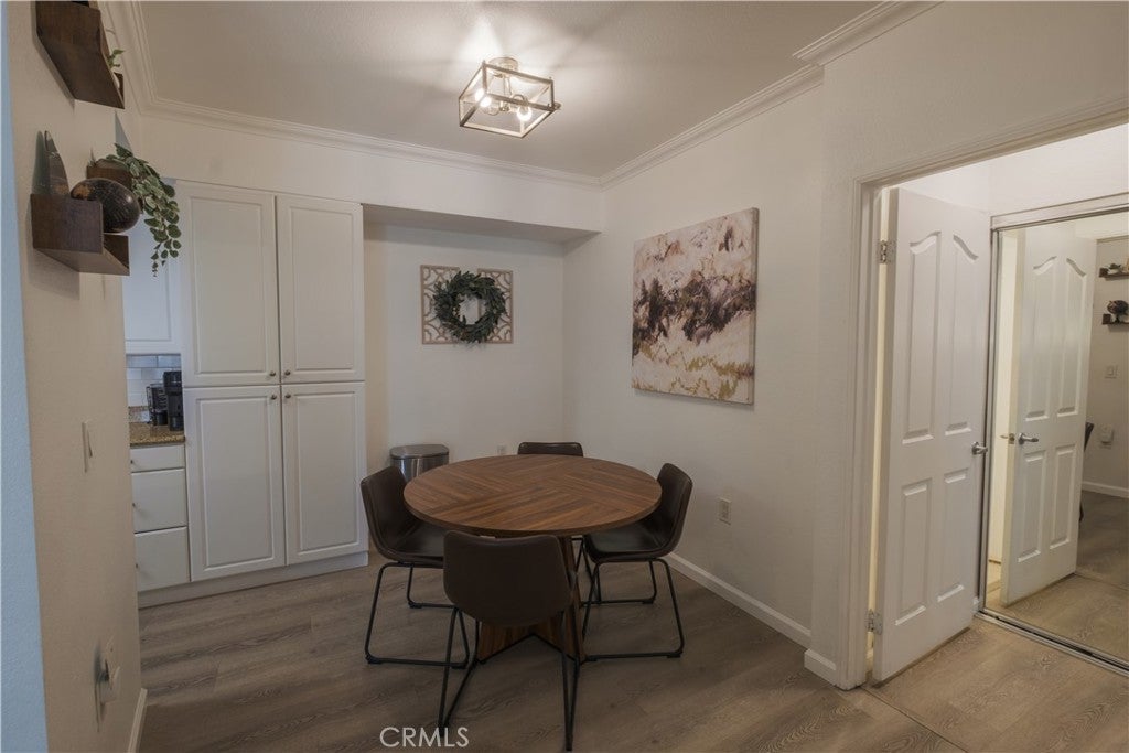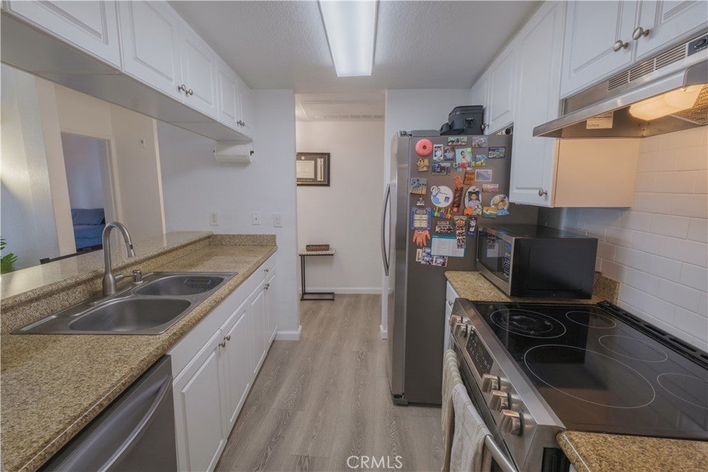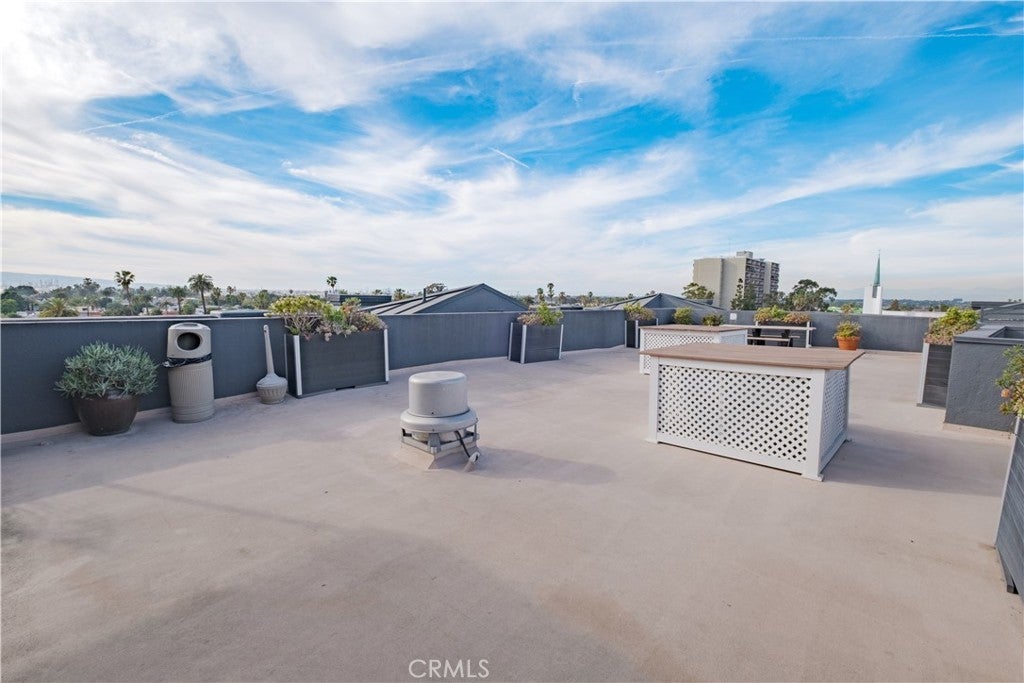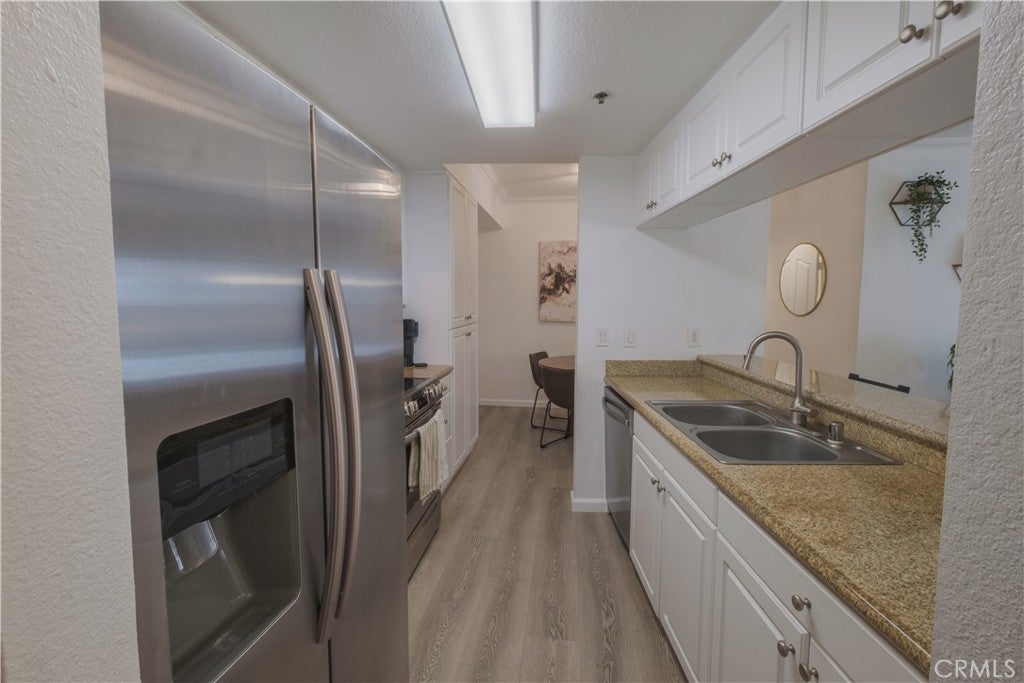 Welcome to The Pine Terrace. This two-bedroom, two-bath corner condominium features recent updates, including vinyl flooring throughout. The galley-style kitchen includes granite countertops, ample cabinet space, and opens to the living room. There is a breakfast bar as well as a separate dining area. This unit includes a private patio, one of a limited number of units in the building with this feature. The primary bedroom offers dual closets and direct access to the patio. Additional features include an in-unit washer and dryer. The property includes two assigned parking spaces in a gated garage and a secured bike storage area. Community amenities include a rooftop terrace with city views, a courtyard with BBQ area, and secured mail and package lockers. Located on Pine Avenue, the property is within proximity to downtown Long Beach, including restaurants, shops, and other local services. Buyer to verify all information, including square footage, permits, and HOA details.