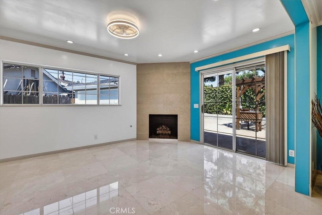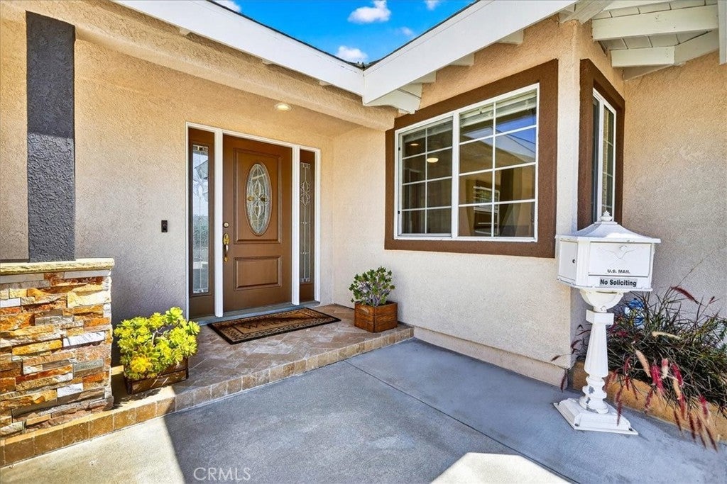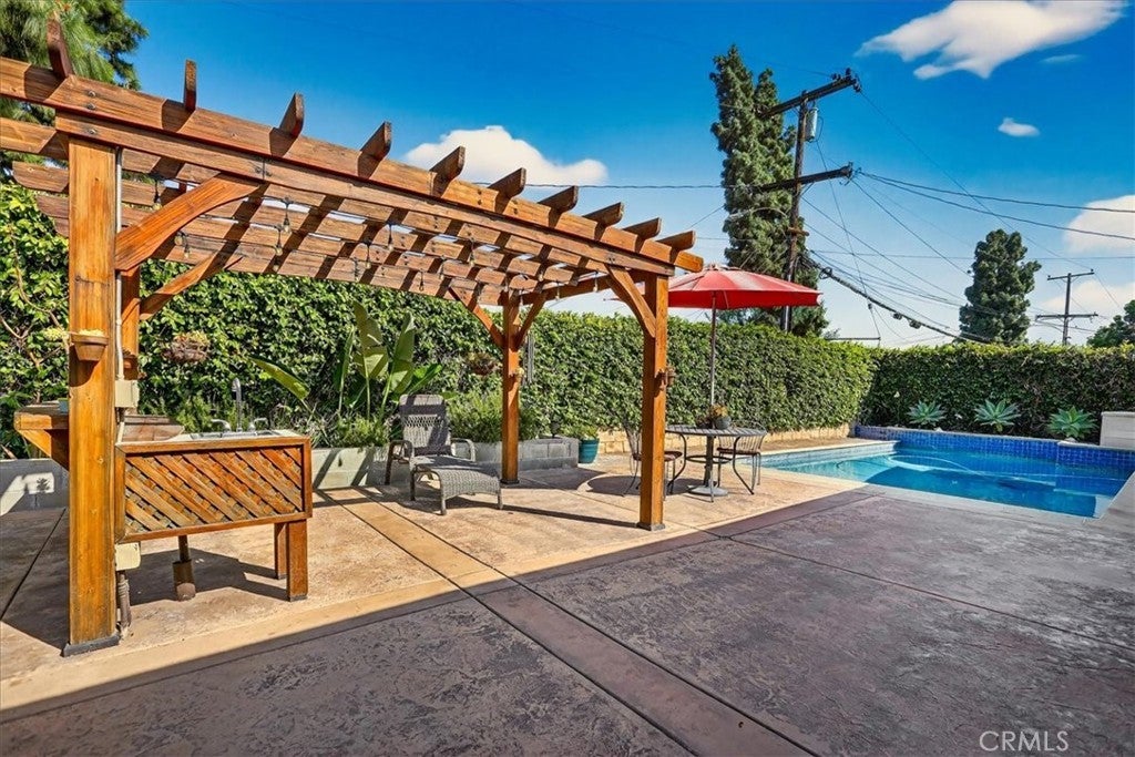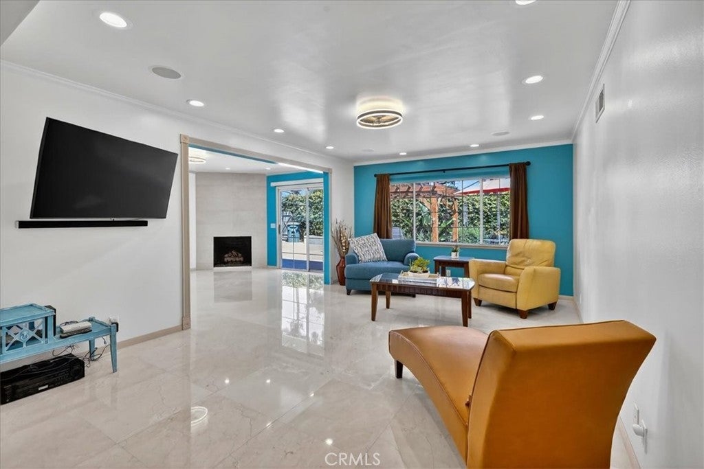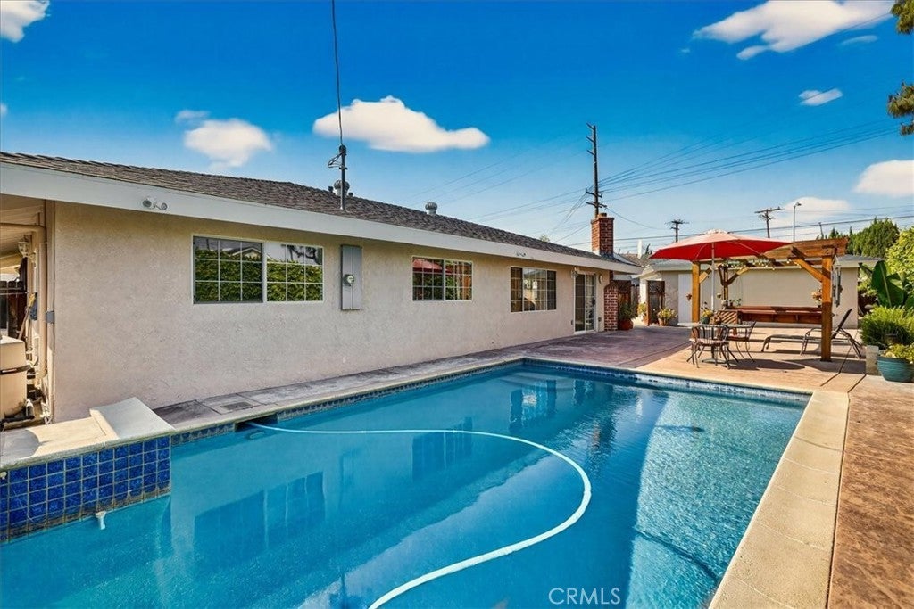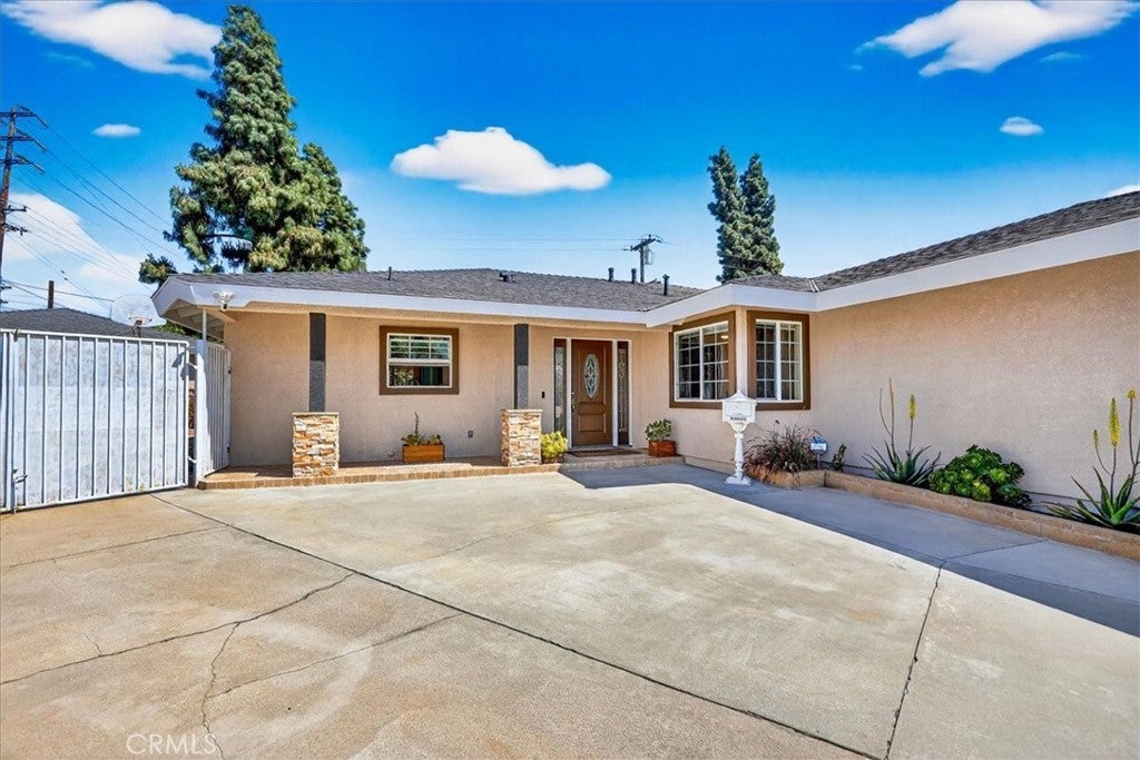 Beautiful home on a quiet cul-de-sac in the highly desirable Green Hills neighborhood, this home welcomes you with low-maintenance landscaping, plentiful driveway parking, and the convenience of an electric vehicle charger powered by an upgraded 200-amp electrical service. A gated driveway also offers secure RV parking. Step inside to discover an open-concept layout where the living room, kitchen, and family room flow together seamlessly. Polished marble flooring flows throughout the living room, where surround sound speakers are discreetly built into the ceiling. The spacious kitchen features granite countertops, a large island with a microwave oven and a built-in beverage refrigerator. The expansive family room is centered around a fireplace accented by a stunning porcelain tile wall. The primary suite is a true retreat, offering ample room for a home office area, a generous walk-in closet with built-in shelving and drawers, and a spa-like ensuite bathroom complete with a Jacuzzi tub, dual pedestal sinks, and a spacious shower. All additional bedrooms feature ceiling fans and LED recessed lighting, and every bathroom has been thoughtfully upgraded. Step outside to your private backyard oasis. Accessed through the family room, the space features a charming pergola, low maintenance landscaping, and a sparkling swimming pool heated by solar. Additional highlights include a two-car detached garage with abundant overhead storage and cabinetry, plus a gated storage area behind the garage with two metal sheds for even more space. Thoughtful upgrades include freshly painted exterior, LED recessed lighting throughout, copper plumbing upgrades, dimmable light switches throughout, and a smart touchscreen thermostat. The property is located very close to award winning schools, many parks, large shopping center with a gym and movie theater, La Mirada Golf Course, Splash, La Mirada Theater For The Performing Arts and it is also steps away from Biola University! This home isn't just beautiful, it's perfectly positioned. With everything you need in a great neighborhood!