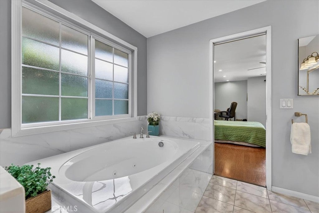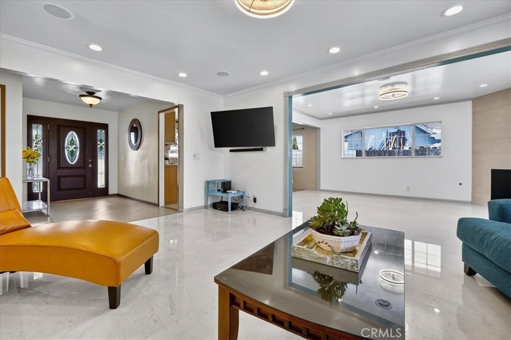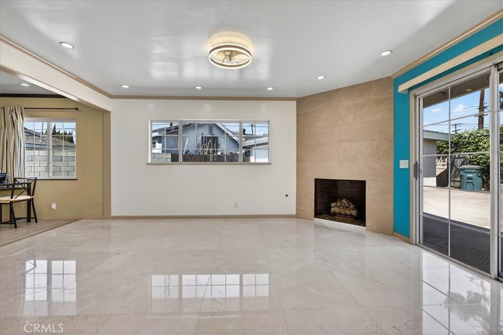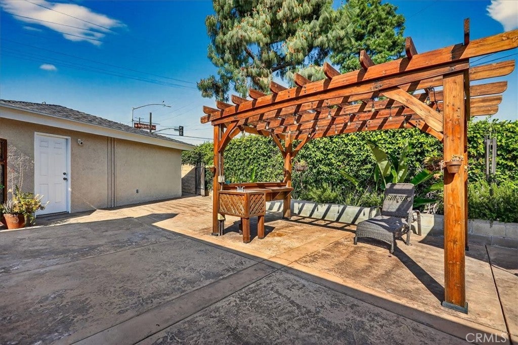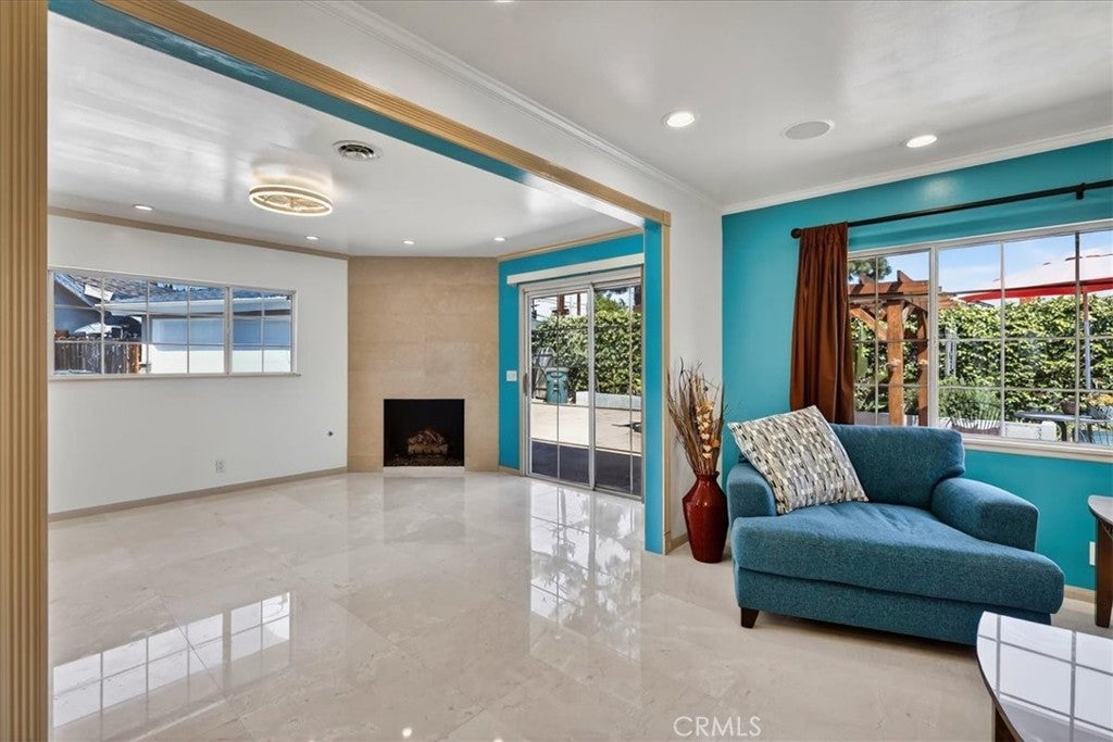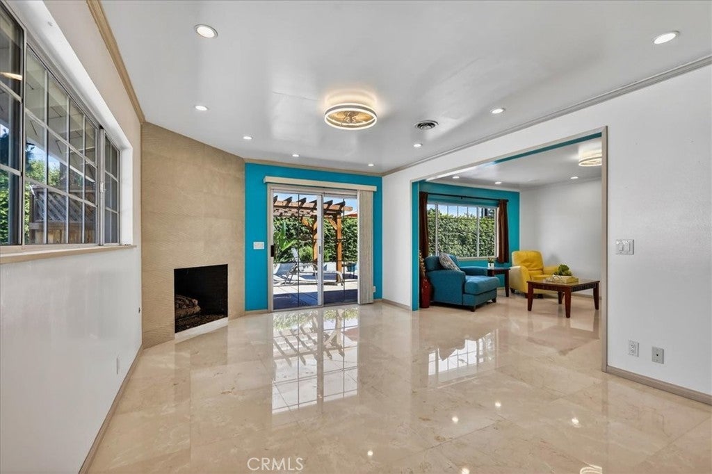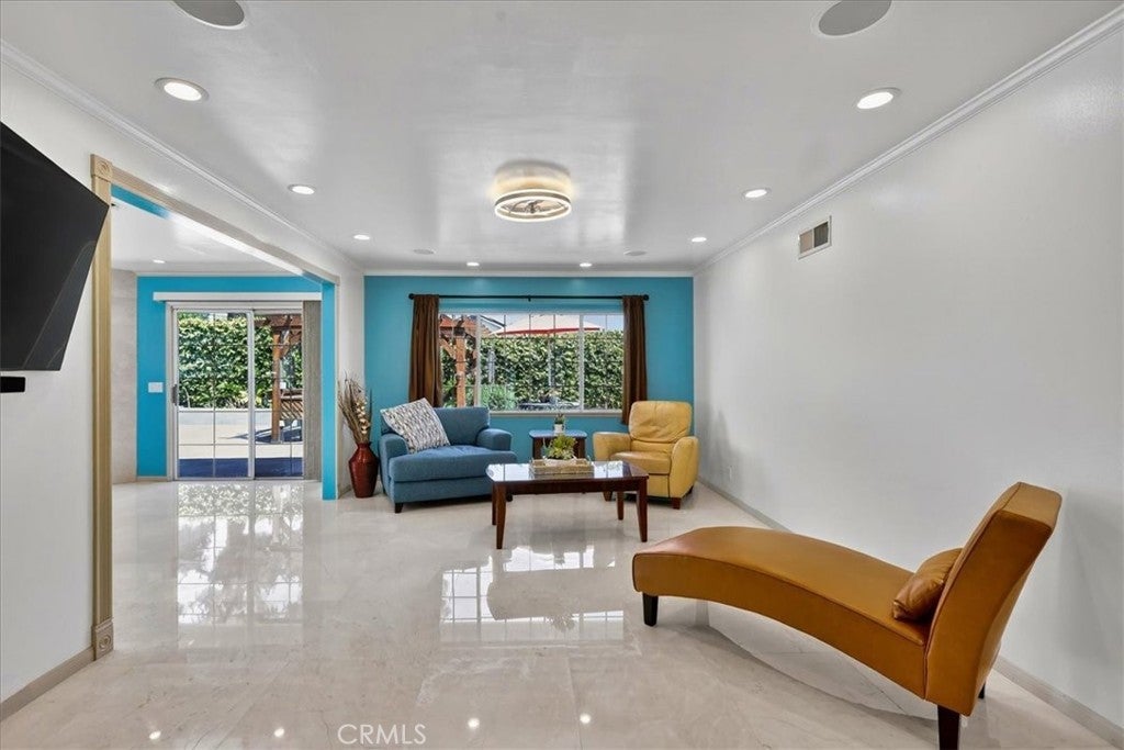 Beautiful home on a quiet cul-de-sac in the highly desirable Green Hills neighborhood, this home welcomes you with low-maintenance landscaping, plentiful driveway parking, and the convenience of an electric vehicle charger powered by an upgraded 200-amp electrical service. A gated driveway also offers secure RV parking. Step inside to discover an open-concept layout where the living room, kitchen, and family room flow together seamlessly. Polished marble flooring flows throughout the living room, where surround sound speakers are discreetly built into the ceiling. The spacious kitchen features granite countertops, a large island with a microwave oven and a built-in beverage refrigerator. The expansive family room is centered around a fireplace accented by a stunning porcelain tile wall. The primary suite is a true retreat, offering ample room for a home office area, a generous walk-in closet with built-in shelving and drawers, and a spa-like ensuite bathroom complete with a Jacuzzi tub, dual pedestal sinks, and a spacious shower. All additional bedrooms feature ceiling fans and LED recessed lighting, and every bathroom has been thoughtfully upgraded. Step outside to your private backyard oasis. Accessed through the family room, the space features a charming pergola, low maintenance landscaping, and a sparkling swimming pool heated by solar. Additional highlights include a two-car detached garage with abundant overhead storage and cabinetry, plus a gated storage area behind the garage with two metal sheds for even more space. Thoughtful upgrades include freshly painted exterior, LED recessed lighting throughout, copper plumbing upgrades, dimmable light switches throughout, and a smart touchscreen thermostat. The property is located very close to award winning schools, many parks, large shopping center with a gym and movie theater, La Mirada Golf Course, Splash, La Mirada Theater For The Performing Arts and it is also steps away from Biola University! This home isn't just beautiful, it's perfectly positioned. With everything you need in a great neighborhood!
