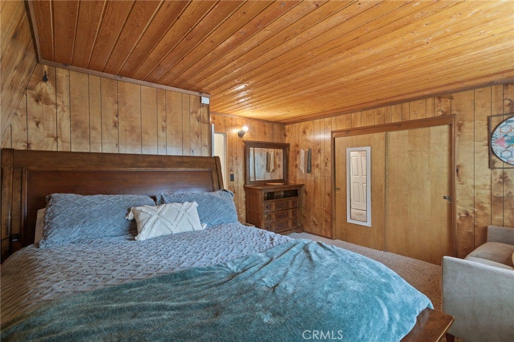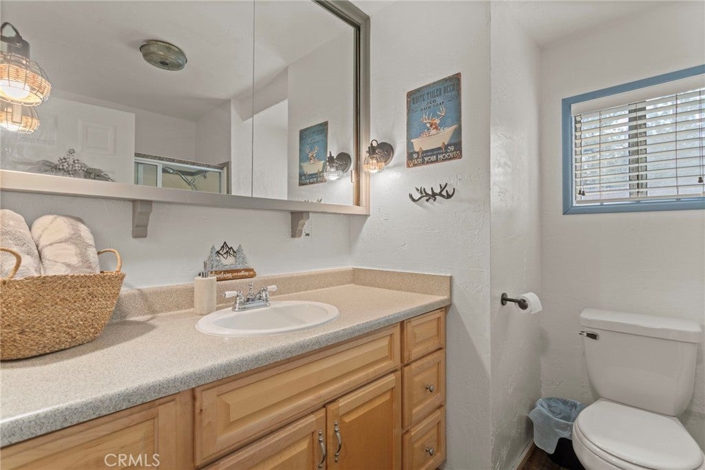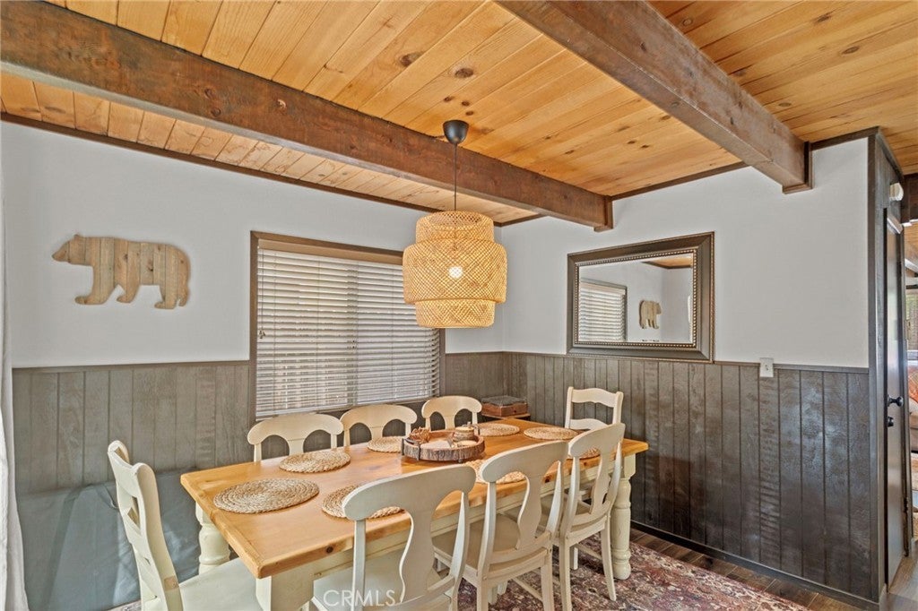 Beautiful cabin just minutes from hiking trails and off-roading; this updated Gambrel-style home delivers the mountain lifestyle you've been dreaming of! From the moment you arrive, the lovely front porch invites you to sit back, breathe in the fresh mountain air, and settle into a slower pace of life. Step inside to discover an open-concept first floor where the living room, kitchen, and dining room flow together seamlessly. The living room is featuring open beam ceilings and a wood-burning stone fireplace with original cast iron fixtures. The adjacent kitchen boasts new quartz countertops, light-colored wood cabinetry, and a double-basin stainless steel sink with modern fixtures. Just beyond, the dining room is accented with classic wainscoting and a new double-pane sliding glass door that opens to the backyard. The first floor has been thoughtfully upgraded with new, high-quality waterproof plank flooring throughout, fresh paint, and new insulation. A convenient half bath, complete with a beautiful crystal chandelier. Convenient laundry hookups are located on the first floor. Upstairs, you'll find spacious bedrooms featuring real wood paneling and open beam ceiling. The full bath is generously sized with an oversized vanity and large mirrored medicine cabinet. Upgrades on the second floor include waterproof plank flooring in the hall and bath, plus new wainscoting. A peaceful deck, nestled among mature trees, offers effortless outdoor living with minimal upkeep. Additional upgrades include new roof, rain gutters, fresh exterior paint, updated front porch with new fascia boards. Nestled near Erwin Lake Park and the San Bernardino National Forest, this home offers easy access to hiking trails, off-roading, horseback riding, rock climbing, mountain biking, and more. A short drive takes you to the ski resorts of Big Bear and the charming Big Bear Village, yet you're far enough away to enjoy the serenity and tranquility of true mountain living. Year-round living or weekend escape, this home works beautifully for both!