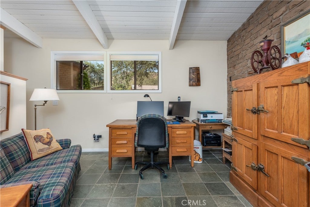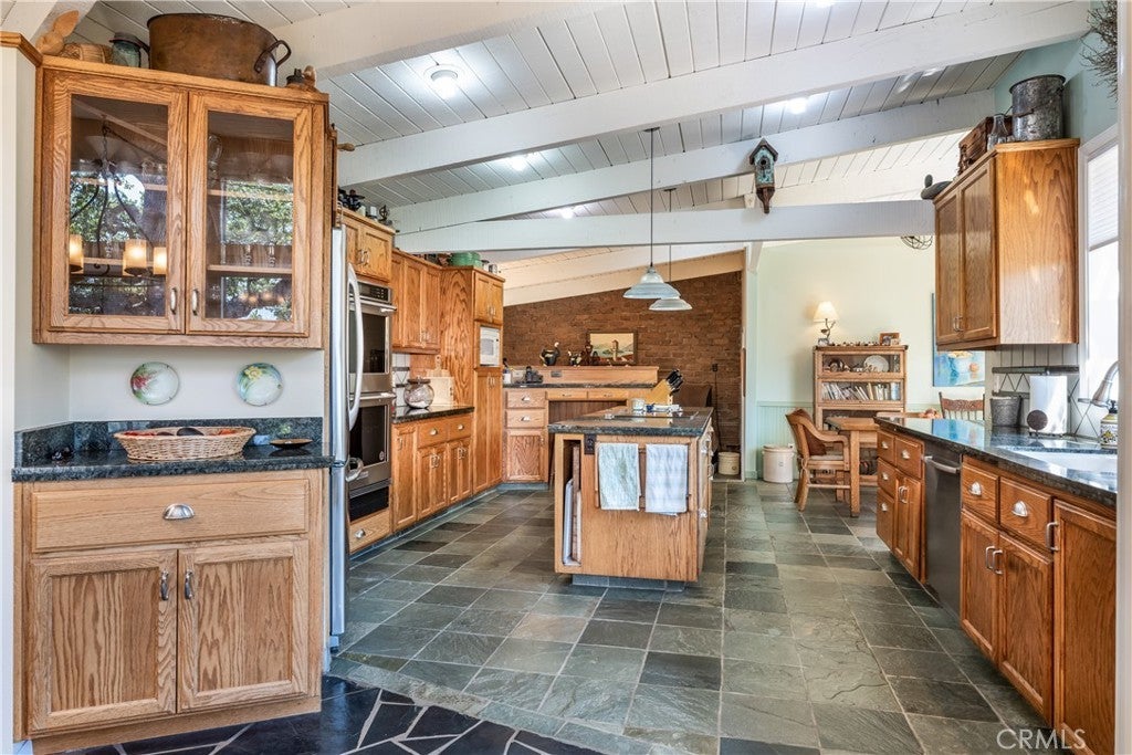 • Interior FeaturesBeamed Ceilings, Built-in Features, Brick Walls, Breakfast Area, Ceiling Fan(s), Cathedral Ceiling(s), Granite Counters, High Ceilings, Living Room Deck Attached, Recessed Lighting, Storage, Sunken Living Room, Track Lighting, All Bedrooms Down, Main Level Primary