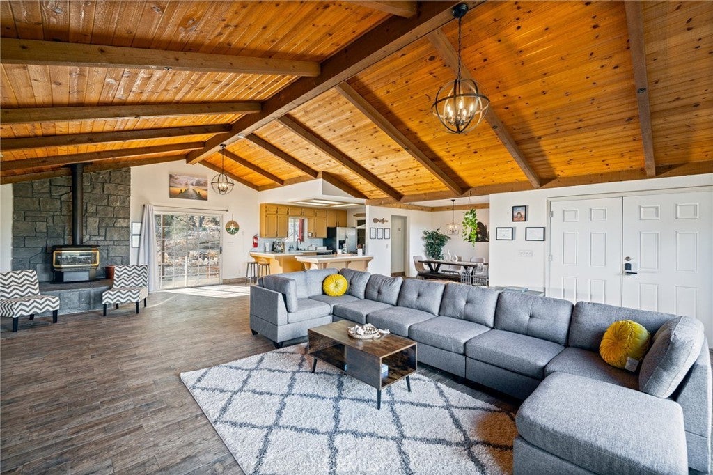 • Interior FeaturesAll Bedrooms Down, Beamed Ceilings, Cathedral Ceiling(s), Ceiling Fan(s), Furnished, High Ceilings, Open Floorplan, Separate/Formal Dining Room, Stone Counters