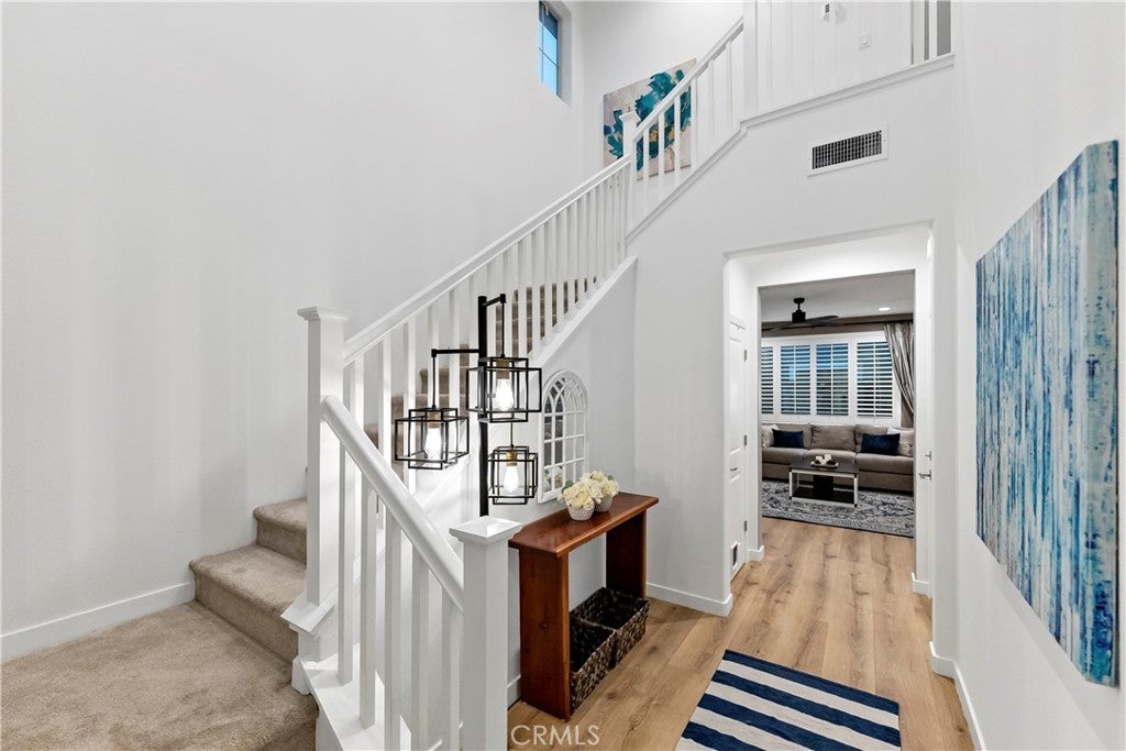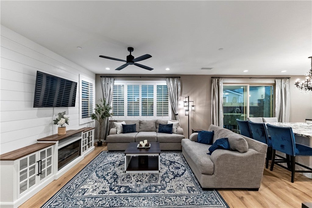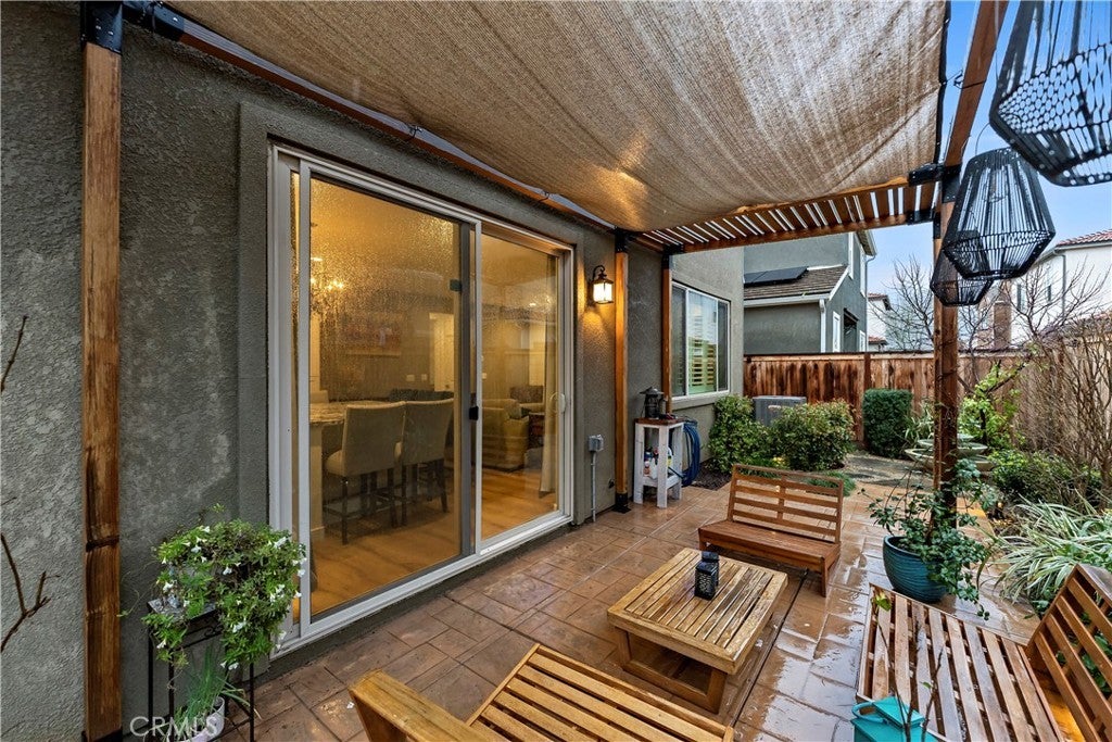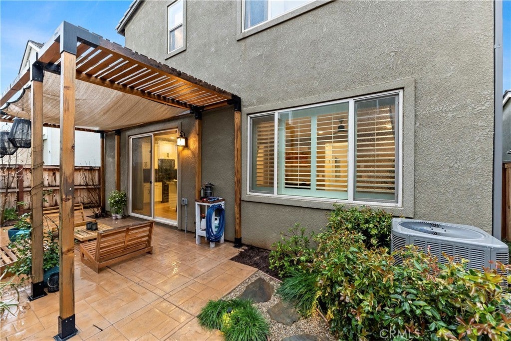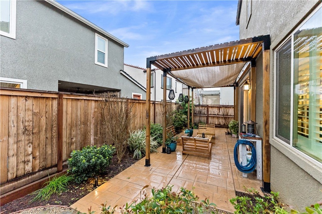 Owned solar included in this beautiful Tuscan-style 3 bedroom, 2.5 bath two-story home located in the highly desirable Tesoro Viejo community offering comfort, efficiency, and an ideal layout for entertaining. This type of floor plan was recognized with a Gold Nugget Award for its exceptional design and livability. As you walk in, you're welcomed into a cozy living room featuring a shiplap accent wall and durable scratch-resistant laminate flooring. The space flows seamlessly into the kitchen, where an extended countertop island, black soapstone countertops, black backsplash, a double oven, and smart app-connected appliances create a sleek and functional gathering space. From the kitchen, the extra-long sliding door brings in natural light and opens directly to the backyard. Step outside to a professionally finished backyard highlighted by a custom pergola, flagstone patio, and fountain a private and inviting setting to relax or host gatherings. While the yard is low-maintenance, Tesoro Viejo's parks, trails, dog park, and open community spaces extend your outdoor lifestyle. Upstairs features fully upgraded carpet throughout and a spacious primary suite with a redesigned custom closet, accent wall, and blackout window covering for added privacy. Plantation shutters, a tankless water heater, EV charger setup, and garage ceiling storage add everyday functionality. Well maintained and move-in ready in one of the area's most sought-after communities.