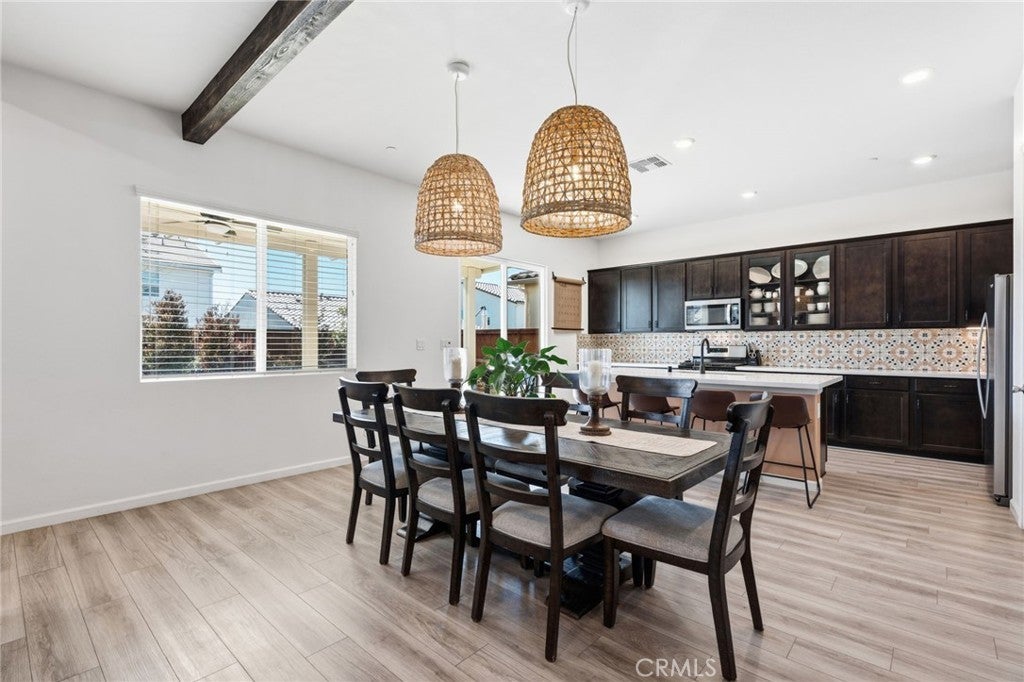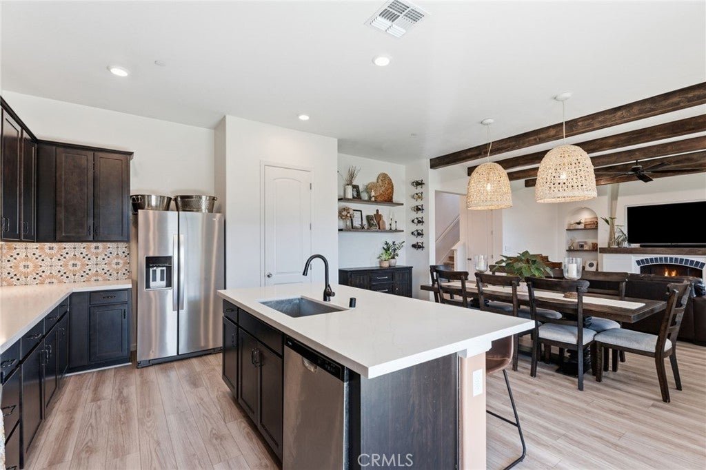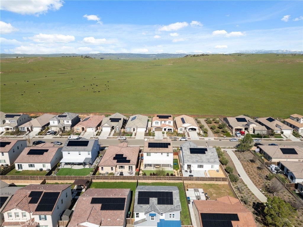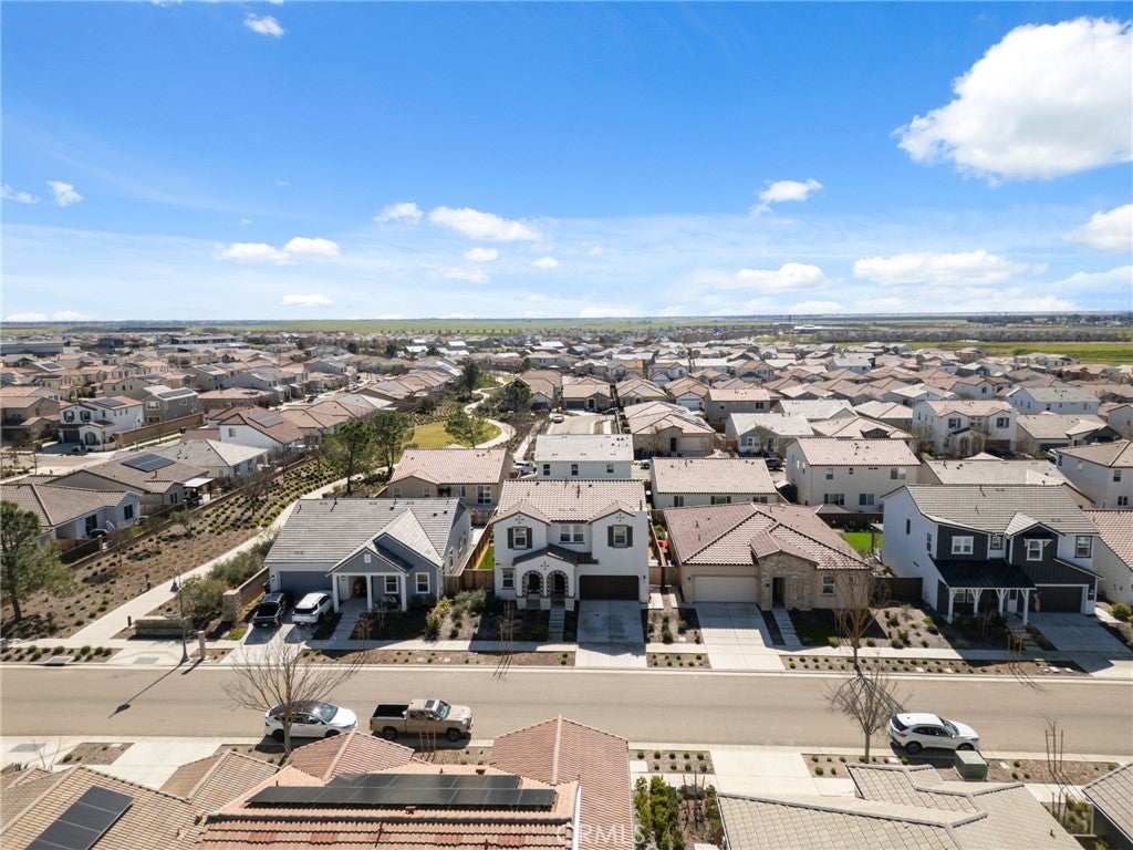 Welcome to this beautifully upgraded Spanish-style residence in the highly sought-after Tesoro Viejo community, built in 2023 and offering approximately 2,611 square feet of thoughtfully designed modern living with owned solar, a major value-add providing long-term energy efficiency and cost savings. This 5-bedroom, 3-bath home blends contemporary finishes with timeless architectural character, featuring tall ceilings, dramatic wood beams, and an open-concept layout ideal for both everyday living and entertaining. The inviting great room is anchored by a custom fireplace with Spanish-style detailing, built-in shelving, and accent lighting, creating a warm and sophisticated focal point. The kitchen is designed for both function and style with upgraded cabinetry, custom tile back splash, display glass cabinets, and a large island that seamlessly connects to the dining and living spaces perfect for gatherings and daily living alike. Durable luxury vinyl flooring flows throughout the main areas with plush carpet in the bedroom areas, while upgraded lighting, chandeliers, and ceiling fans enhance the home's modern aesthetic. The large backyard is designed as a private retreat featuring a covered patio, expansive low-maintenance synthetic lawn, added concrete, mature landscaping, citrus trees, and garden areas perfect for relaxing or entertaining year-round. The flexible floor plan includes spacious secondary bedrooms and a versatile large loft ideal for a media room, office, or play space, along with a 2-car garage. Custom touches and thoughtful upgrades are found throughout the home, elevating it well beyond standard new construction and adding both style and functionality at every turn. Ideally located within the community, this home enjoys close proximity to scenic walking trails and convenient pedestrian pathways that lead directly to the recreation center and the heart of Tesoro Viejo, making it easy to enjoy the neighborhood's amenities and lifestyle. Residents benefit from resort-style features including a community pool, spa, tennis courts, clubhouse, parks, and vibrant neighborhood events, all while being conveniently situated with easy access to Fresno, dining, and shopping. This nearly new home offers the rare opportunity to own a highly upgraded, energy-efficient property with designer finishes, custom details, owned solar, and an exceptional location within one of the Central Valley's most desirable communities!