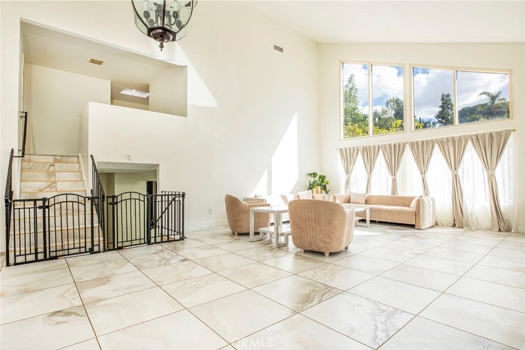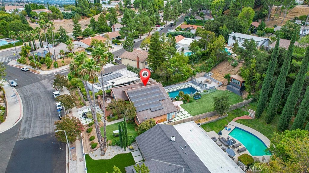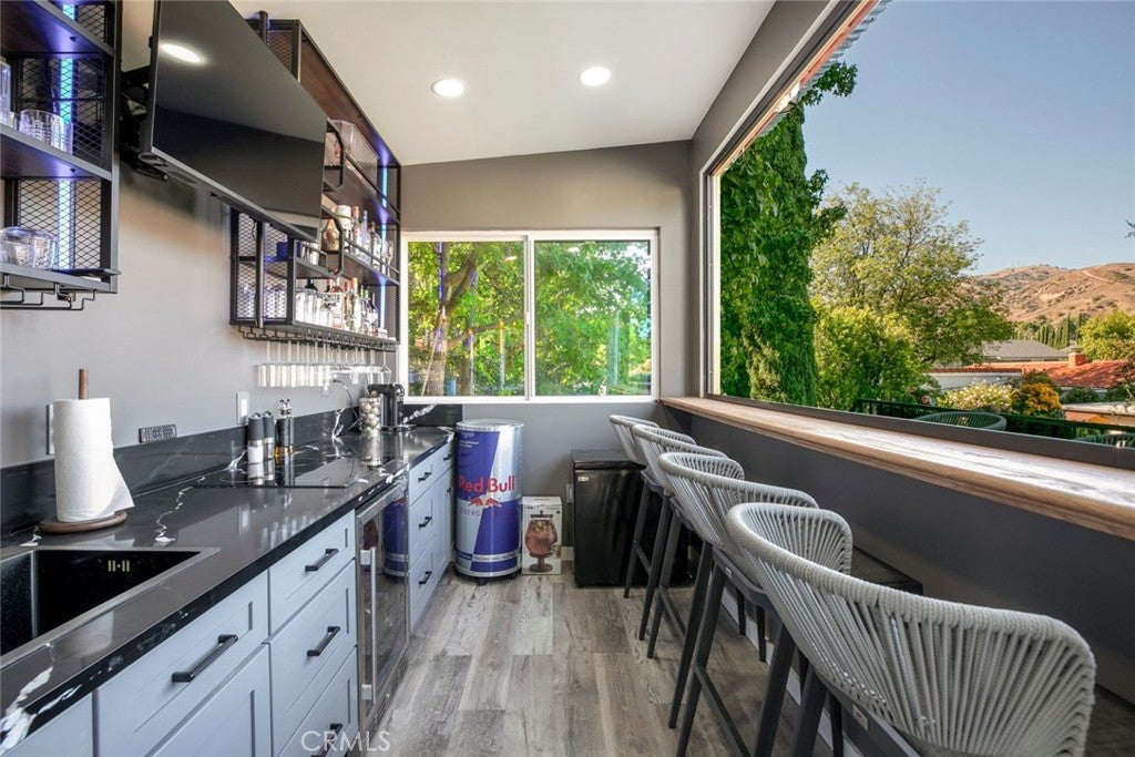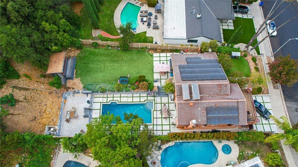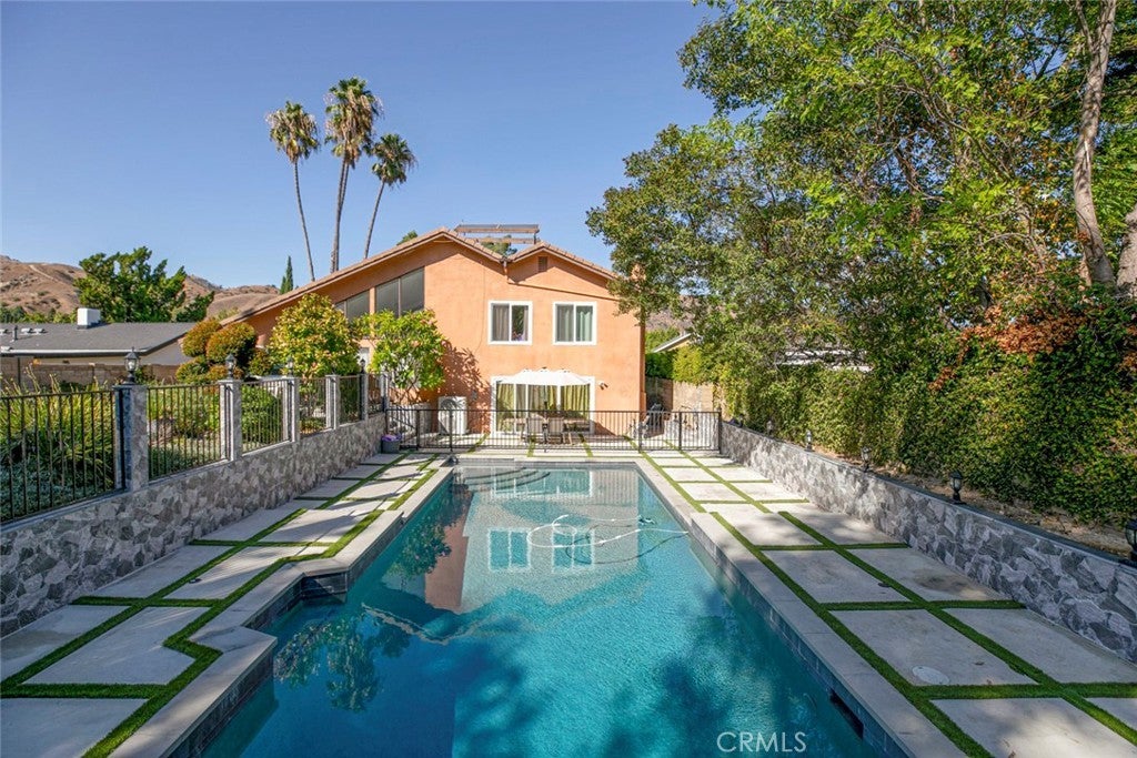 Welcome to this exquisitely remodeled home, featuring paid-off solar energy and breathtaking mountain views, nestled in the heart of Porter Ranch. No detail has been overlooked in this stunning residence. As you step inside, you’ll be greeted by elegant new tile flooring throughout, complemented by stylish vinyl flooring in all bedrooms. The guest restroom has been tastefully remodeled with all-new tile, while the family room boasts a modern electric fireplace surrounded by Italian tile. The popcorn ceilings have been removed to create an airy, contemporary feel, enhanced by upgraded recessed lighting in the kitchen, three bedrooms, and the family room. The home also includes an electric car charger for your convenience. A comprehensive water filtration system ensures fresh water throughout the house, and the driveway has been expanded with a fresh layout of artificial grass and a new retaining wall enhancing the curb appeal. The backyard is a true oasis, featuring a freshly renovated pool with a mini pebble finish (10 ft deep) and new plumbing with three return lines. A cozy Baja shelf has been added for the kids, along with brand-new equipment including a saltwater system, heater, pumps, and a water feature. Enjoy the convenience of wireless pool controls, two color-changing pool lights, a new skimmer, and an auto-fill feature. Surrounding the pool, you’ll find newly installed cement slabs and elegant tile-work, as well as a barrier wall and new gates for added safety. The patio area features brand-new pavers and lighting, creating an inviting space for relaxation and entertainment. A newly completed bar area awaits your finishing touches, boasting a custom $12,000 bi-fold window that perfectly frames the stunning views. The newly installed sprinkler system services the hillside and pool area, making this home a luxurious retreat. Bar area also includes quartz countertops, electric stove top, refrigerator, tv, sink and much more! Experience the perfect blend of sophistication and comfort in this remarkable property!
