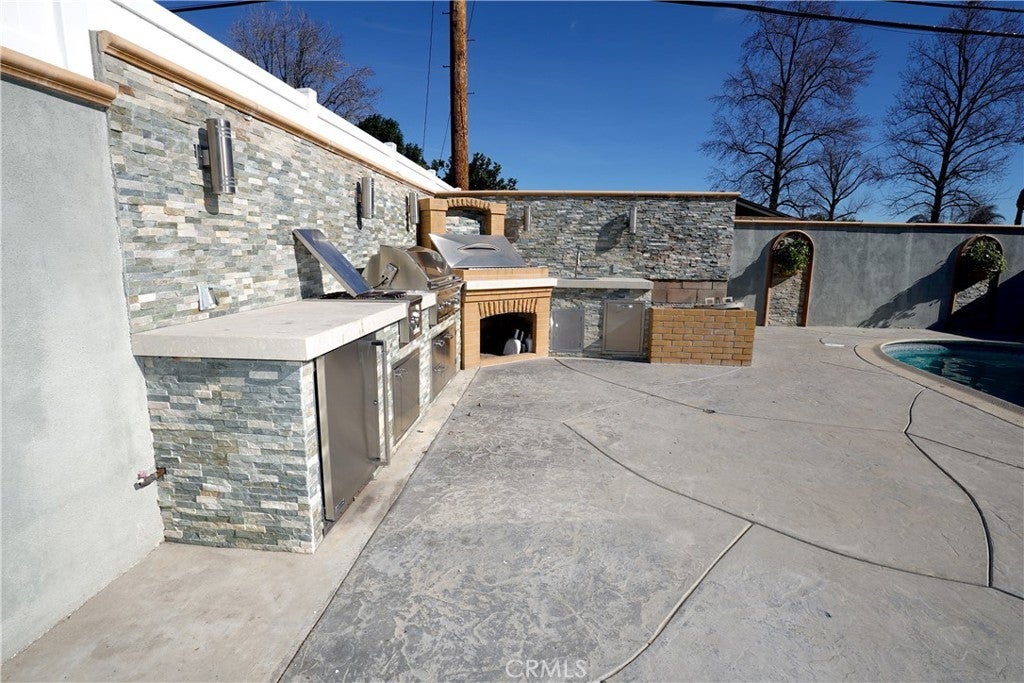 Welcome to this beautifully remodeled residence located on Balboa Blvd in the heart of Granada Hills. This move-in-ready three-bedroom, two-bath home offers the perfect blend of style, comfort, and designed for effortless living and entertaining. The bedrooms offer contemporary-style closets with sleek panel detailing, enhancing the home's modern aesthetic. Sky light in one of the bedrooms. Every detail was thoughtfully selected to create a warm, contemporary feel throughout. This home features updated finishes throughout. Before entering the home, you pass through a gated entry that leads into a private front yard and a sitting area with mature trees, landscaped grounds, creating a calm and inviting outdoor space. The bright, open-concept layout of the living area is filled with natural light and features wide-plank flooring, recessed lighting, a sleek modern fireplace, and large folding doors that open seamlessly to the backyard—ideal for entertaining and everyday living. The chef’s kitchen is equipped with brand-new GE appliances, custom cabinetry, quartz countertops, an oversized center quartz island, and a Flotera designer hood, blending style and functionality. Step outside to a resort-style backyard featuring a heated swimming pool and a fully built-out outdoor kitchen with premium Lynx and Sedona gas and grill appliances, plus a tondir, creating the perfect setting for gatherings and outdoor dining. Additional highlights include a recently updated roof, laundry hookups located in the garage, a separate driveway with direct garage access, and ample parking. Every detail has been thoughtfully updated, making this home truly move-in ready. Conveniently located near shopping, dining, and major routes, and everyday amenities, with easy access to surrounding neighbourhoods, this property offers a rare combination of modern luxury, comfort, and exceptional outdoor living. A great opportunity to own a renovated home in a well-established Granada Hills community.