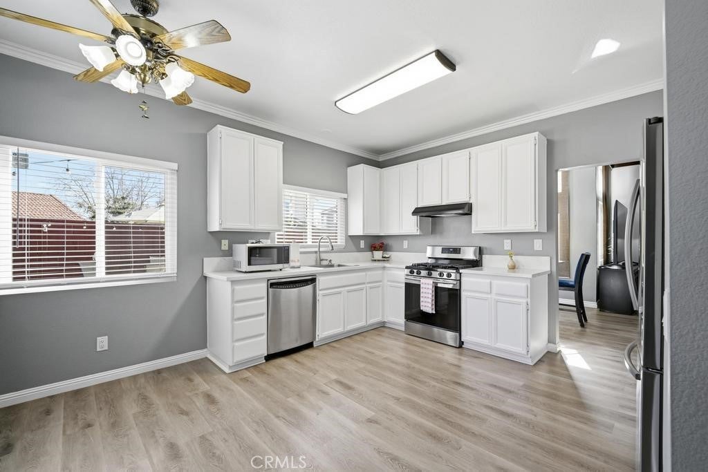 Welcome to 45664 Balmoral Court, Lancaster, CA a thoughtfully re-imagined residence located on a quiet cul-de-sac, where refined upgrades meet everyday livability. This beautifully updated home showcases engineered flooring throughout the entire first level, paired with new plush carpeting upstairs, creating a seamless blend of sophistication and comfort. The fully remodeled downstairs kitchen serves as the heart of the home, offering timeless finishes, clean lines, and functionality designed for both entertaining and daily living. Extensive improvements deliver true peace of mind, including new windows, new mechanical systems, a new garage door, and all-new main line plumbing upgrades rarely found and highly valued by today’s discerning buyers. Adding to its appeal, the property features fully paid solar, providing long-term energy efficiency and meaningful savings. The outdoor space has been meticulously curated with new pavers, a partially new perimeter fence, and a detached storage shed, creating a private and versatile backyard ideal for entertaining, relaxing, or future customization.