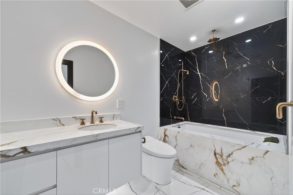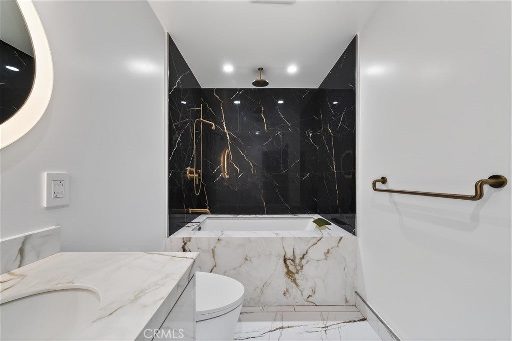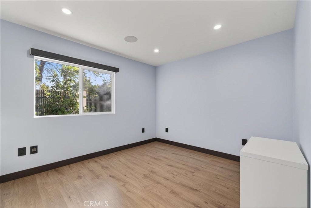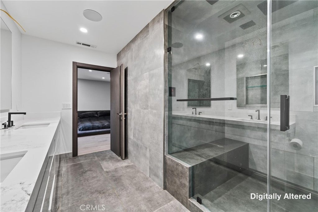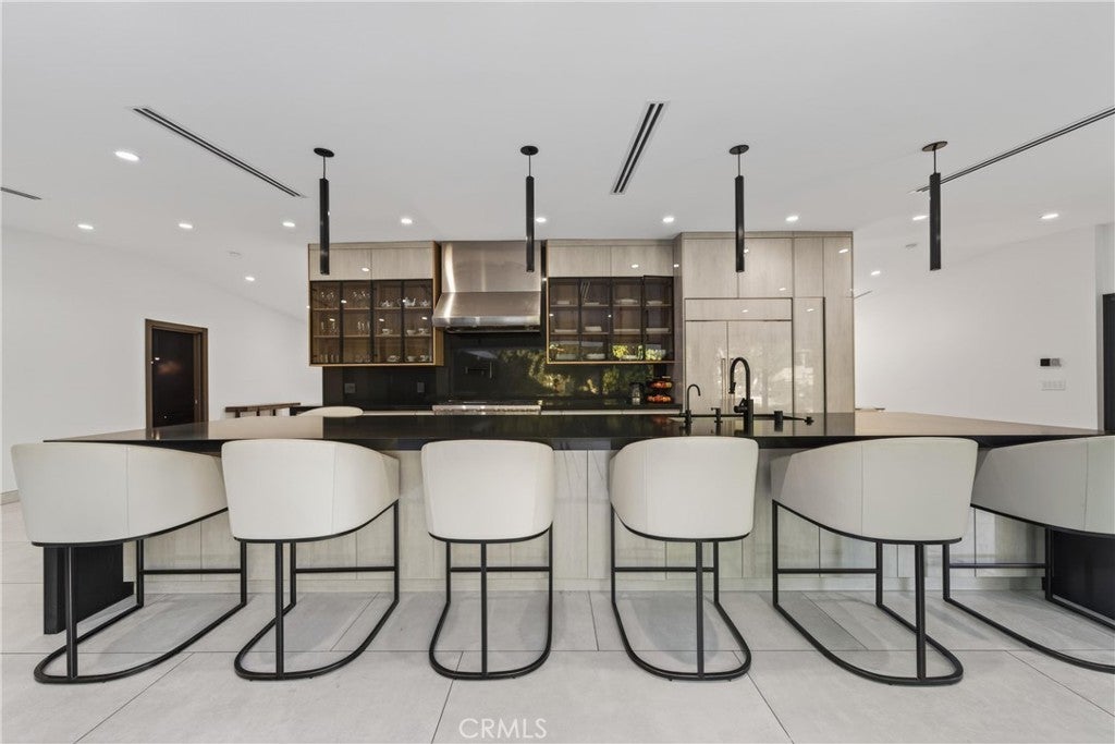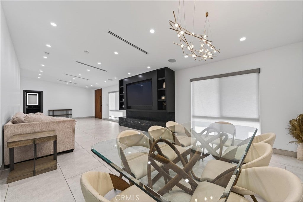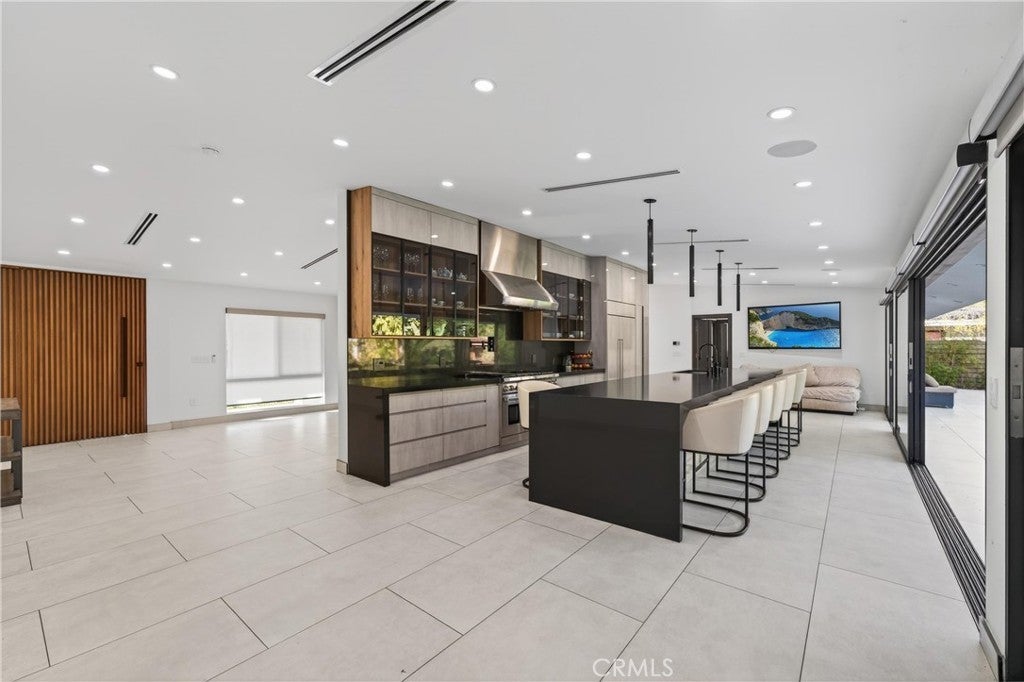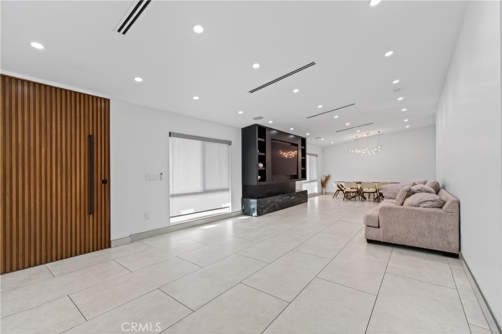 Welcome to this fully renovated single-story gated estate on an approximately 0.28-acre lot, offering modern luxury and seamless indoor-outdoor living. This 2022 move-in-ready home features 5 bedrooms and 3.5 designer bathrooms with custom white tile flooring throughout the main living areas. The chef’s kitchen strikes with an oversized island, Wolf appliances, Sub-Zero refrigerator, Cove dishwasher, custom cabinetry, and premium finishes. A full wall of Fleetwood sliding glass doors opens to the private backyard, creating a true indoor-outdoor experience. The living room features a sleek electric fireplace, while the primary suite and an additional bedroom offer direct backyard access. The primary bedroom includes a walk-in closet and spa-inspired bath with aromatherapy steam shower and smart bidet. Bathrooms are individually designed, including one with a jacuzzi tub and another with dual indoor-outdoor access, ideal for pool use. The backyard offers a resort-style pool with waterfall, lush landscaping, built-in speakers, room for an ADU, and gated rear access. Additional highlights include new plumbing, electrical, HVAC, whole-home water filtration, integrated sound system, security cameras, and an oversized garage with custom cabinetry and loft storage.