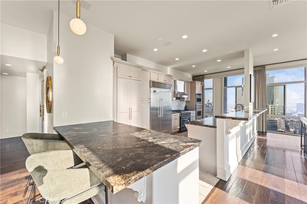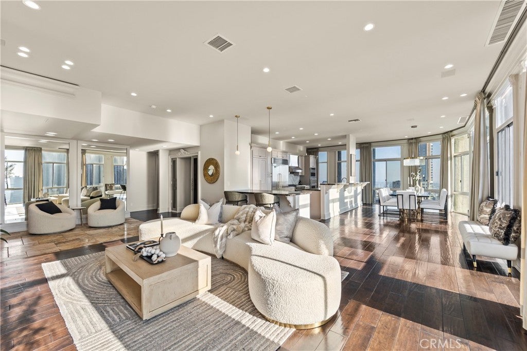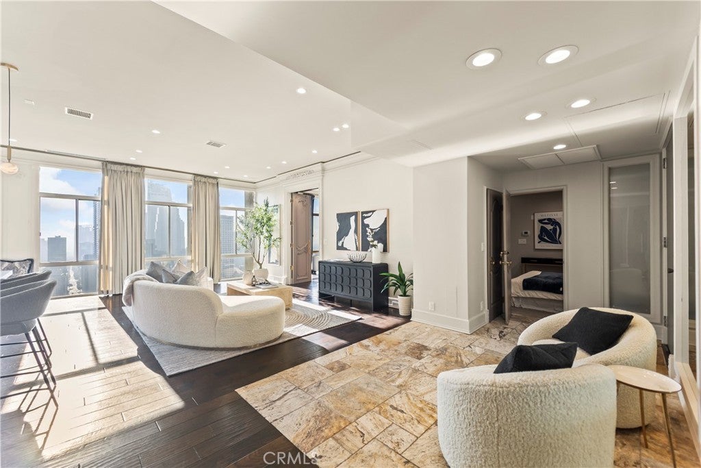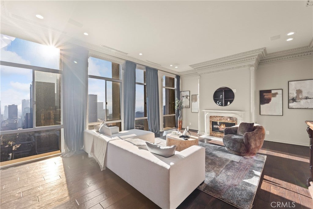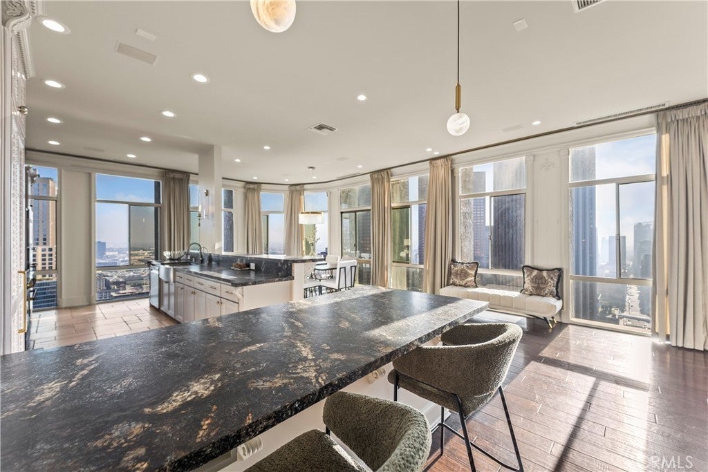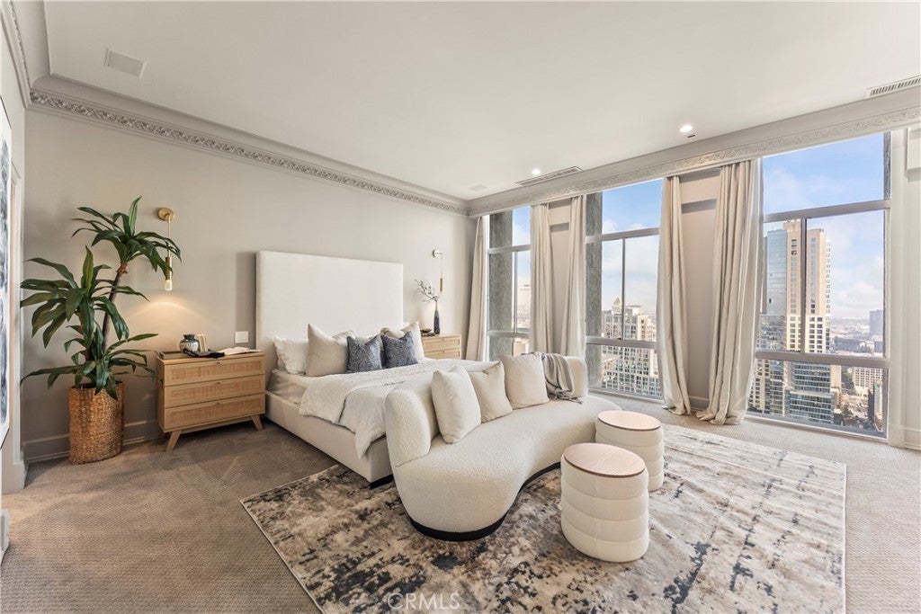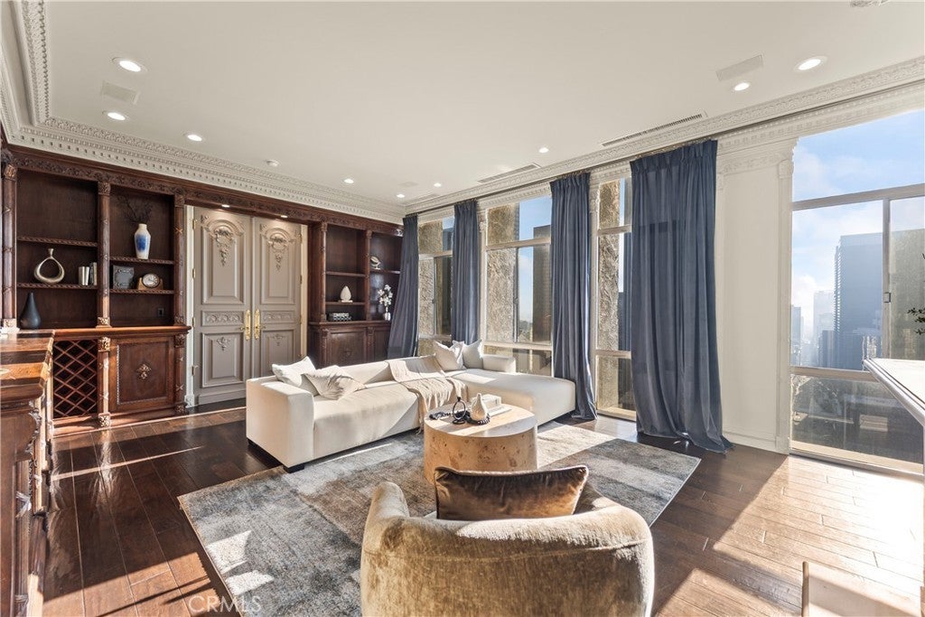 Luxury Live Auction! Bidding to start from $1,100,000! High above the cultural heart of Downtown Los Angeles, this Penthouse at Bunker Hill Tower occupies a rare vantage point—an aerie suspended on the 32nd floor, where the city’s skyline becomes both backdrop and art. Recently refreshed in a refined neoclassical palette, the residence blends timeless architectural lines with the openness and light only a true penthouse can offer. Inside, soaring ceilings, exclusive to the top floor, create a sense of vertical drama. Soft architectural detailing, graceful moldings, and beautifully scaled rooms evoke an understated luxury not often found in contemporary high-rise living. Walls of glass pull the city inward, offering uninterrupted views that shift from morning clarity to evening glow. A thoughtfully composed floor plan provides two spacious en-suite bedrooms, two and one-half baths, and a library/den with a built-in wet bar, ideal for quiet study or intimate gatherings. The expansive living and dining areas invite both grand entertaining and elegant everyday living. An in-unit washer/dryer adds modern convenience rarely available in the building. Bunker Hill Tower is one of Los Angeles’ most enduring full-service addresses, offering an array of amenities more akin to a private resort: a 24-hour concierge, Olympic-size pool, spa, two fitness centers, wet and dry saunas, tennis and pickleball courts, lush outdoor spaces, BBQ areas, and a residents’ market and salon—all seamlessly integrated into daily life. With all utilities included in the HOA, comfort and ease are woven into the fabric of ownership. Set moments from the Disney Concert Hall, The Broad, and the city’s finest dining and cultural institutions, this Penthouse is both sanctuary and statement—an elevated retreat where classical design, modern convenience, and sweeping views converge in a singular Downtown offering.
