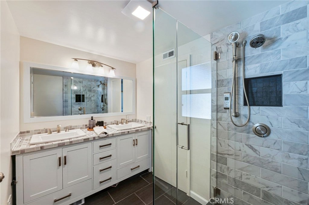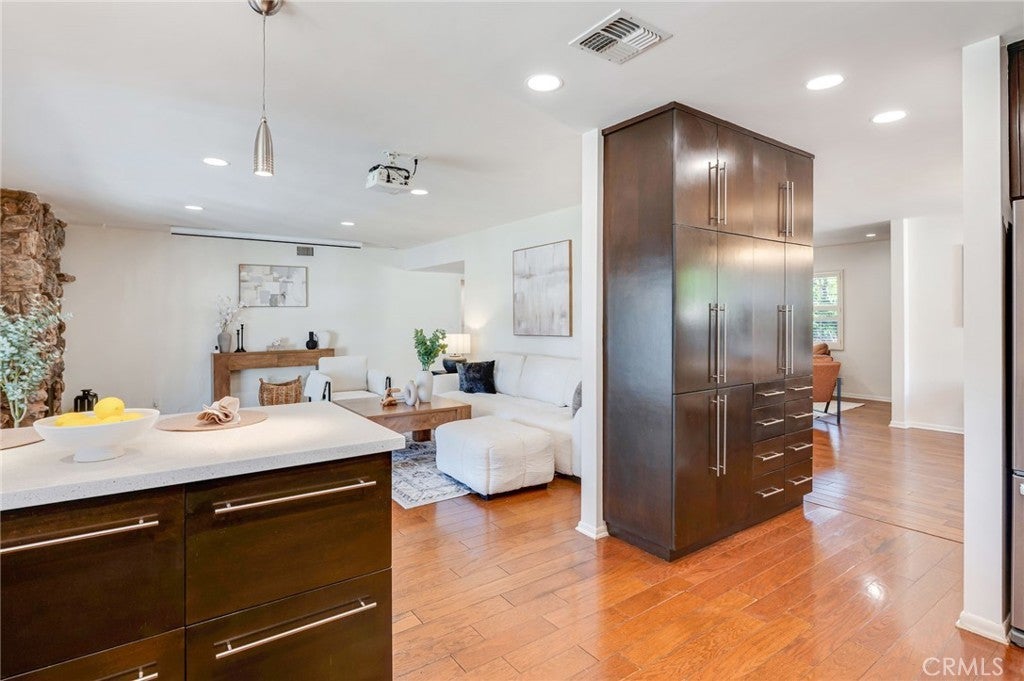 Located in the sought-after Chandler Estates neighborhood, this thoughtfully reconfigured residence blends modern flow with classic Mid-Century character. From the moment you arrive, the home impresses with inviting curb appeal, featuring a beautifully landscaped drought-tolerant native garden, a charming stone-lined walkway, and striking architectural accents. At the heart of the home is a beautifully updated gourmet kitchen, showcasing custom cabinetry, sleek countertops, stainless-steel appliances, a gas cooktop, double oven, mosaic tile backsplash, and ample counter space—perfect for both everyday living and entertaining. A large window over the sink fills the space with natural light and offers serene backyard views. The home also features a welcoming family room with floor-to-ceiling built-in bookcases and plantation shutters, along with a spacious living room highlighted by a decorative stone fireplace. The bathrooms have been tastefully updated with new vanities and modern matte-black fixtures, offering a clean and contemporary feel, and the interior has been freshly painted in a warm neutral tone, creating a bright and inviting atmosphere. Additional upgrades include extensive recessed lighting, wood flooring throughout, a newer roof, newer exterior and interior paint, and a newer sewer line with liner to the street. All bedrooms offer generous wall-to-wall closets, while the expansive primary suite serves as a true retreat, featuring rich wood flooring, recessed lighting, and abundant natural light. French doors open directly to the backyard, creating seamless indoor-outdoor living. This primary suite includes a beautifully updated ensuite bathroom complete with a dual-sink vanity and modern fixtures. The walk-in shower is finished with wall-to-wall tile and a sleek glass enclosure, adding a luxurious, spa-like touch. The backyard offers a private and tranquil retreat, beautifully landscaped with mature greenery and designed for both relaxation and entertaining. Multiple patio areas provide ideal spaces for outdoor dining and gatherings, while the lush surroundings, including fruit trees, create a serene setting. With seamless indoor-outdoor flow from the home, this space is perfect for enjoying Southern California living year-round. Conveniently located with quick access to major freeways, this home is just moments from the dining and shopping options of Ventura Blvd. and within walking distance to highly rated schools.
