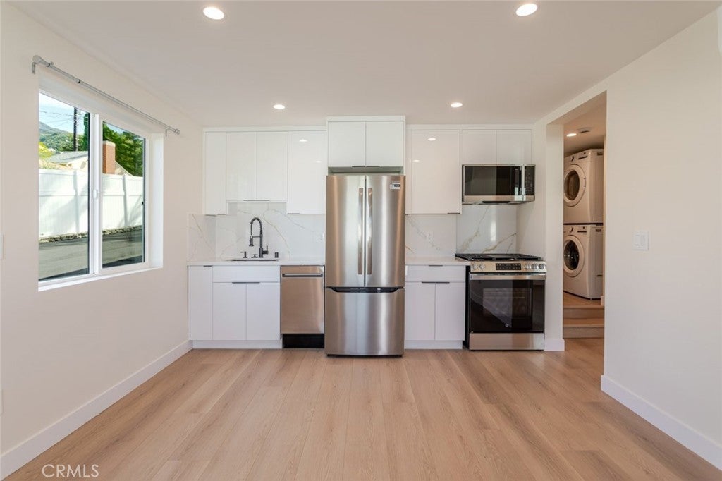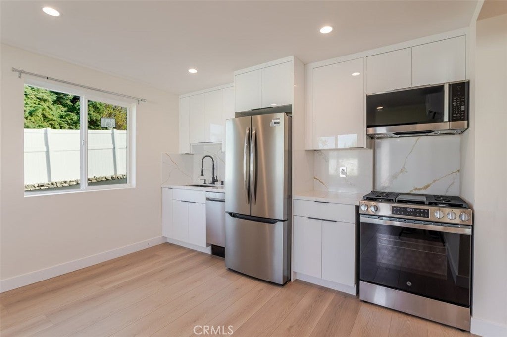 Modern and brand new Junior ADU (JADU) for lease offering 1 bedroom, 1 bathroom, and approximately 434 square feet of efficiently designed living space. This well-appointed home features a bright, open layout with recessed lighting, large windows, and contemporary flooring throughout, creating a clean and comfortable living environment. The kitchen is thoughtfully designed with sleek cabinetry, modern appliances, and ample counter space, seamlessly connecting to the living area for everyday functionality. The bedroom offers very large closet space, providing excellent storage rarely found in similar units, while the bathroom showcases updated, modern finishes. Additional highlights include in-unit laundry, efficient heating and air conditioning, and abundant natural light. The property also features a private one-car garage, adding convenience, security, and extra storage.
