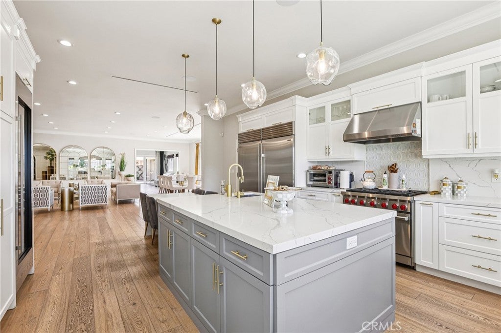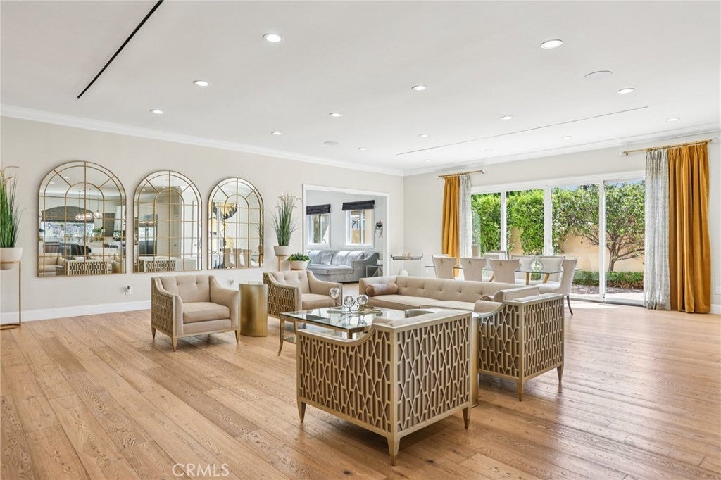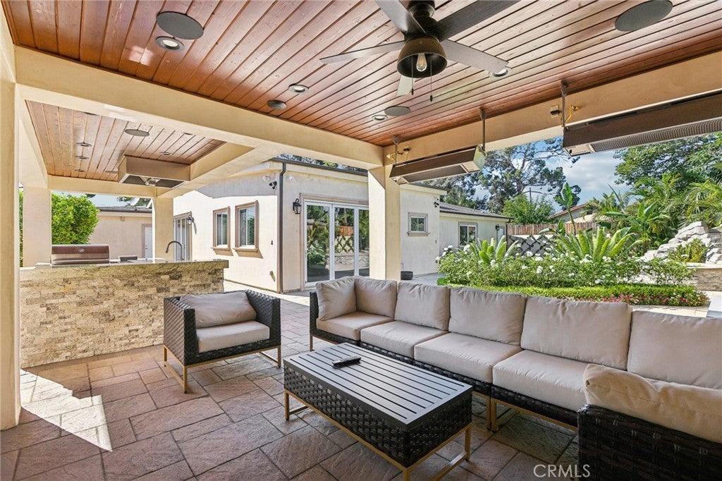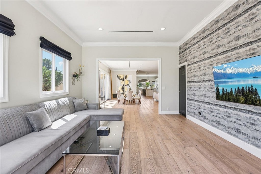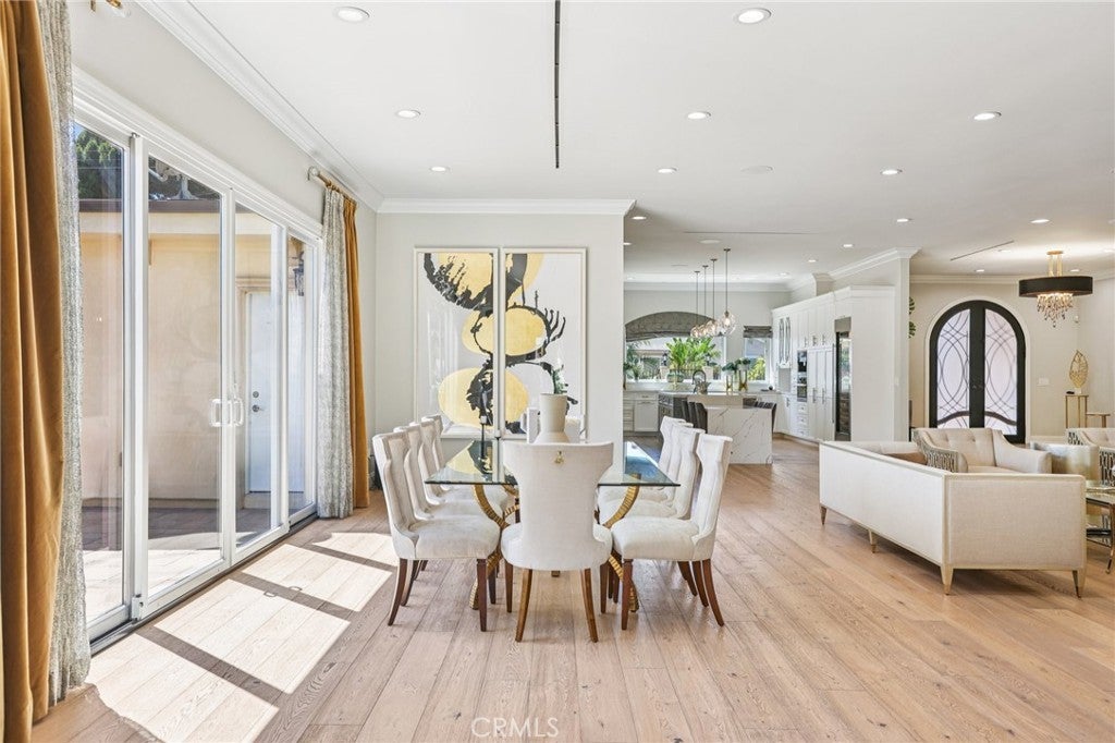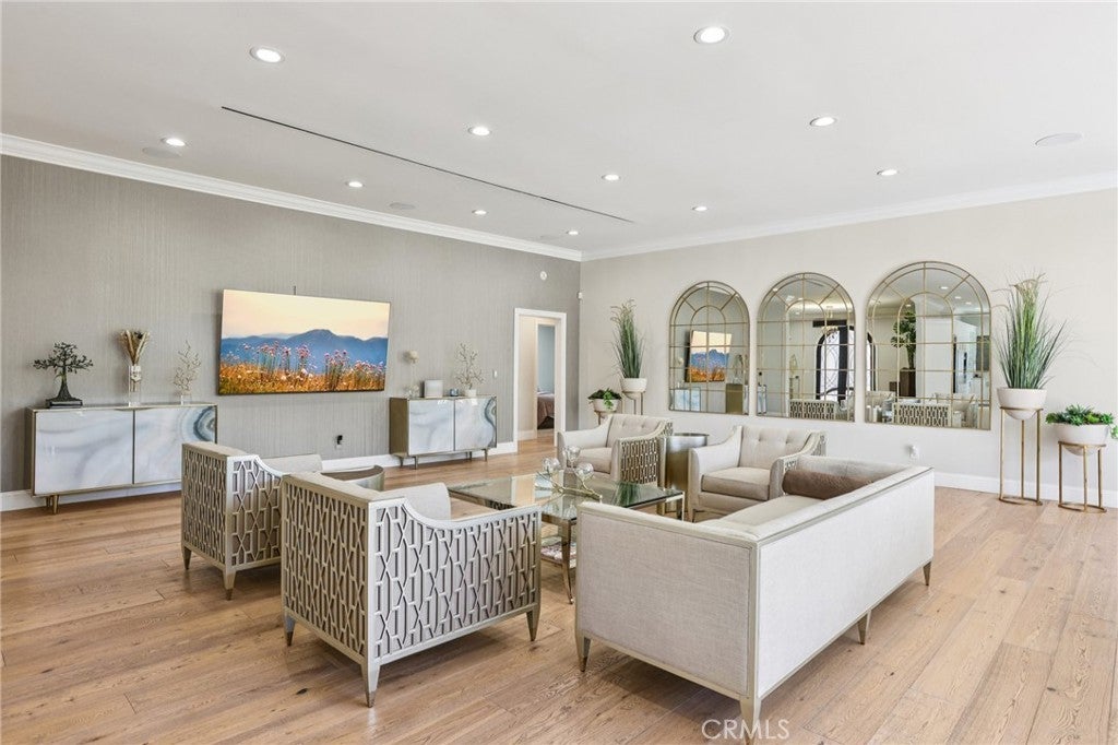 Welcome to 6850 Longridge Ave, a tastefully reimagined Mediterranean style villa featuring 3,450 sqft of living space designed with a light-filled, open floor plan ideal for large gatherings situated on an expansive 11,600 sqft lot! Upon entry you are greeted with an abundance of natural light, high ceilings, recessed lighting, and rich hardwood flooring seamlessly connecting the living room, kitchen, and family rooms. The chef s kitchen boasts an extended center island w/ additional seating, high-end stainless appliances, wine cooler, and plenty of cabinetry. The spacious primary bedroom features a spa-like en-suite bath and roomy walk-in closet with custom built-ins. A secondary bedroom also features an en-suite bath and the third bedroom is paired with a private bonus room. Both the interior & exterior of the home are wired with a high-end audio system catering to audiophiles for the ultimate listening experience. For those who love spending time outdoors, a resort-style backyard paradise awaits. Surrounded by palm trees, the covered patio & BBQ area overlooking the glistening pool, spa & firepit makes this an ideal, private setting for gatherings day or night. Additional highlights include a spacious garage w/ ample storage space to accommodate any buyers needs while the circular driveway can support parking for large families. Don't miss this one-of-a-kind home blending sophistication, comfort, and unforgettable entertaining spaces.