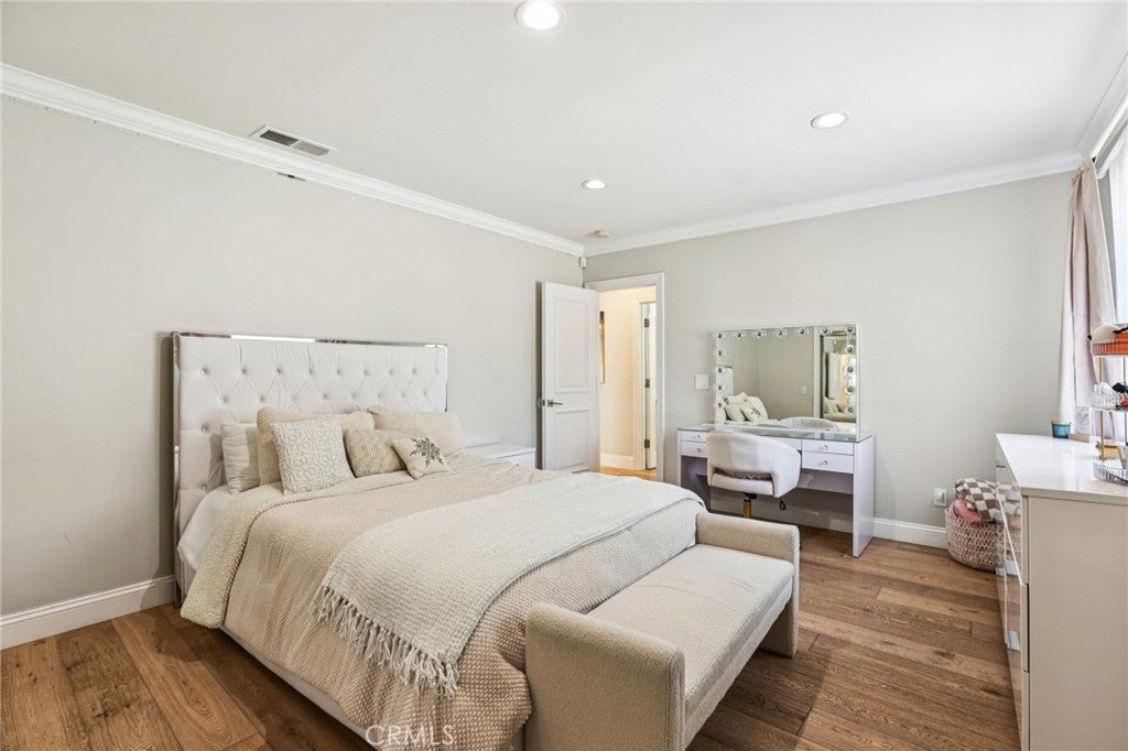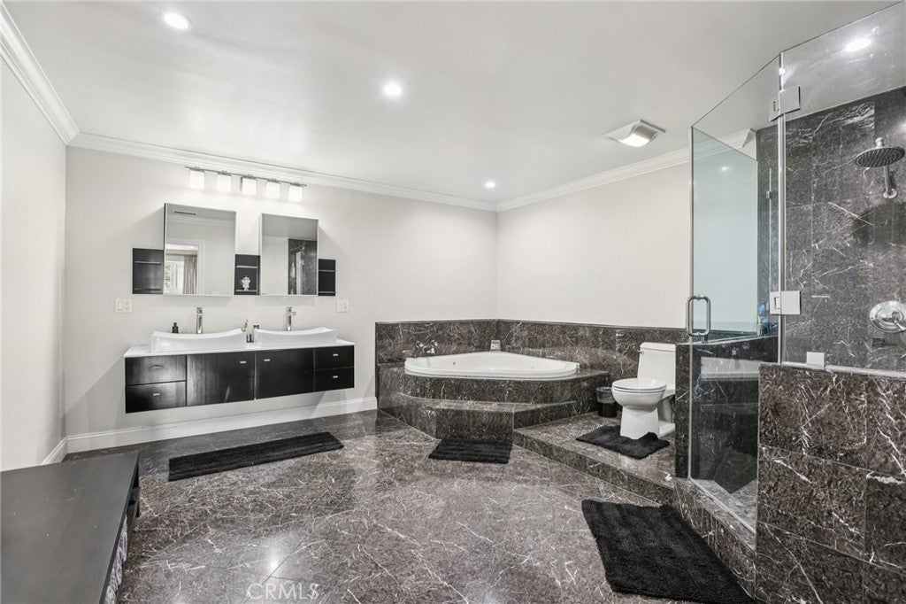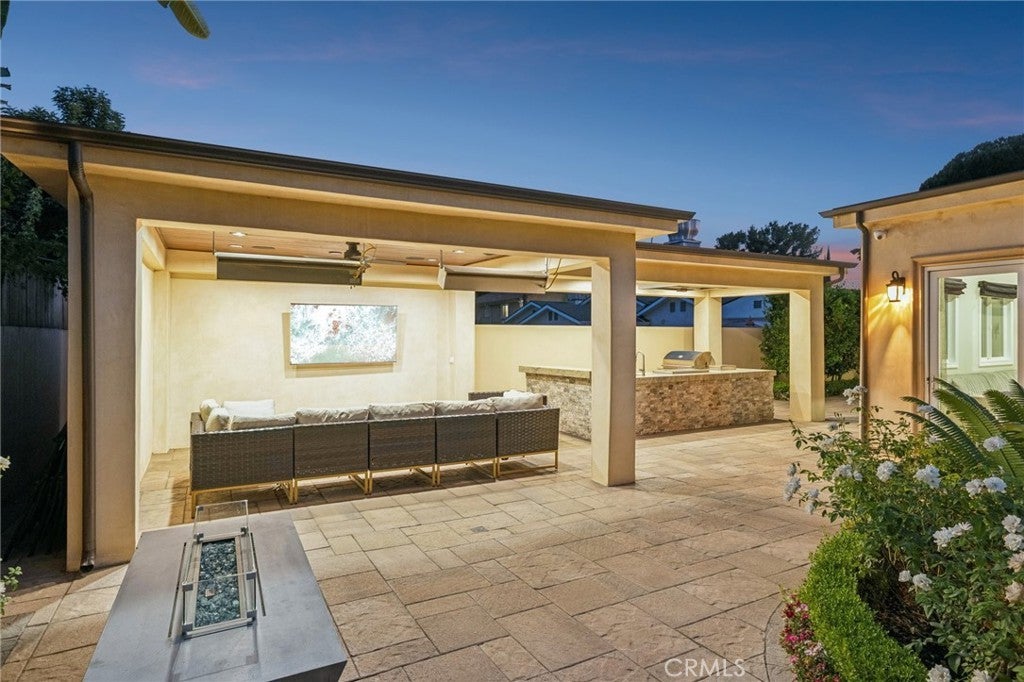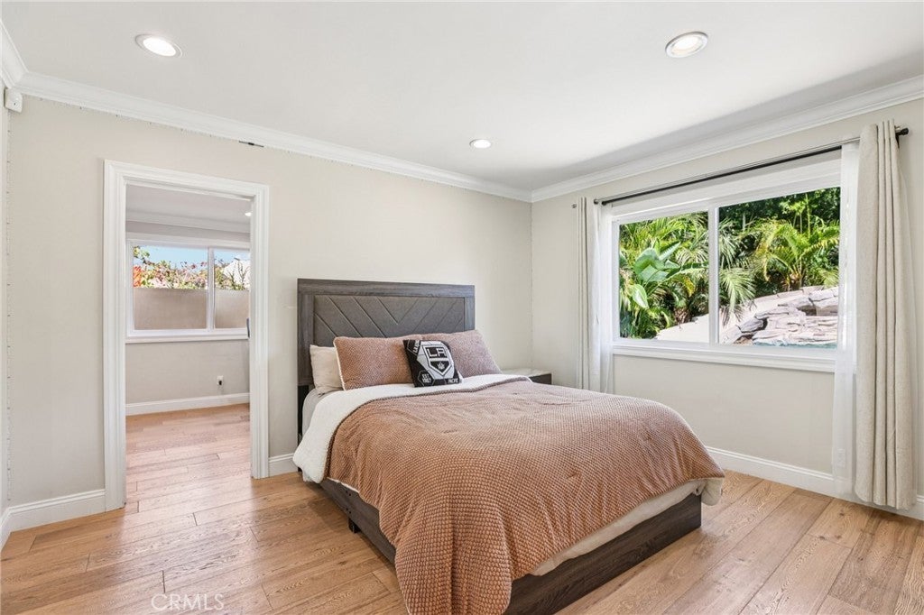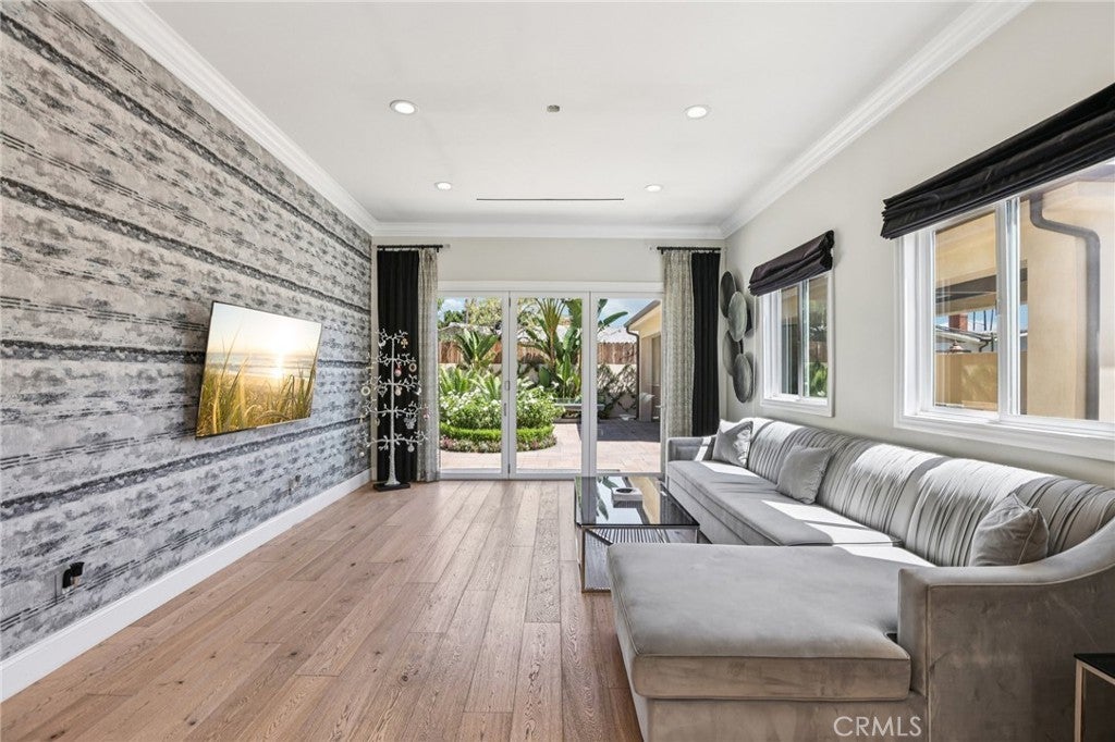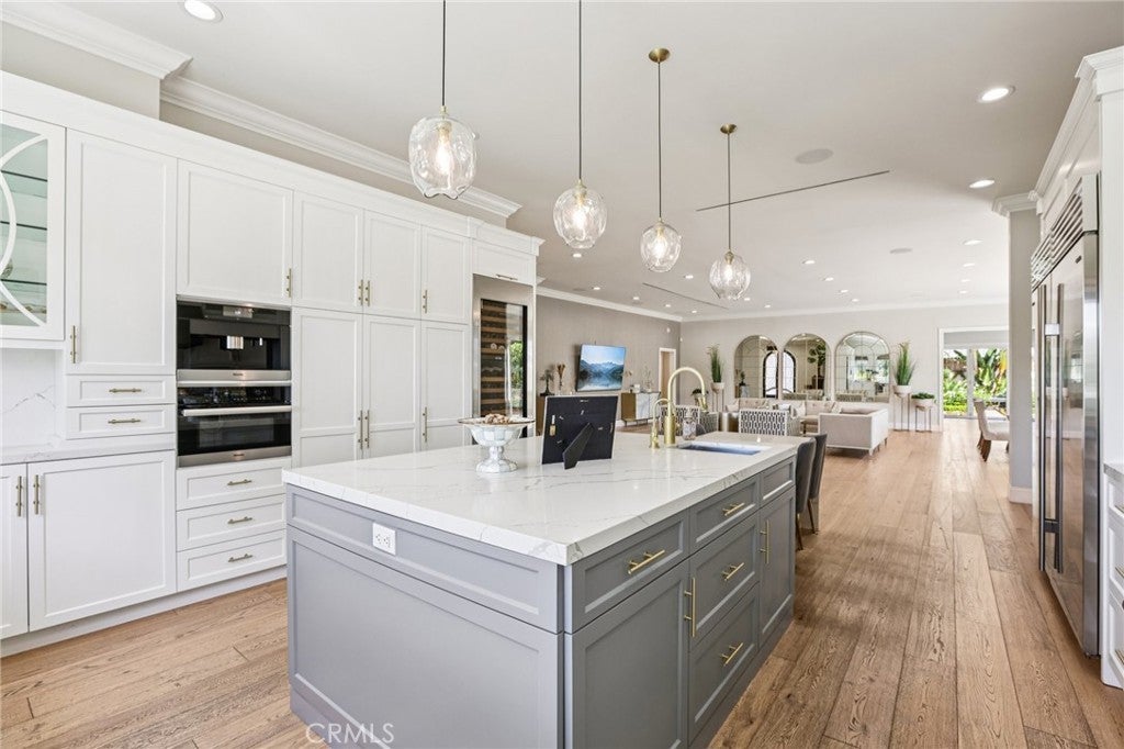 Welcome to 6850 Longridge Ave, a tastefully reimagined Mediterranean style villa featuring 3,450 sqft of living space designed with a light-filled, open floor plan ideal for large gatherings situated on an expansive 11,600 sqft lot! Upon entry you are greeted with an abundance of natural light, high ceilings, recessed lighting, and rich hardwood flooring seamlessly connecting the living room, kitchen, and family rooms. The chef s kitchen boasts an extended center island w/ additional seating, high-end stainless appliances, wine cooler, and plenty of cabinetry. The spacious primary bedroom features a spa-like en-suite bath and roomy walk-in closet with custom built-ins. A secondary bedroom also features an en-suite bath and the third bedroom is paired with a private bonus room. Both the interior & exterior of the home are wired with a high-end audio system catering to audiophiles for the ultimate listening experience. For those who love spending time outdoors, a resort-style backyard paradise awaits. Surrounded by palm trees, the covered patio & BBQ area overlooking the glistening pool, spa & firepit makes this an ideal, private setting for gatherings day or night. Additional highlights include a spacious garage w/ ample storage space to accommodate any buyers needs while the circular driveway can support parking for large families. Don't miss this one-of-a-kind home blending sophistication, comfort, and unforgettable entertaining spaces.