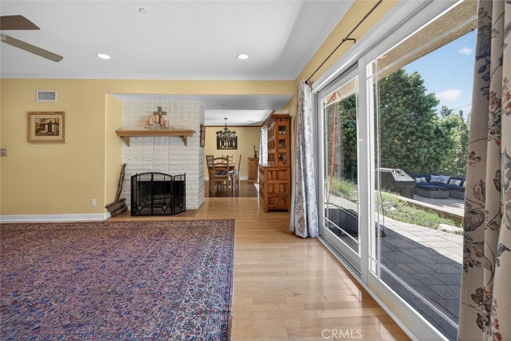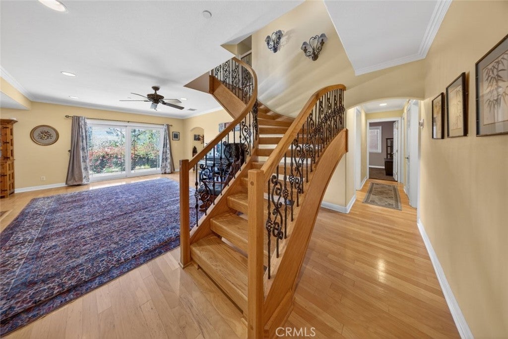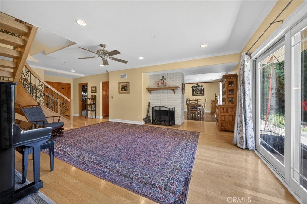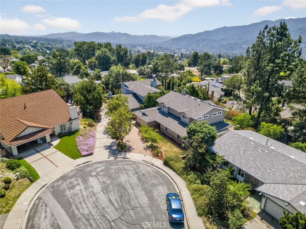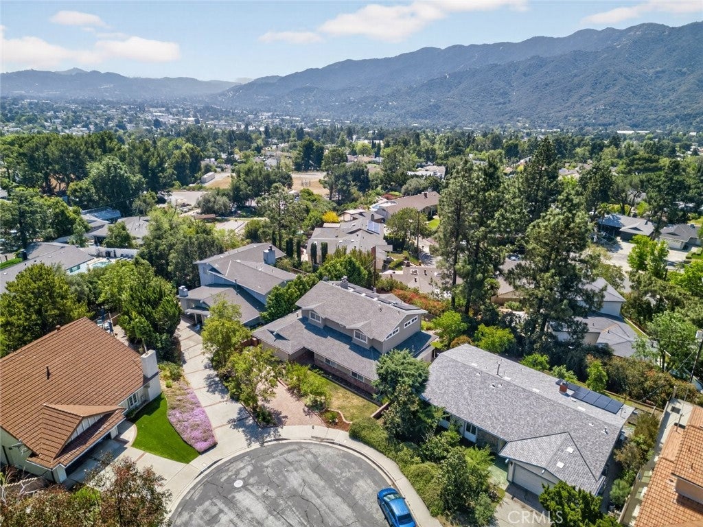Welcome to this beautifully maintained two story home, set on a quiet cul de sac above Foothill in the heart of La Crescenta, one of the area's most sought after neighborhoods. A charming stone paver driveway greets you, providing both curb appeal and ample parking, accented by rose bushes and fruit trees. With 3,073 square feet of living space, this impressive home features 5 bedrooms and 3 full bathrooms. The layout includes 2 bedrooms upstairs and 3 downstairs. Upon entry, you are welcomed by an open living area highlighted by abundant natural light, warm wood flooring, recessed lighting, and a stunning curved staircase that serves as a striking architectural focal point. The living room features a fireplace and sliding doors that open to the backyard, further enhancing the bright and airy atmosphere. The family room offers an inviting space with a large entertainment center ideal for media and storage. The well appointed kitchen boasts ample cabinetry, generous island with seating, and a layout ideal for cooking and entertaining. Adjacent to the kitchen, the dining area showcases sliding glass doors that elegantly integrate the indoor space with the backyard setting. The generously sized primary suite offers a serene escape, with a fireplace, a large walk in closet, and a balcony overlooking the backyard with scenic mountain views. The primary bathroom offers a double vanity, a bathtub, and sunlit windows. Enjoy the private backyard, which includes a patio for dining and entertaining, a lush grassy area, scenic hillside views, and a dedicated dog run. Additional highlights include a 2 car attached garage, paid off solar panels for energy efficiency, and fire sprinklers. This home offers an exceptional location in the foothills of La Crescenta, close to award winning schools. Welcome home!