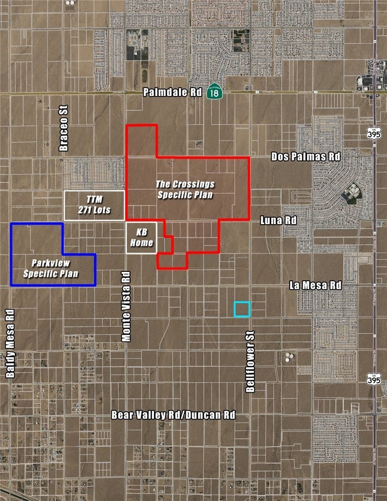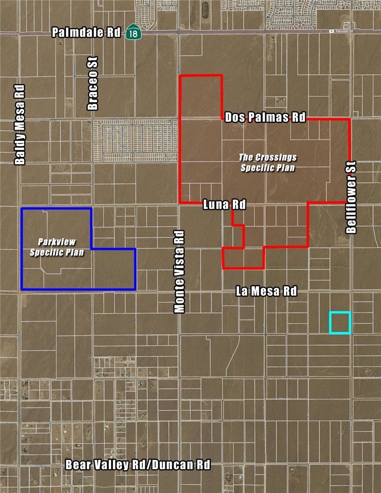8.91 ac Mixed Use land located in West Victorville at the Northwest corner of Bellflower St and Nyack Rd. This area is primed as the next major residential development hub. 80 ac at Monte Vista and Luna has a vested TTM for 269 lots. KB Home recently resubmitted a 135 lot TTM on 40 ac at Luna & Monte Vista. Two massive Specific Plans encompass this area, The Crossings, comprised of plans for 2,656 lots on 449 ac, and Parkview Specific Plan, comprised of plans for 715 lots on 177 ac. This is a great opportunity to acquire prime location land in this area before it eventually is built out. Property is located 1/2 mile from exisitng housing along Hwy 395 to the East, and 660 ft from La Mesa Rd. Bellflower St and La Mesa Rd will be major thoroughfairs when this area is built out. Mixed Use will allow commercial, multi-family and flex uses. This is a great opportunity to acquire land in this area before it eventually is built out.