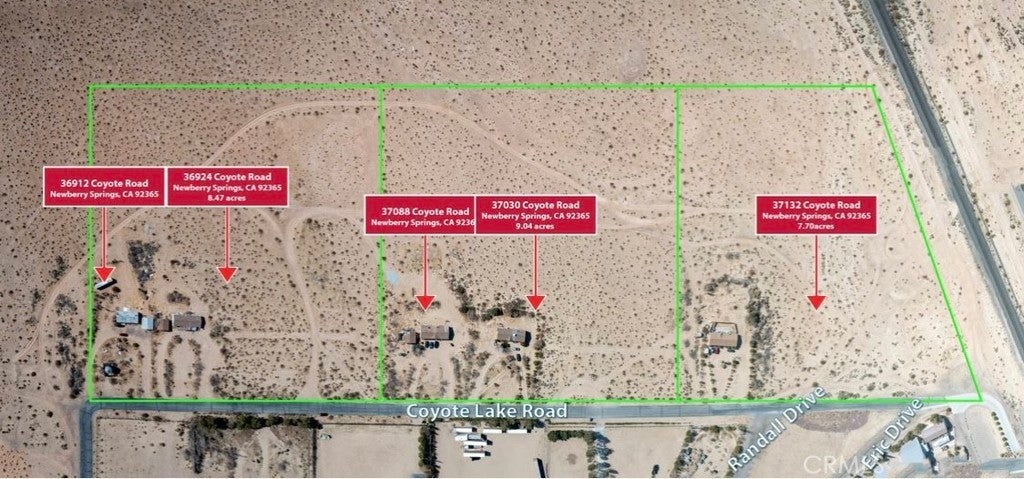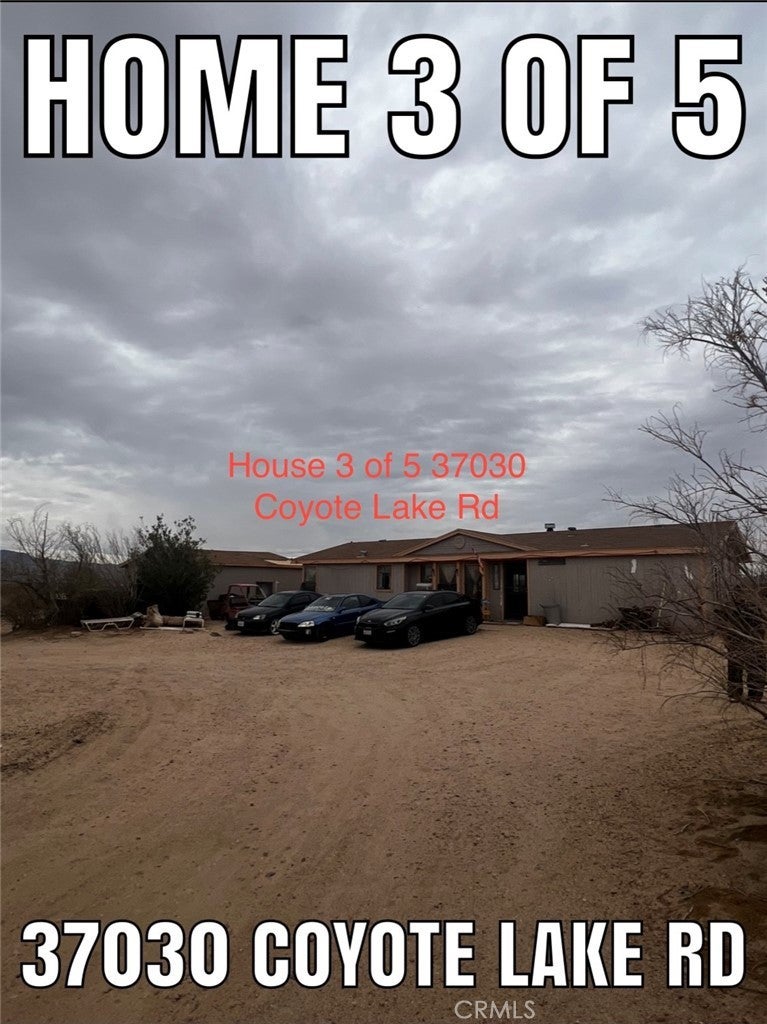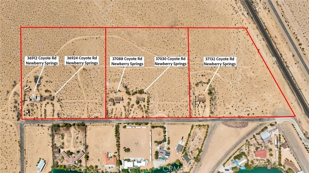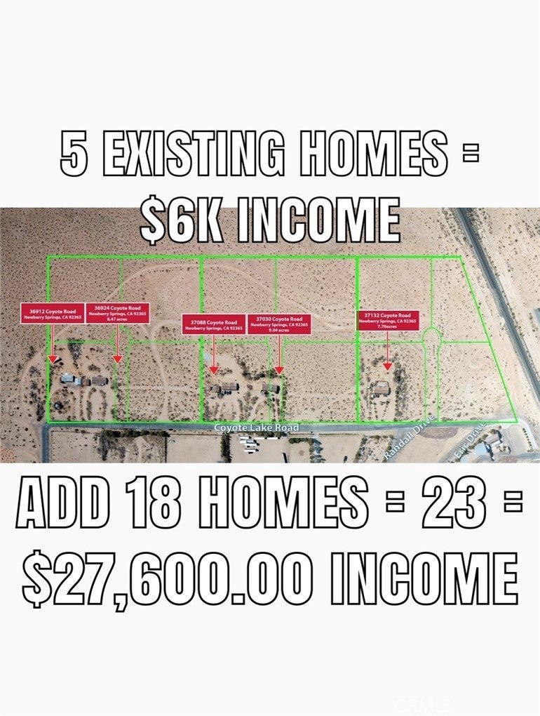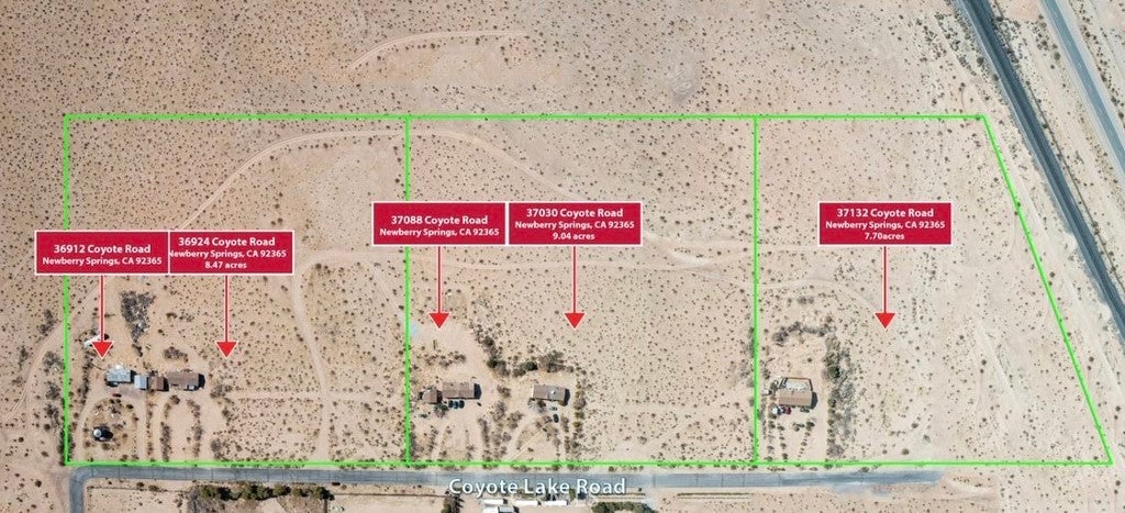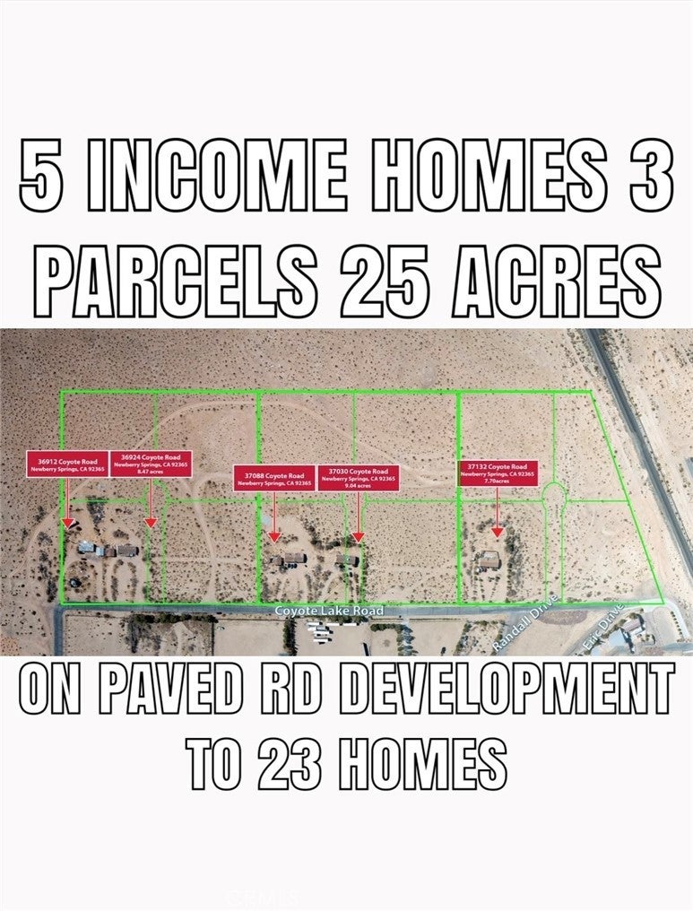 FIVE CASH FLOWING HOMES (3 of 5 Newly Renovated) 5 Homes on 25 Acres (3 Parcels) *SELLER MAY CARRY (INQUIRE) 25 ACRES 3 PARCELS (Subdivide Ready) to 4 Lots Each (Commonly Approved In This Area *Add 19 Homes (Totaling 24 Homes) Paved Coyote Lake Rd Coyote Lake Water System Underground Power Access Archeological Report Done 36924 (Newly Renovated As of November 2025) -New Roof -New Kitchen -New Bathrooms -New Stove & Microwave -New AC (Evaporative System) -New Insulated Garage Door -New Floors Thruout -New Paint (Interior) 37088 Also Newly Renovated Addresses; 36912 & 36924 (APN# 0538-261-04-0000), 37030 & 37088 (APN# 0538-261-03-0000) & 37132 (APN# 0538-261-02-0000) Coyote Lake Road. Paved access and Paved Road. Inquire on 2 of 3 or 1 of 3 Parcels (3 of 5 Houses) These parcels of land totaling 25 plus acres are on prestigious Coyote Lake Rd in Newberry Springs, California. As the original developer of Crystal Lake holds these cash flowing assets with great potential to 24 total homes - this opportunity is unparalleled. Situated on paved Coyote Lake Rd and connected to the Coyote Lake Water System, these parcels are ready for immediate utility access, making development a seamless process. Splitting these parcels into 4 lots and each having two homes is what's already commonly done here and you wont have to deal with the added subdivision red tape. An archeological study has been completed, providing peace of mind for any future endeavors. The subdivision potential is immense, with the possibility to create 9 approximate 2.77-acre lots. Each of these lots has the potential for two homes, allowing for a total of 18 new homes to be placed or built. 23 income-producing properties IS generational financial windfall. Residents can enjoy their horses, ride their toys to The Mojave River Basin directly from their homes under majestic sky and mountain views or also enjoy hikes and camping at Calico Ghost Town Regional Park. Calico Ghost Town was Designated a California Historical Landmark in 1962. Only 90 Minutes from both Vegas or Laughlin. Whether you're an investor seeking a lucrative income stream or a developer with grand visions, this property offers endless possibilities. Embrace the chance to shape this pristine land into a thriving community or an exclusive estate. Don't miss out on this remarkable chance to own a piece of Newberry Springs history and create something truly extraordinary.