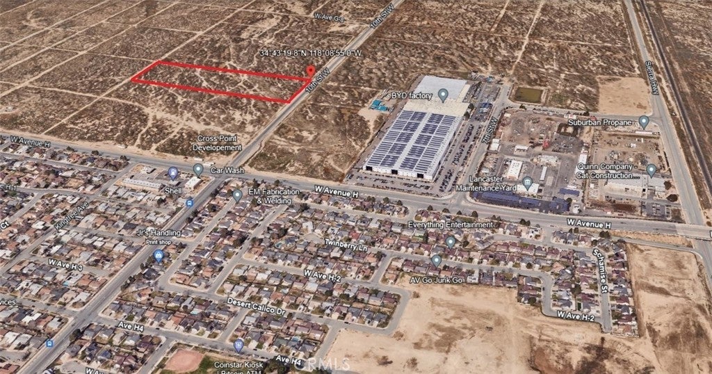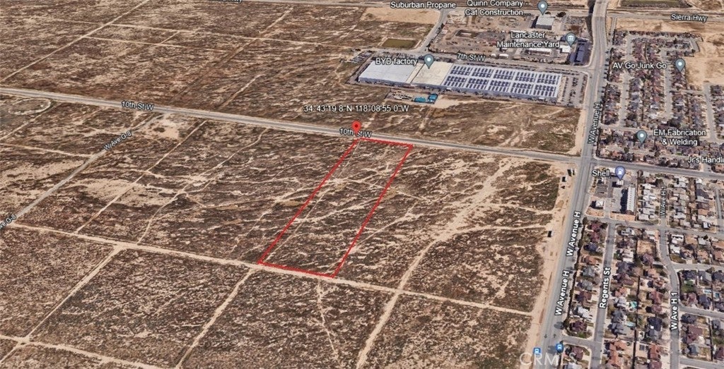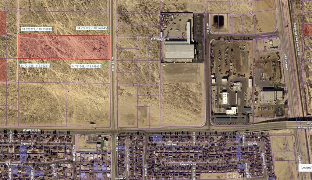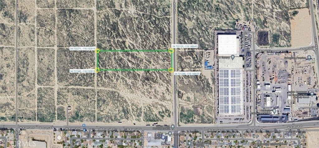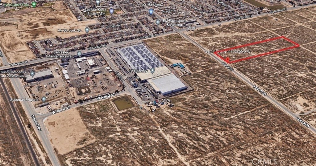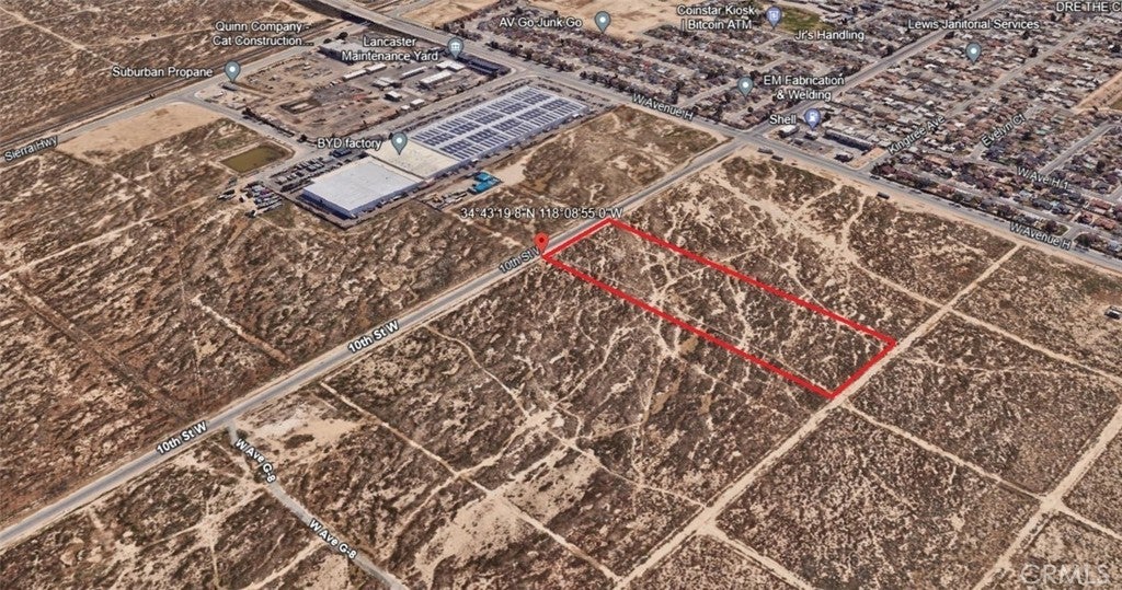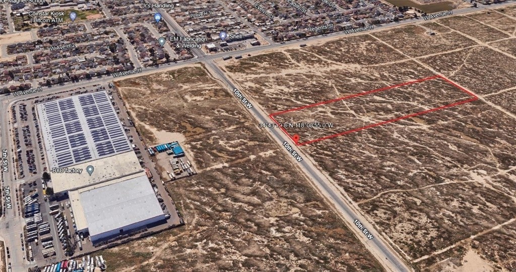 The address is approximately 46135 10th St W, Lancaster, CA 93534 The subject property is 9.85+- acres of light industrial property with 320+- feet of paved road frontage on 10th St W. Electricity, water, and sewer is on front of the property on 10th St W. The potential of this property is astronomical. Some of the commercial uses in the industrial zone areas are but not limited to: Aircraft-Related Uses, Automobile boat, vehicle, tractor dealerships, body repair, building trades, communication facilities, food manufacturing and storage facilities, general manufacturing, high technology research and development, warehousing and storage, emergency shelters etc. Please see the zoning document or the broker can send you a copy of the allowed uses in the light industrial area. This is also near major employers in the Antelope Valley such as NASA, Boeing McDonnell Douglas, Virgin Galactic, Mojave Air and Space Port, Lockheed Martin, Northrop Grumman, BAE Systems, EM Aero Space, Palmdale Regional, BYD Electric Bus Terminal, AV Fair Event Center, the Antelope Valley College, West Wind Computer Science Magnet School, etc. Directions: From the gas station at 45689 10th St W, Lancaster, CA 93534, start at the corner of W Avenue H and 10th St W and go north on 10th St W for 955 feet .18 of a mile and the lot is on the west side of the street. You will be at the southeast corner. The GPS coordinates are (please enter these in the address section of maps in your smart phone and it will take you to the locations): NW front: 34.722129, -118.148645 SW front: 34.721248, -118.148635 NW rear: 34.722271, -118.152819 SW rear: 34.721345, -118.152819