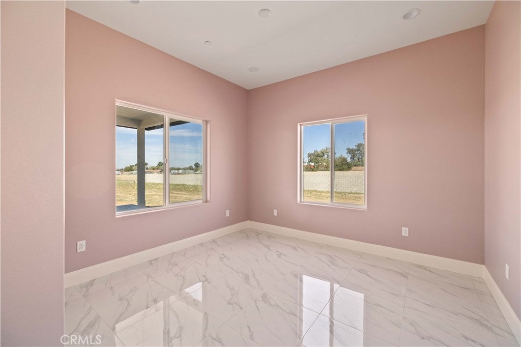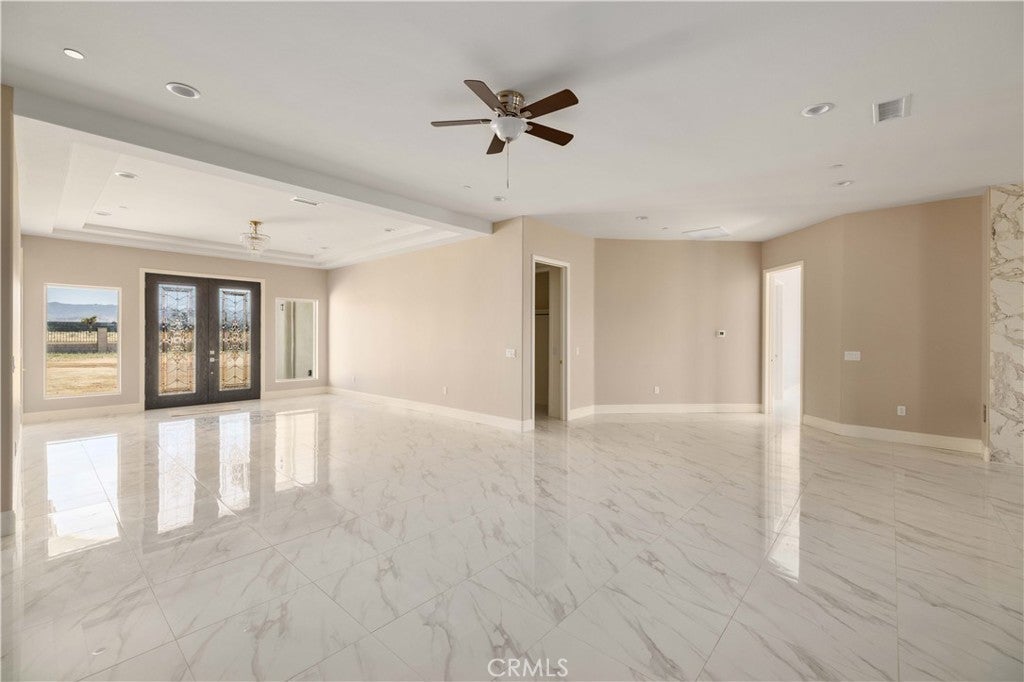 This custom home is in a rural area with room to raise horses and other animals. It is freeway close to commute. Enter through the custom glass doors to an open concept entry, living room, and dining room. The kitchen features two islands, dual ovens, five burner stove, wine cooler, and walk in pantry. Casual dining can be set up at one of the islands. The dining area is nearby with access to the covered patio. The fireplace is placed so that the large screen flat screen television can be placed on the wall above it. There are two primary bedrooms with on-suite bathrooms; another two bedrooms share a Hollywood style bathroom; and, one bedroom can be used as a guest room, den, studio, and much more. There is a bathroom nearby. The floors are exceptional with a custom medallion in the entry. Got vehicles? There are two - two car garages; one on each side of the house. One has additional space for a work bench and tools. The lot features extra room to build a pool area. And beyond that can be the area for animals. The solar system is paid. Front landscaping is in process.