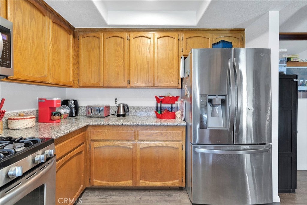 Welcome to this exquisite 4-bedroom home, ideally situated on a beautifully landscaped corner lot at the end of a peaceful cul-de-sac. Just minutes from the freeway, this location offers easy access for commuting while maintaining a quiet, residential charm. From the moment you arrive, you’ll appreciate the lush front yard with manicured grass, vibrant flowers, and mature trees, all framed by a spacious concrete driveway that allows for extra parking. An automatic security gate leads to additional covered parking, perfect for guests, toys, or extra vehicles. Inside, the home shines with laminate flooring throughout, ceiling fans in every room, and central air and heat for year-round comfort. The generous 2.5-car garage offers ample storage, and the extra half-car space presents the perfect opportunity to create a 5th bedroom and indoor laundry room. The heart of the home is a gourmet kitchen complete with granite countertops, stainless steel appliances, and modern cabinetry — a dream for home chefs and entertainers alike. The spacious living room features a cozy fireplace, perfect for relaxing evenings at home. Step out back to a large covered patio, ideal for outdoor dining, lounging, or entertaining. The backyard offers space and privacy, ready for your finishing touches. This move-in ready gem has it all — comfort, convenience, and curb appeal — and is just waiting for you to call it home!