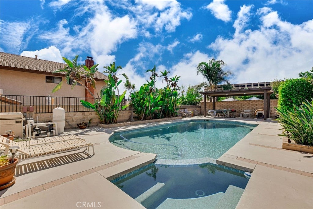 ***Spacious and Inviting Home with Pool & Spa!*** This beautifully designed home features a welcoming double-door entry leading into a spacious floor plan. Step down into the cozy family room with a fireplace, seamlessly connected to the open kitchen and dining/formal living area—perfect for entertaining or relaxing. A wide hallway leads to four generously sized bedrooms. Step outside to enjoy the in-ground pool and spa, huge, covered patio, and a large cement deck area ideal for gatherings or private retreats. The private backyard is enclosed by a block wall for added privacy. Additional highlights include a tile roof and excellent indoor-outdoor flow. Located in well-established neighborhood a plus!!