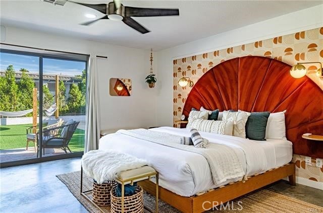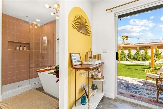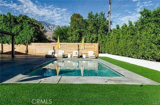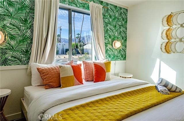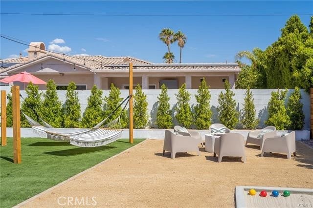 The spacious, well-kept neighborhood is just minutes from downtown Palm Springs, allowing you to enjoy everything the city has to offer year-round. COME HOME- to pure AURA, an inspiring retro vibe 3 Bedroom, 2 Bath, Pool Home. The open floor plan is complemented by polished concrete floors and allows for plenty of natural light. ALL 3 of the bedrooms are spacious. The master bedroom features a walk-in closet, and the master bathroom is complete with a luxurious free-standing tub. ALL Our beautifully remodeled bathrooms features walk-in showers and vanities with plenty of storage. Stainless steel appliances are featured in the stunning open kitchen leading to the back patio.Step outside to enjoy the resort-style backyard. It has a fully fenced, private yard, with plenty of places to relax just off the kitchen slider.In this outdoor dining pergola, a desert landscape wall mural provides a backdrop to your dining area, equipped with a ceiling fan. Take a dip in the refreshing pool surrounded by a built-in gas firepit and sand bocce ball court. The home is equipped with solar panels, making it extremely energy-efficient.