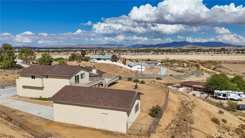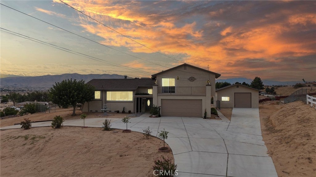 Boasting expansive, unobstructed views of the Mojave River and Marianna Mountains, stretching toward Big Bear, this 2,384 sq ft, Tri-level home is a haven for those seeking tranquility and natural beauty, in a convenient location. Set on nearly an acre, the freshly painted 3 bedroom, 2.5 bath custom home features many classic design elements, including beautiful exposed beams, a brick hearth with wood-burning stove, a gorgeous stone fireplace, and a floor plan that maximizes space and functionality. "Flex" Room off of family room/kitchen has endless possibilities, such as, 4th bedroom, office, music, exercise, sun room, etc! Dramatic, oversized bay windows frame the breathtaking views and flood the home with natural light. Outside, enjoy two large decks, plus a front balcony off of the Master bedroom, and a rear covered patio perfect for relaxing or entertaining. A large circular driveway leads to a detached RV garage with a side glass slider and overhead door, with ample space for a boat, RV, cars, or a workshop. This oversized garage is a dream for hobbyists, complete with extensive shelving. Horses are invited too! This property is zoned for up to 3 horses, as it's a perfect location to go on relaxing rides along the riverbed! Located approximately 3 minutes from Bear Valley, and just minutes from the vibrant Jess Ranch Shopping Center, you’ll have easy access to excellent restaurants, a movie theater, home improvement stores, grocery stores, and more. Located at the end of a very low-traffic street, this home combines the best of secluded country living with modern conveniences, making it a rare find in Hesperia. Don’t miss the opportunity to own this exceptional property with unparalleled views and endless possibilities!
