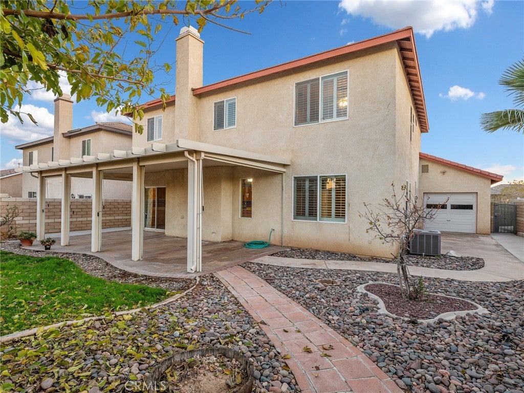 SPACIOUS TWO-STORY HOME WITH FIRST-FLOOR SUITE, LOFT & 3-CAR GARAGE — NEAR SCHOOLS & FREEWAY. This well-designed two-story home offers a versatile layout with space to live, work, and gather comfortably. Featuring approximately 2,696 sq ft, the floor plan includes a convenient first-floor mini suite, ideal for guests, extended family, or a private home office. The heart of the home is the open kitchen, which flows seamlessly into the family room with a fireplace, creating a warm and inviting space for everyday living and entertaining. Throughout the home, plantation-style shutters add both style and energy efficiency. Upstairs, the primary bedroom suite provides a private retreat, accompanied by two additional bedrooms, a spacious loft, and a full hallway bathroom—perfect for flexible living or play space. A half bath is conveniently located near the front entry on the main level. Additional highlights include an indoor laundry room just off the garage entry with abundant storage. The three-car garage features an additional rear-facing garage door, allowing easy access to the backyard—ideal for outdoor projects or added functionality. Step outside to enjoy the covered back patio, perfect for outdoor dining or relaxing. Centrally located near shopping, freeway access, and both elementary and high schools, this home offers comfort, convenience, and a thoughtfully designed layout suited for a variety of lifestyles.