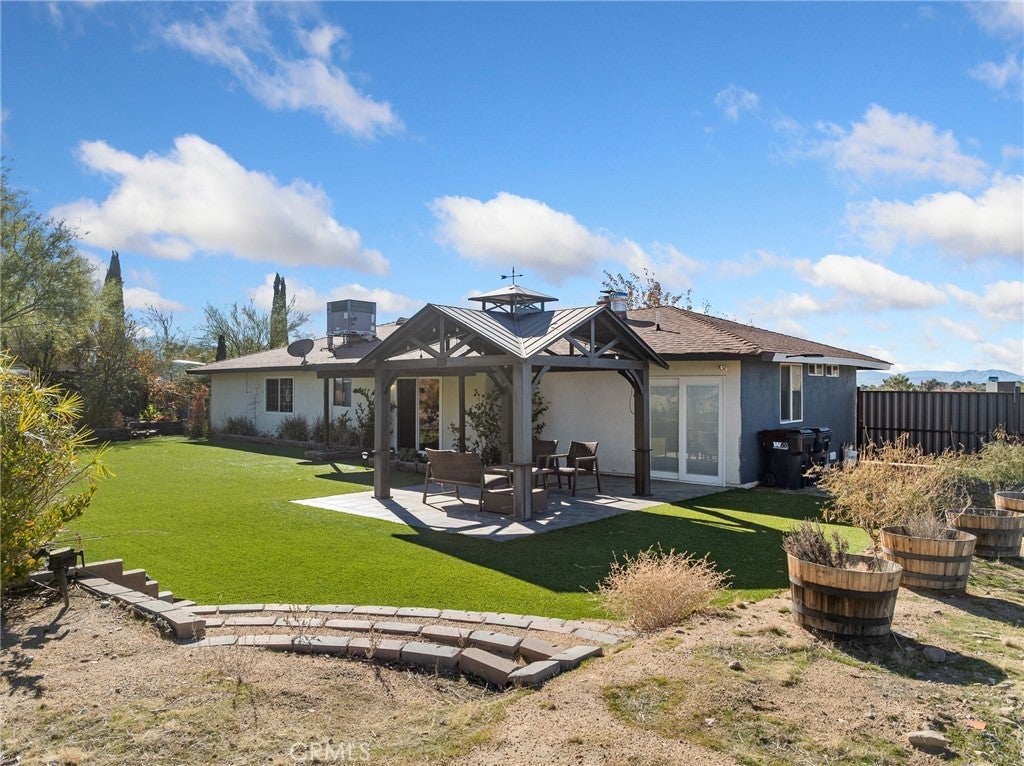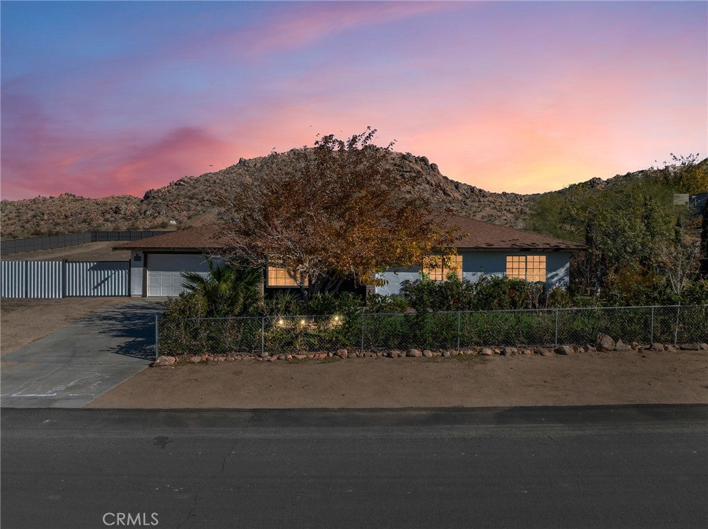 Welcome to this beautifully updated home located in a quiet neighborhood. Spacious living room with plenty of natural light coming in. Gas fireplace for those cold, winter nights. Kitchen features modern appliances, quartz countertops, and a spacious island with storage cabinets. New epoxy flooring. The landscaped front and backyard offers privacy bushes, artificial turf, two gazebos, desert scape, and multiple fruit trees (peach, pomegranate, cherry, pears, plum, apricot, and grapes). Sale of this home includes the adjacent parcel so you have over an acre of land. Corrugated metal fence for privacy. There are two sliding doors wide enough to fit your toys. With 360-degree mountain views, gorgeous sunsets, and access to hiking just steps from your backyard, this home is a true desert gem. Conveniently located near local attractions and recreational destinations.