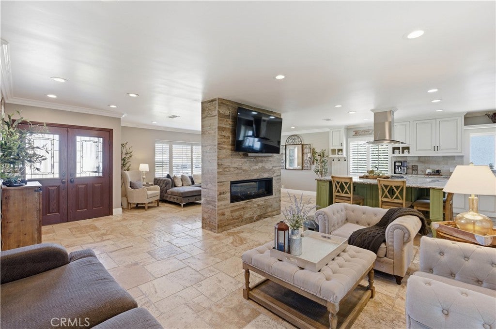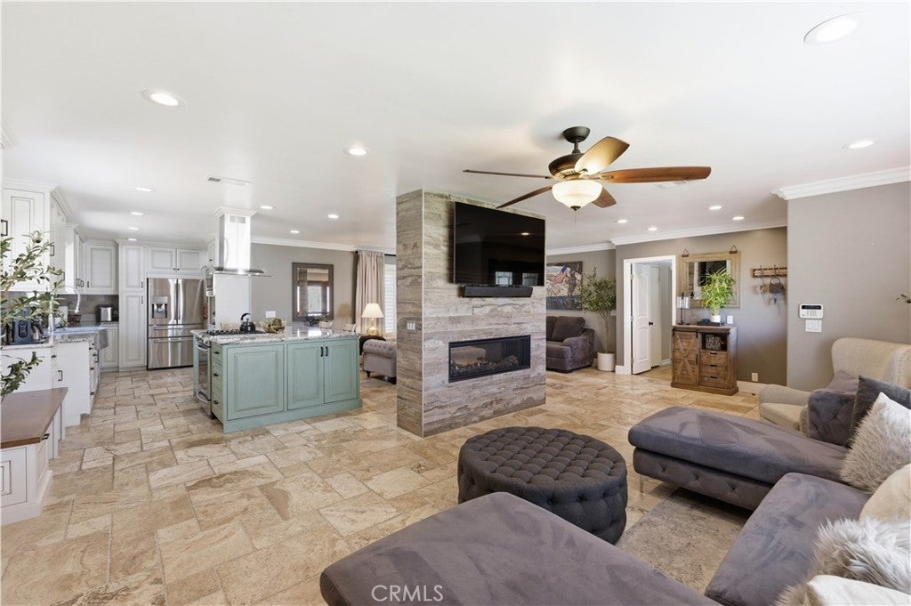 Welcome to this beautifully fully renovated 4 bedroom, 3 bathroom home offering 1,939 SqFt of thoughtfully upgraded living space on a spacious lot with RV access and modern energy-efficient features. From the moment you arrive, you’ll appreciate the pride of ownership showcased by the manicured landscaping, charming brick accents, and inviting curb appeal. Step inside to discover a completely renovated interior featuring stunning travertine flooring throughout, creating a warm yet sophisticated feel. The open-concept layout seamlessly connects the living, dining, and kitchen areas perfect for both everyday living and entertaining. A striking see-through fireplace serves as a centerpiece, elegantly dividing the living spaces while adding architectural charm and ambiance. The upgraded kitchen offers abundant cabinetry, stainless steel appliances, and a spacious island ideal for gatherings. Step outside to your private backyard retreat featuring lush grass, mature landscaping, a covered patio, and a tranquil fountain perfect for relaxing evenings or hosting guests. The expansive lot provides RV parking access and includes 220V connections ready for electric vehicle charging, offering convenience for today’s modern lifestyle.